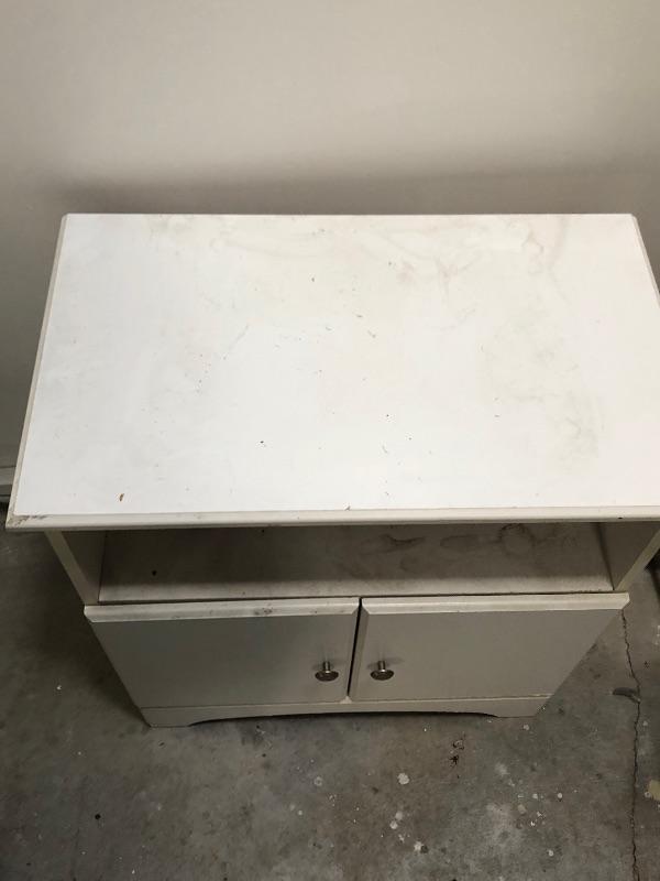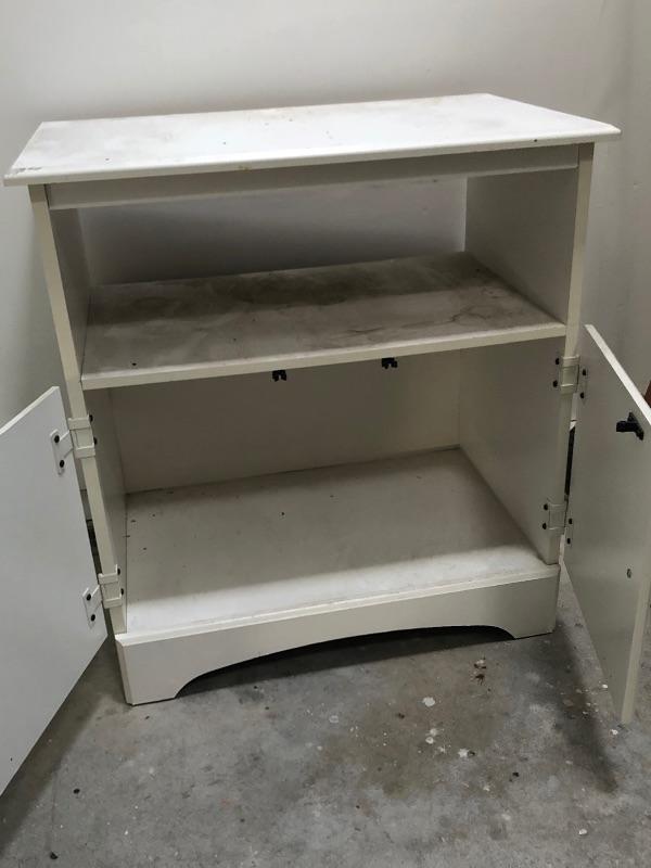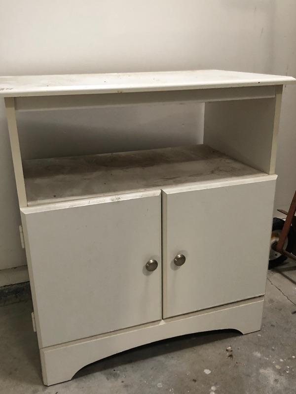 Small white laminate cabinat. Great as a small TV stand. In fair condition, has been in a garage, needs to be cleaned.