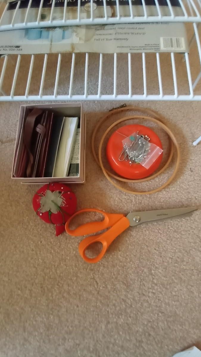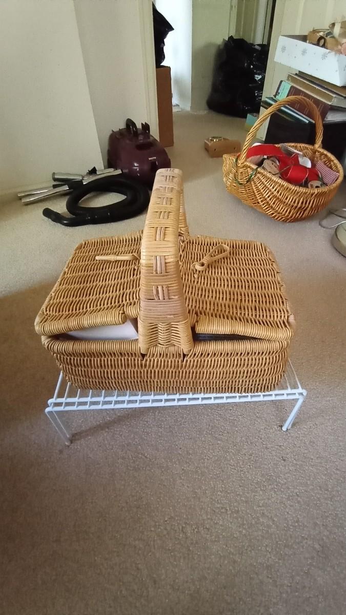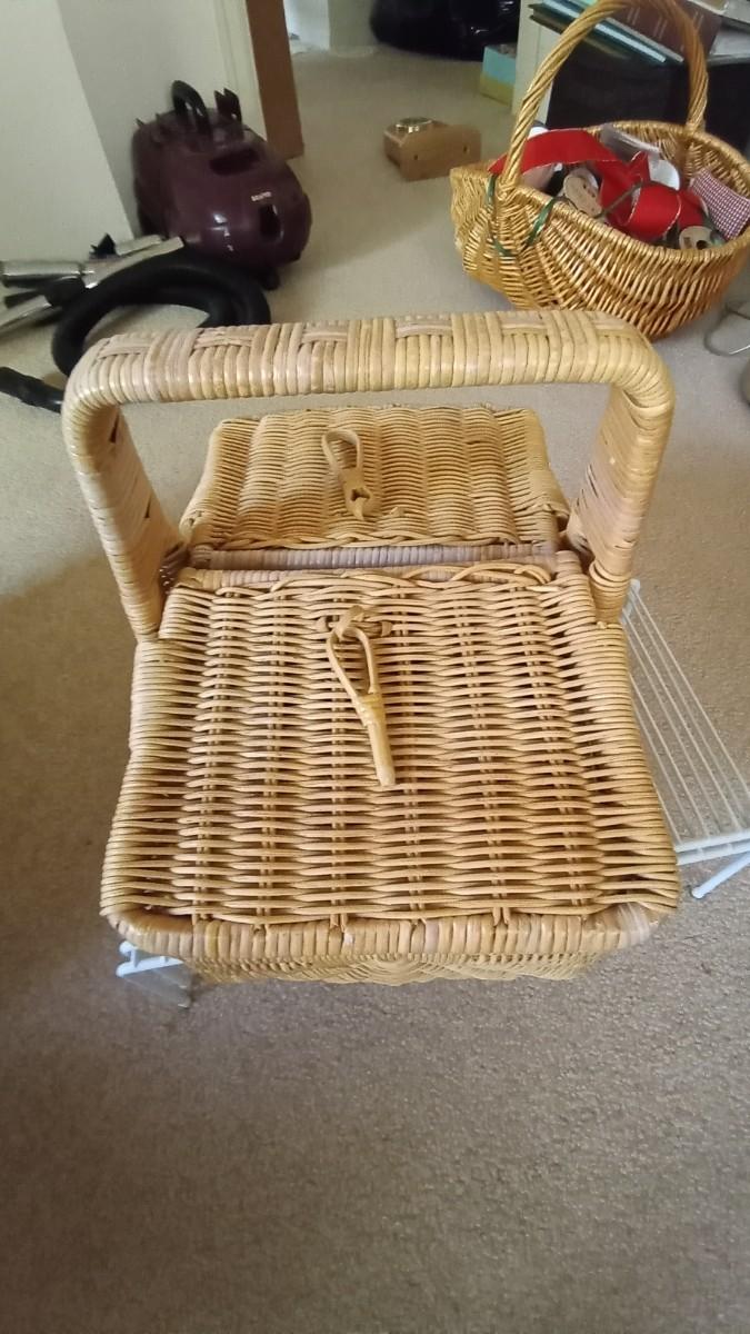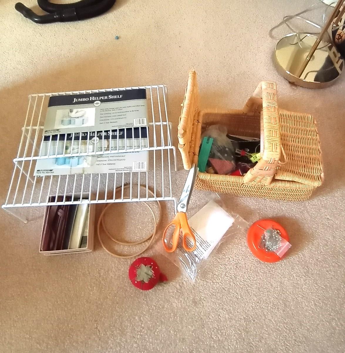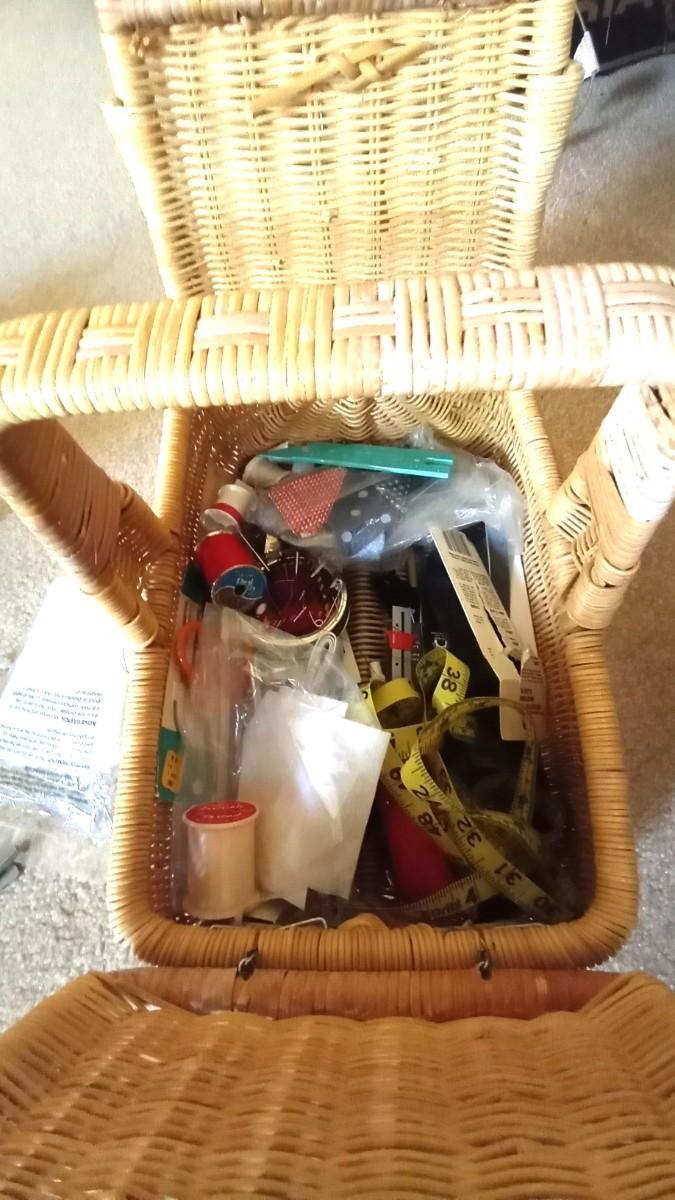 SMALL WICKER BASKET WITH SEWING ITEMS And TWO WIRE LIFTS