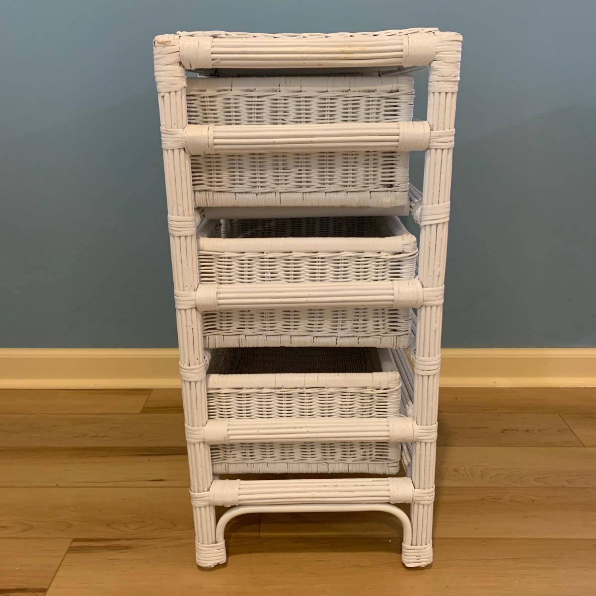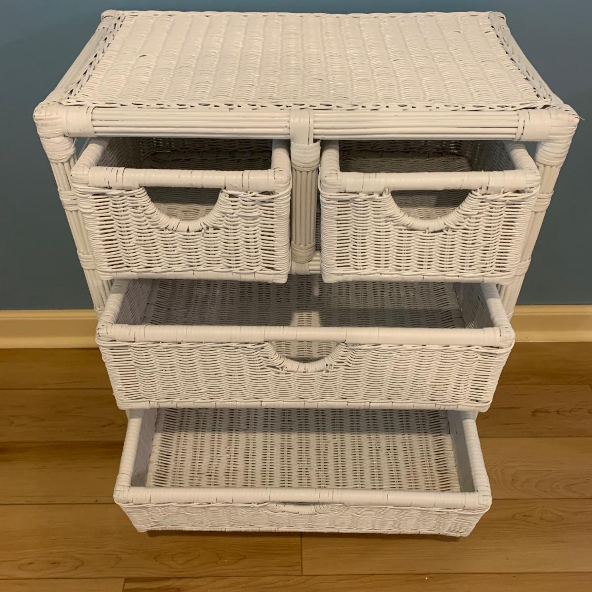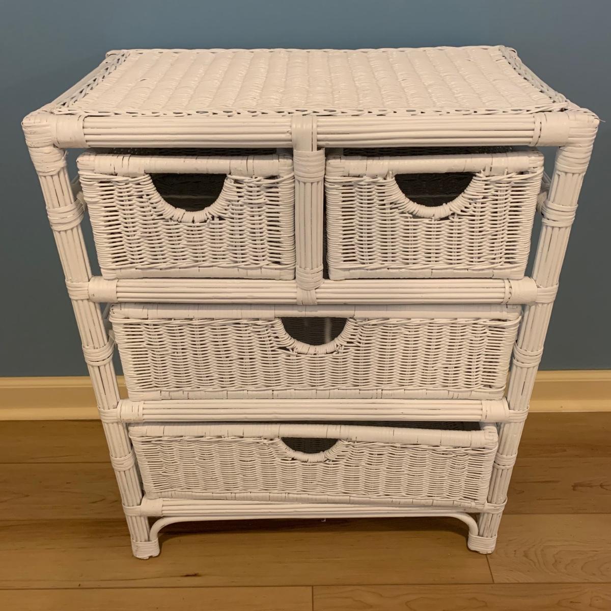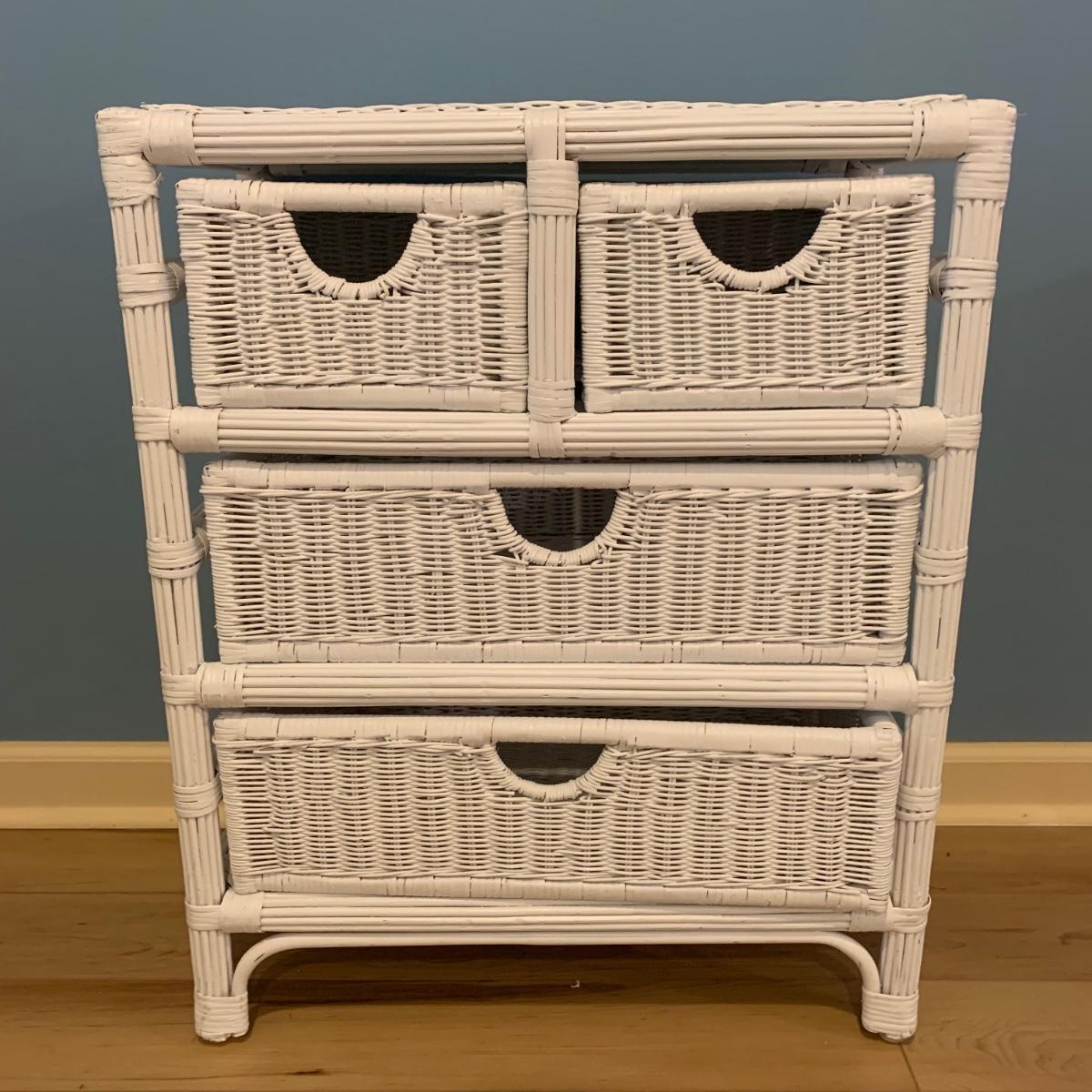 Small wicker chest of four drawers. Item is painted white and is in used condition. It does have a small blemish, see photos for more details. Item measures approximately 22.5” x 13” x 28”H. Local pickup only.