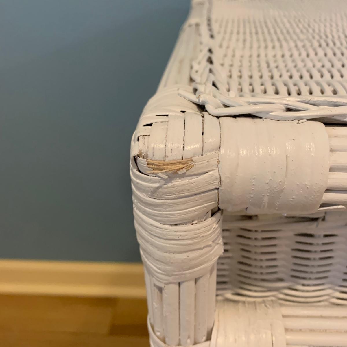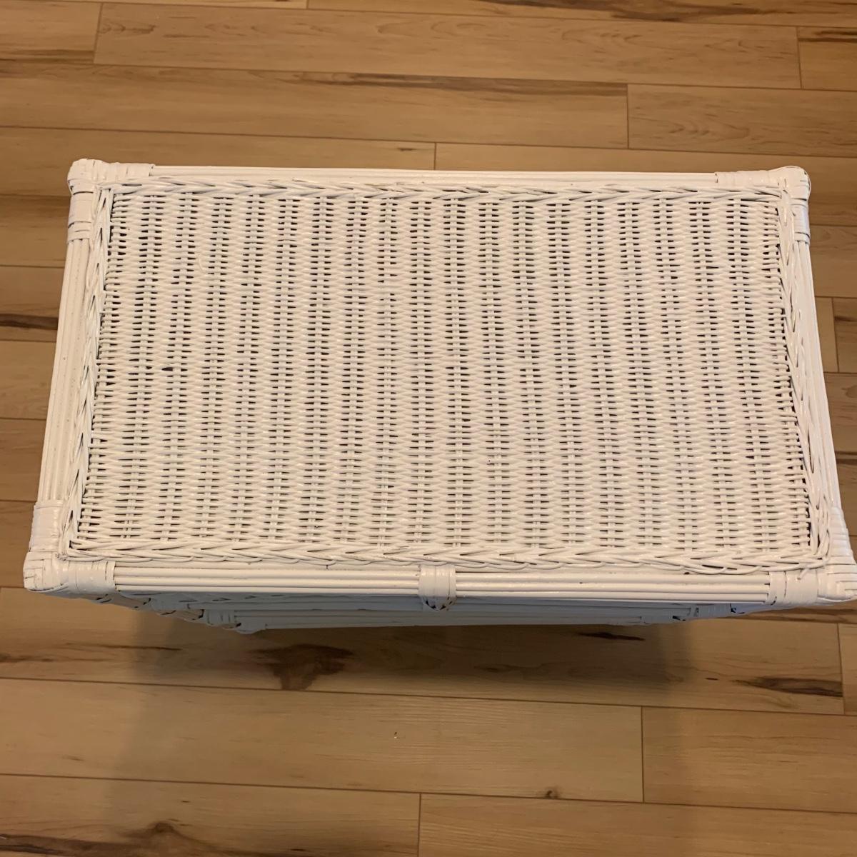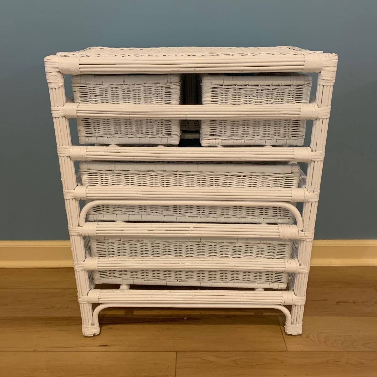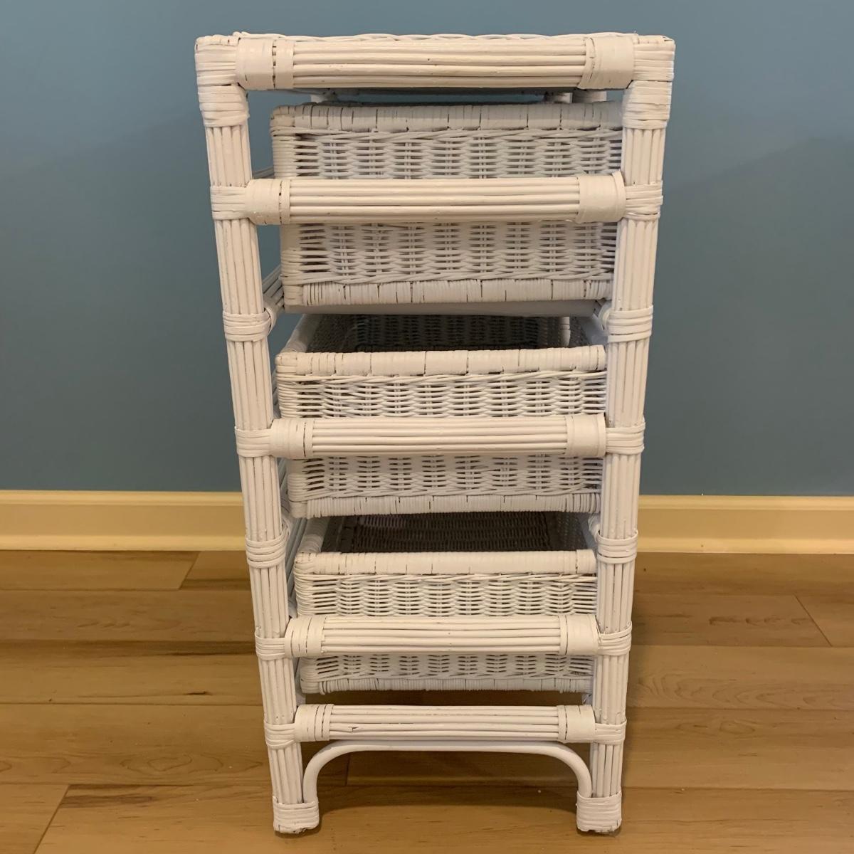 Small wicker chest of four drawers. Item is painted white and is in used condition. It does have a small blemish, see photos for more details. Item measures approximately 22.5” x 13” x 28”H. Local pickup only.