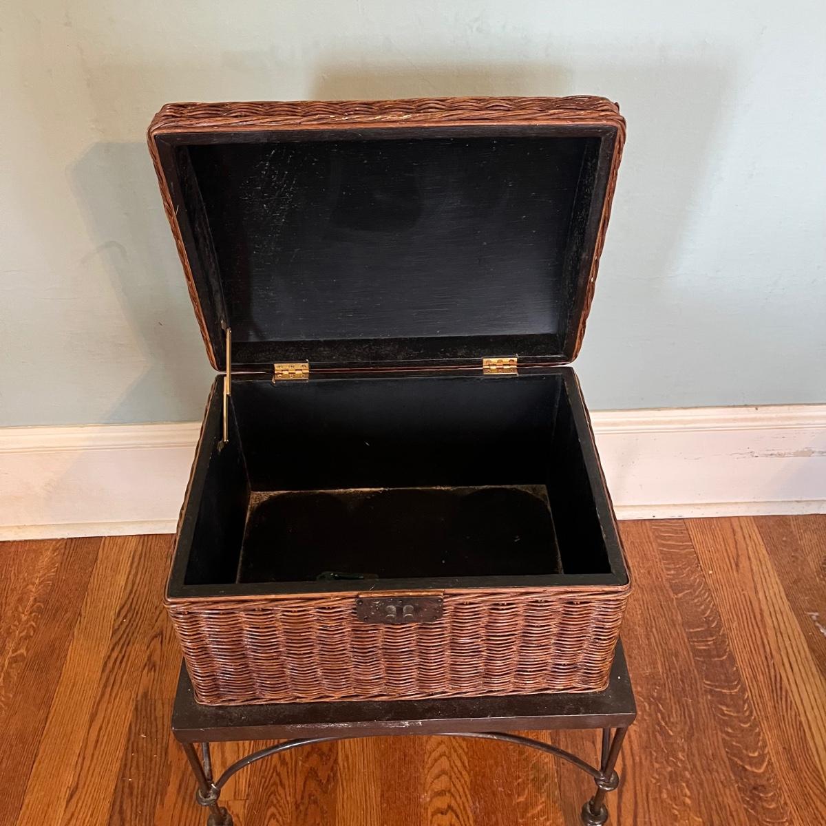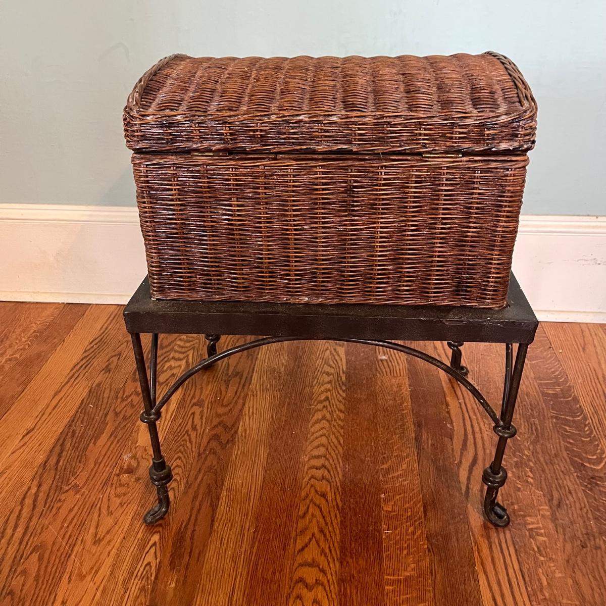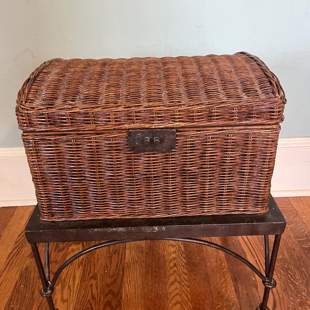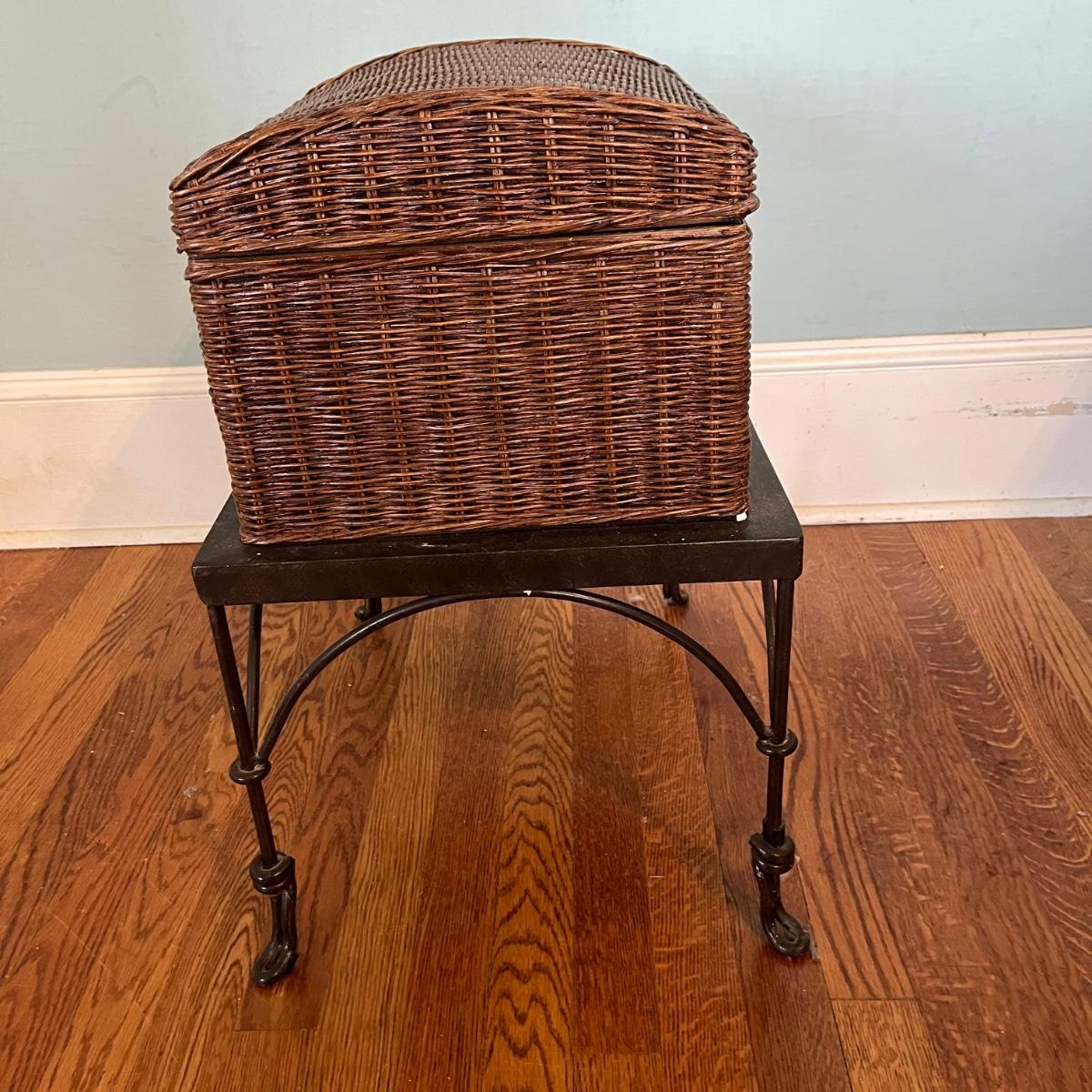 Small wicker trunk sits in a fitted metal base. Trunk and base are separate pieces but are fitted to sit together. They could be used separately as well. Overall measurement is 18” x 16” x 22”H. Trunk is 16” x 12” x 10.5”H. Some signs of wear. The top latch needs to be reattached to the lid. Local pickup only.