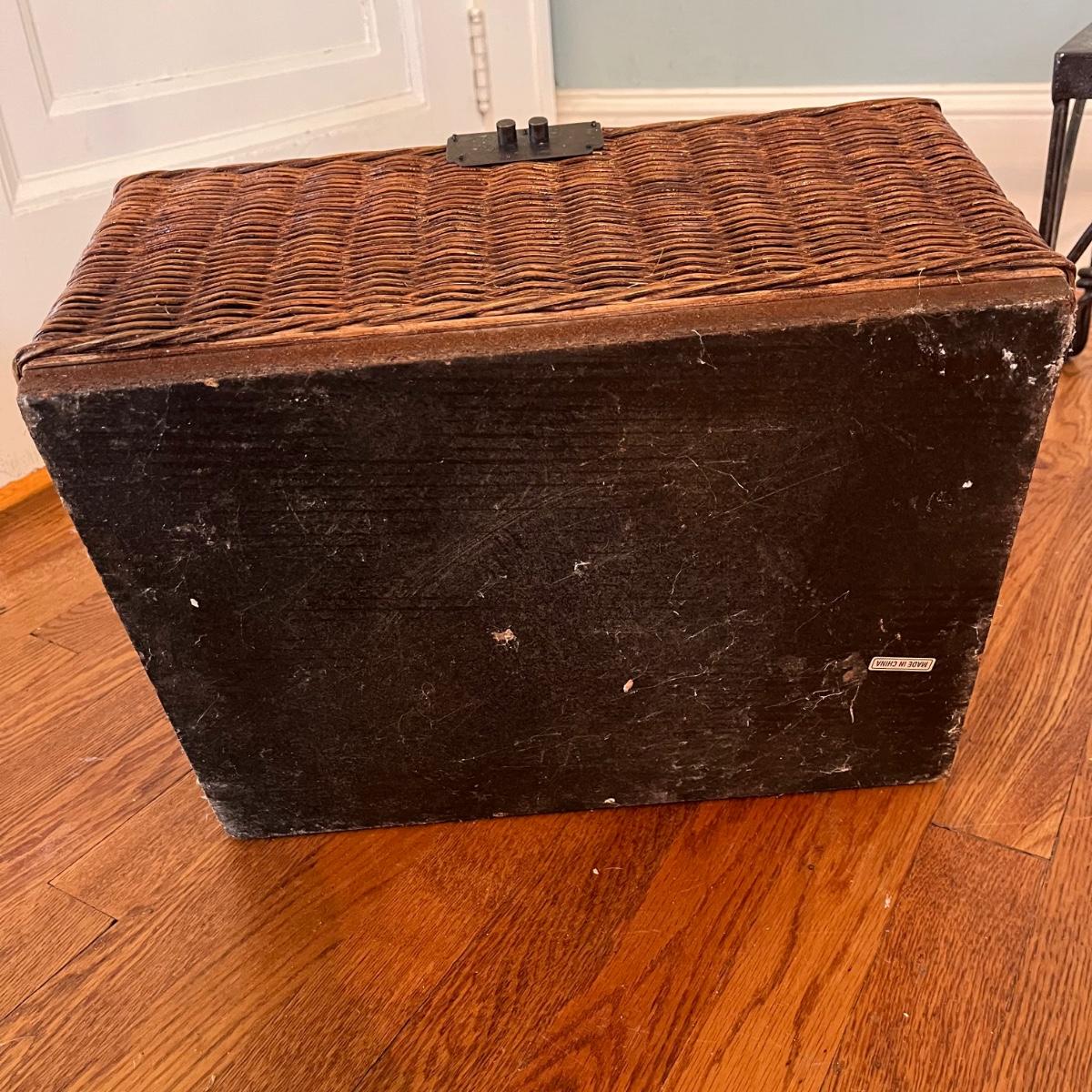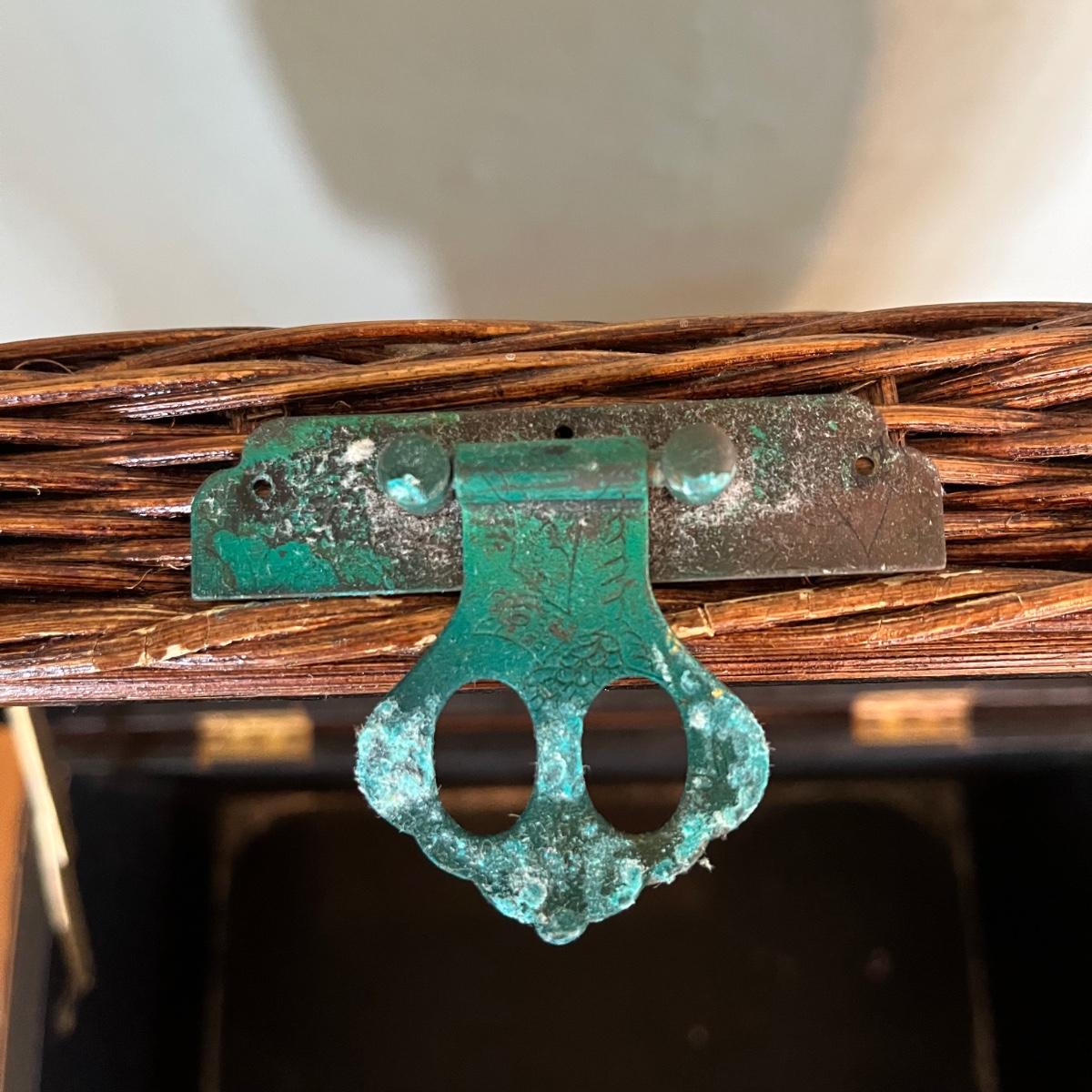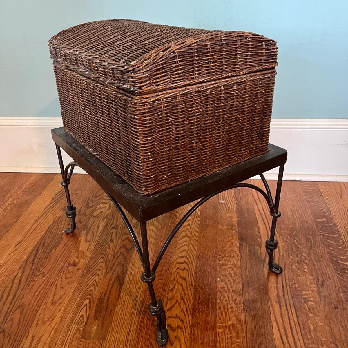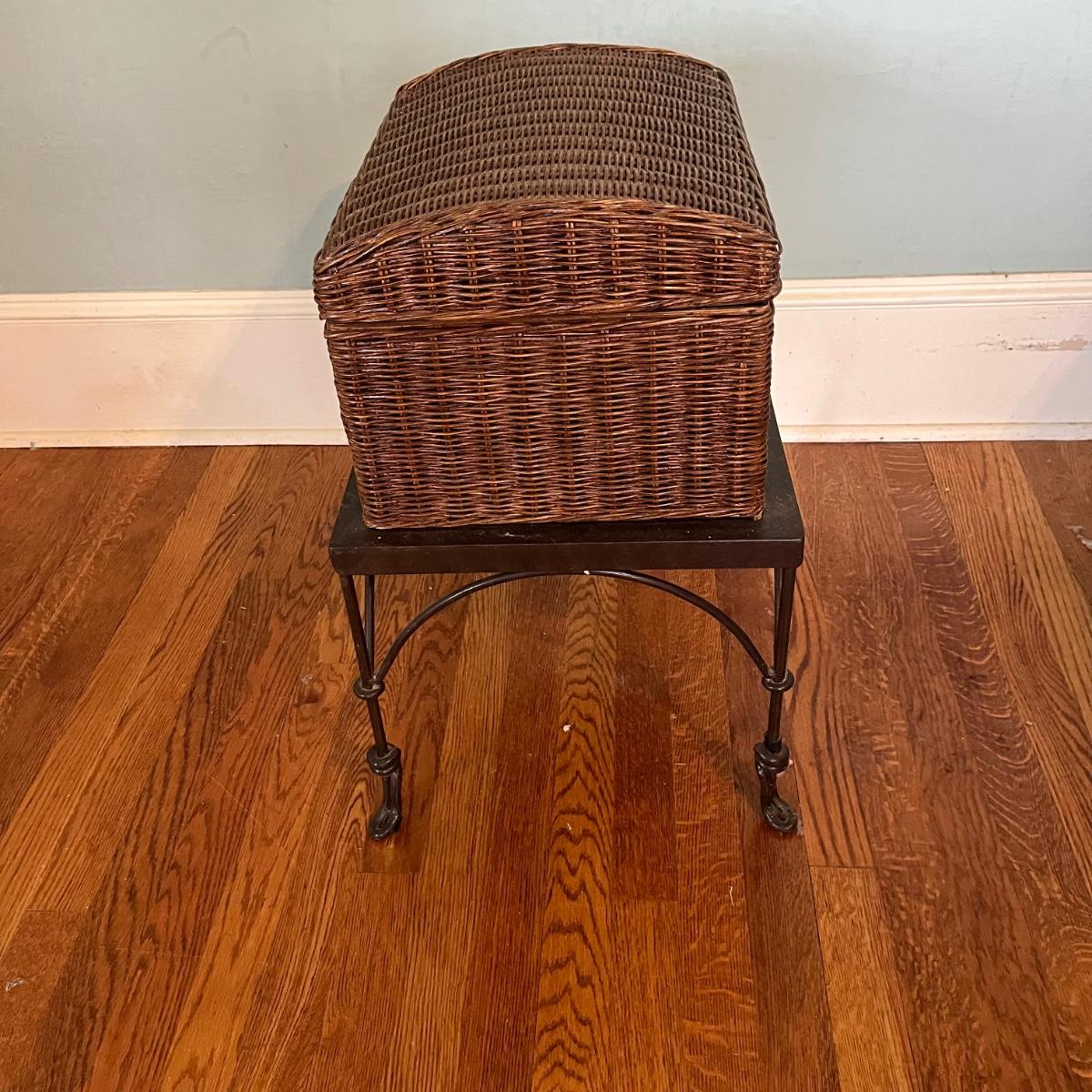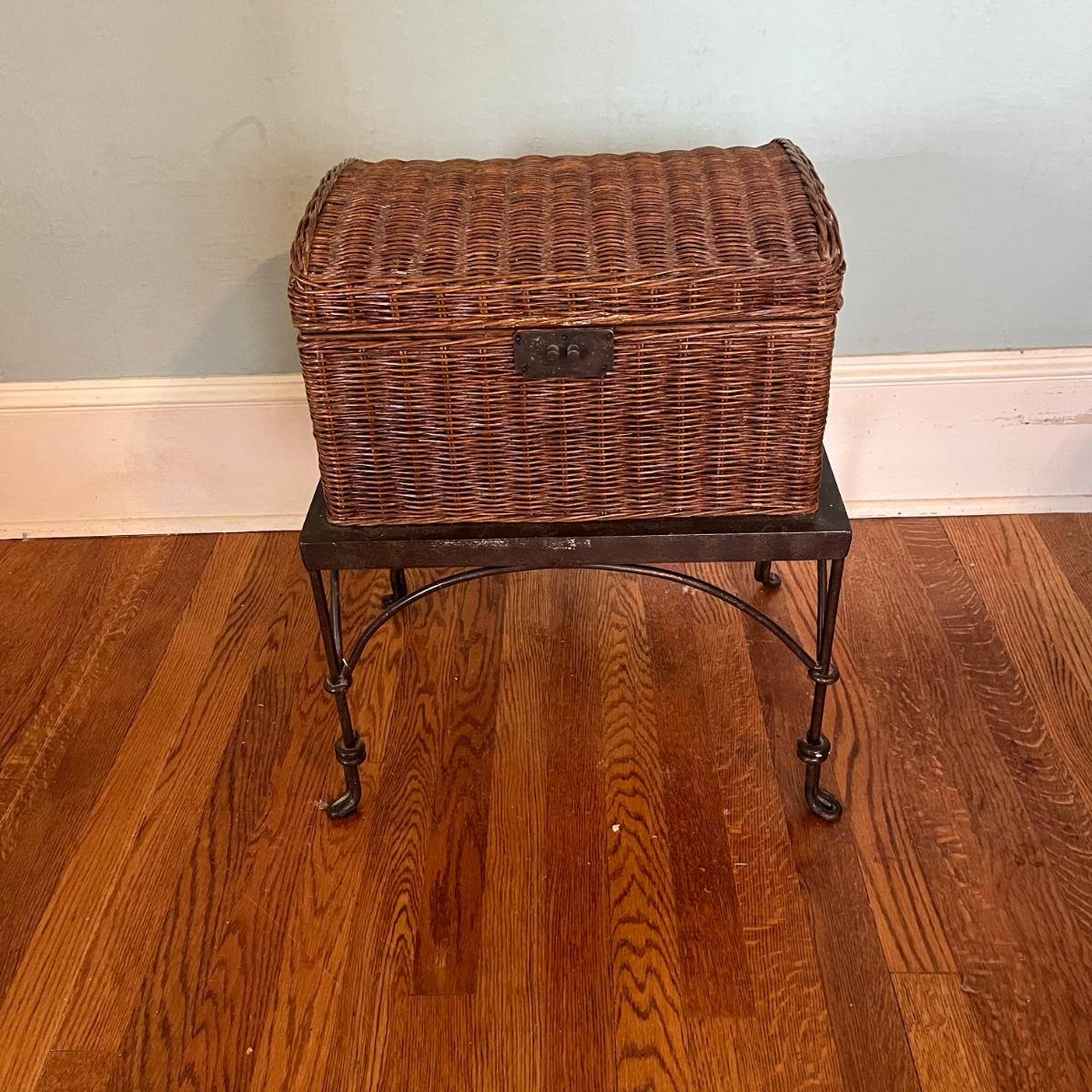 Small wicker trunk sits in a fitted metal base. Trunk and base are separate pieces but are fitted to sit together. They could be used separately as well. Overall measurement is 18” x 16” x 22”H. Trunk is 16” x 12” x 10.5”H. Some signs of wear. The top latch needs to be reattached to the lid. Local pickup only.