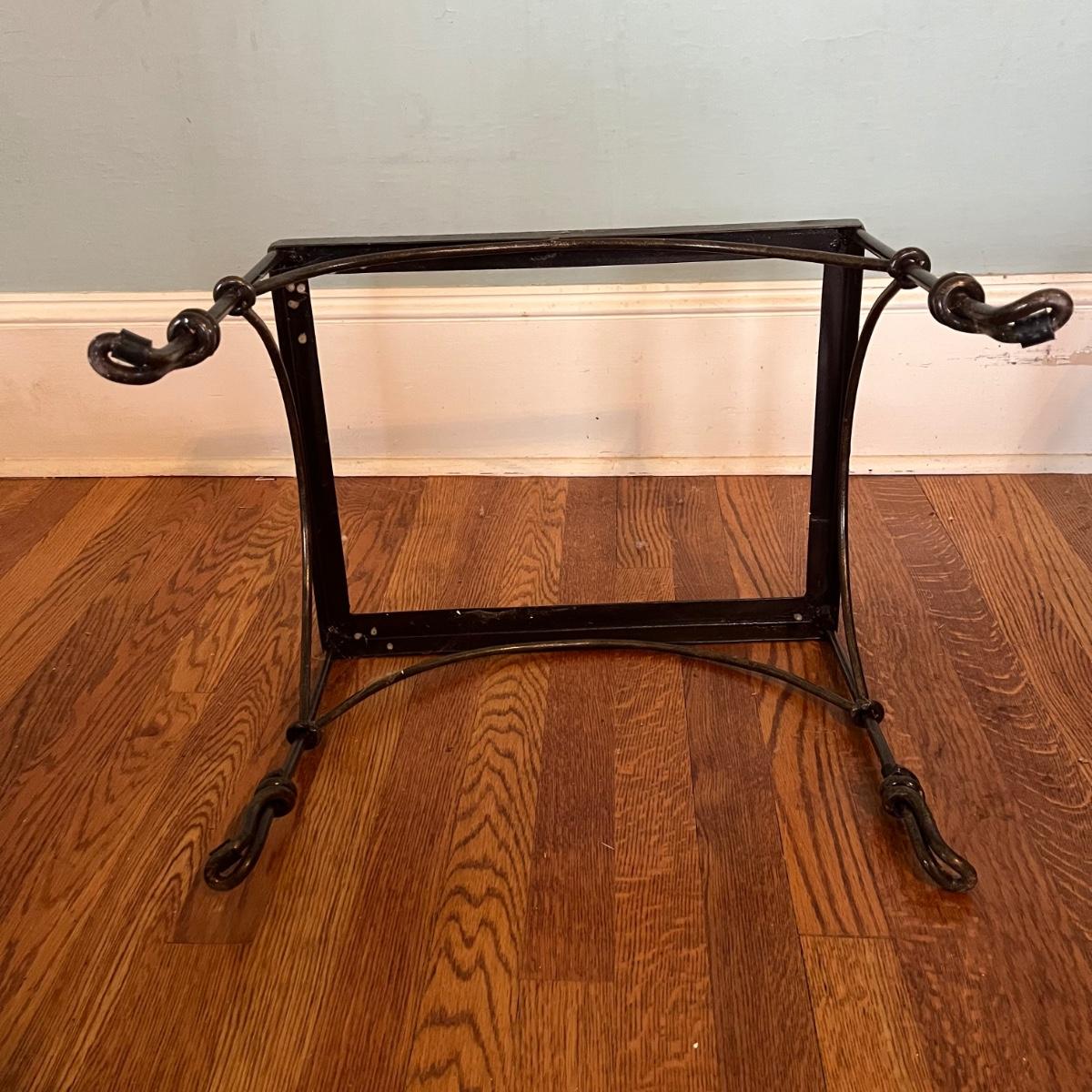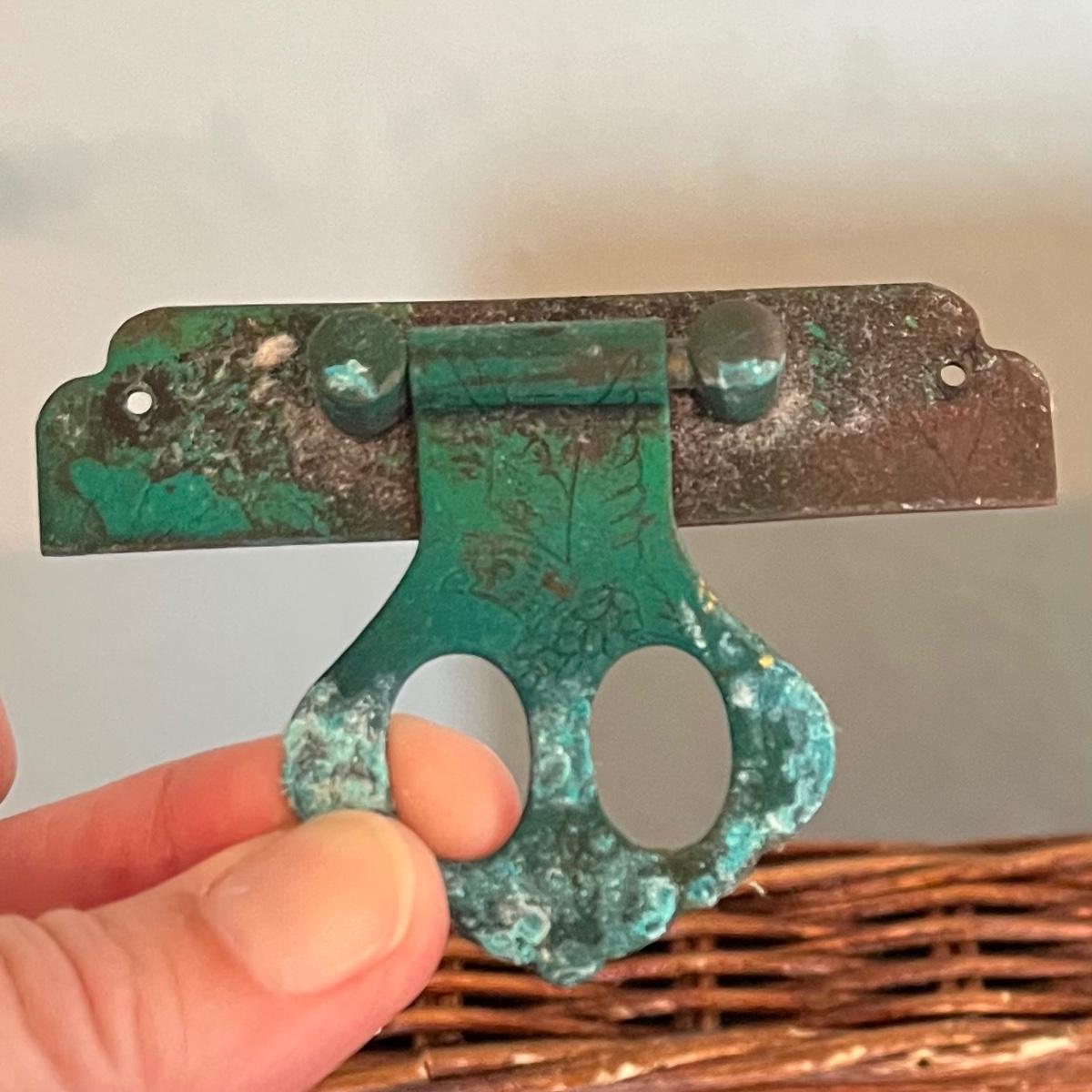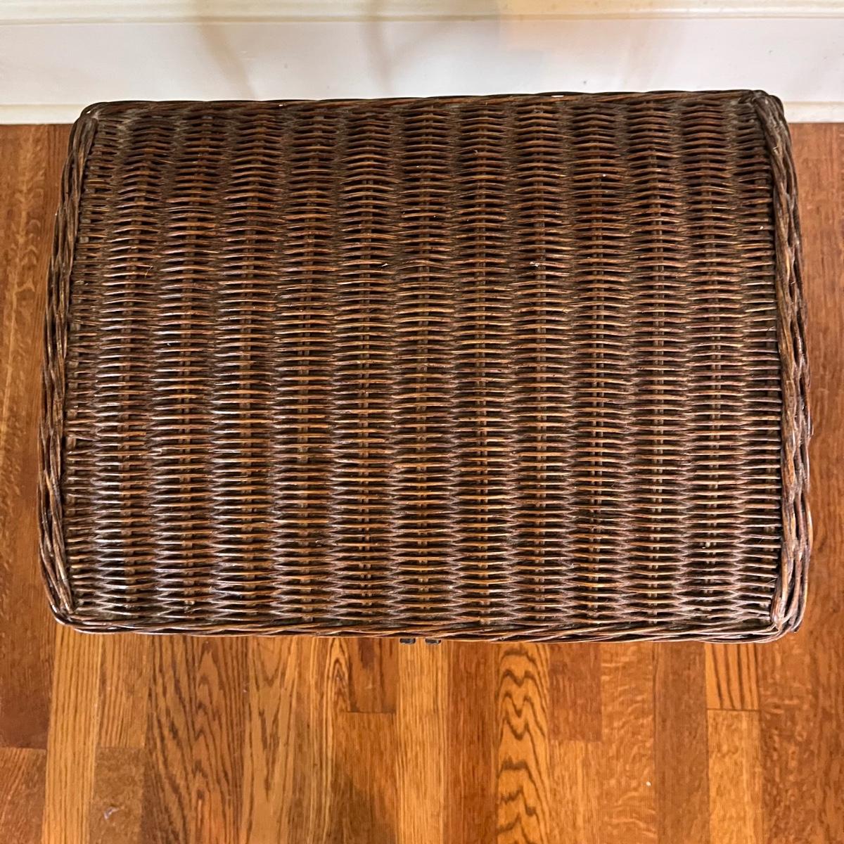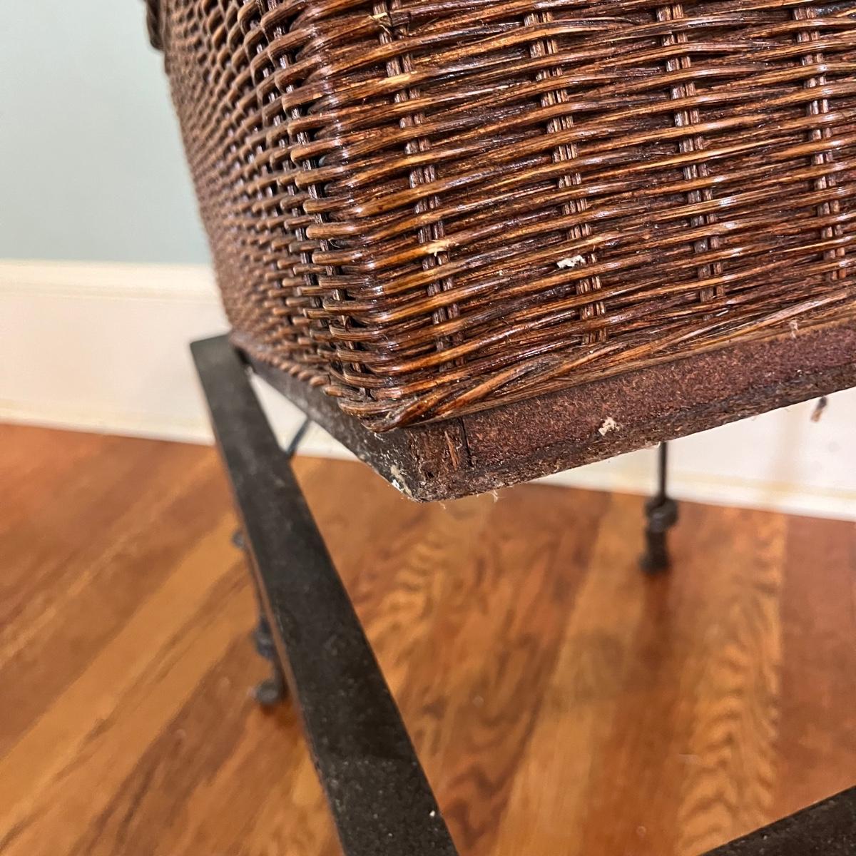 Small wicker trunk sits in a fitted metal base. Trunk and base are separate pieces but are fitted to sit together. They could be used separately as well. Overall measurement is 18” x 16” x 22”H. Trunk is 16” x 12” x 10.5”H. Some signs of wear. The top latch needs to be reattached to the lid. Local pickup only.