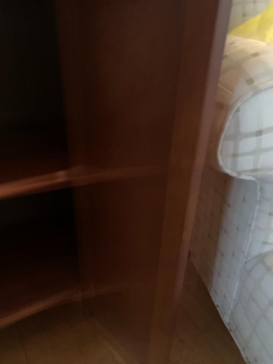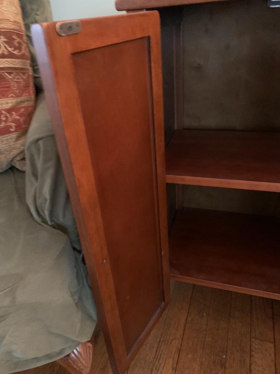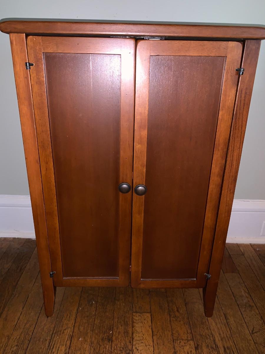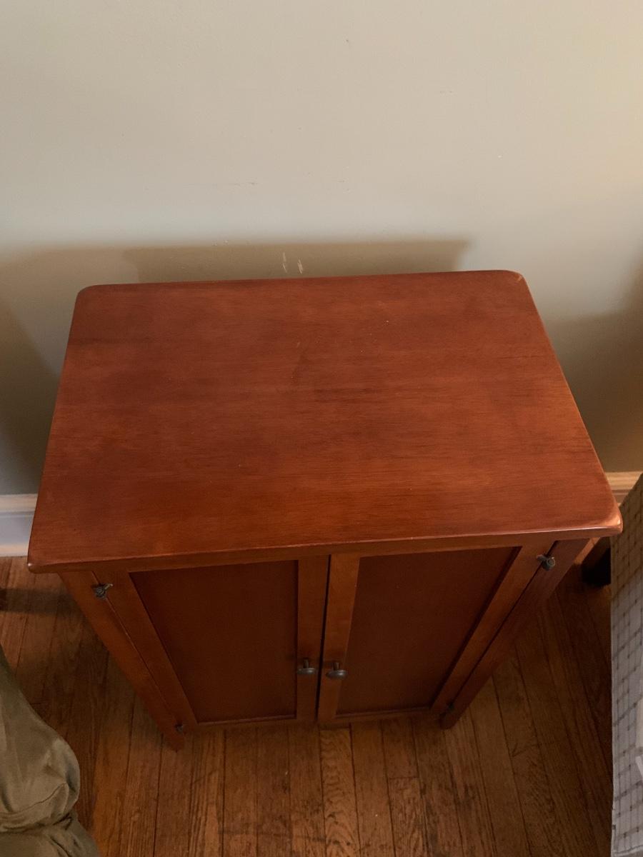 Small wood cabinet with 2 doors and 1 shelf.