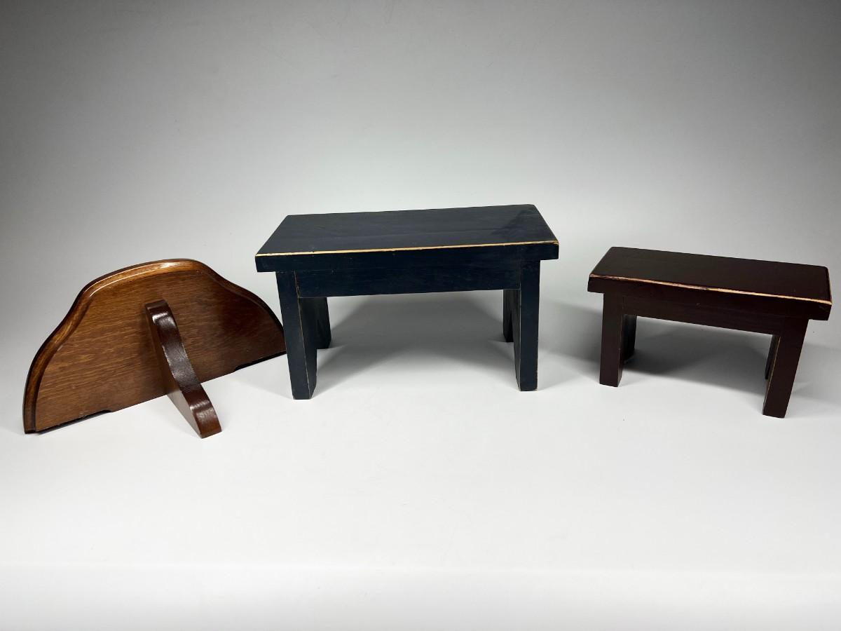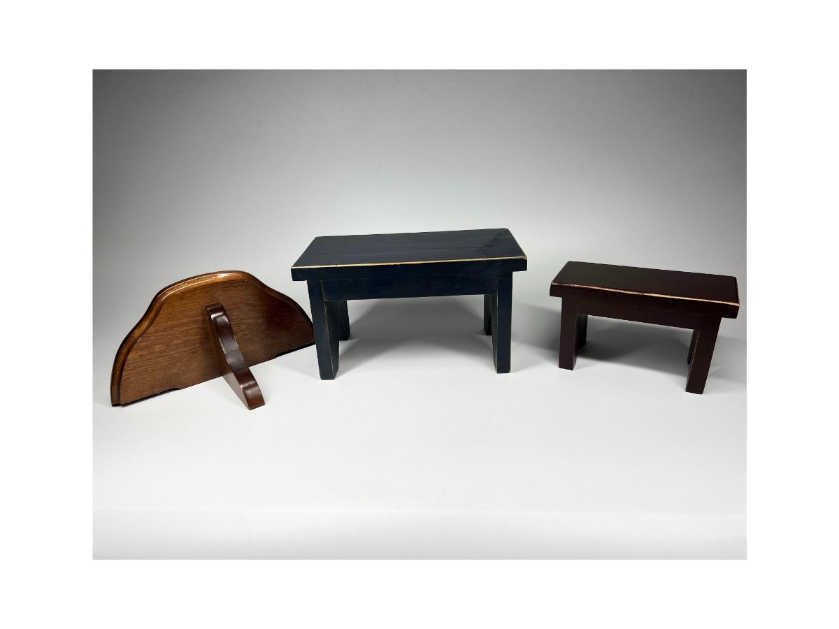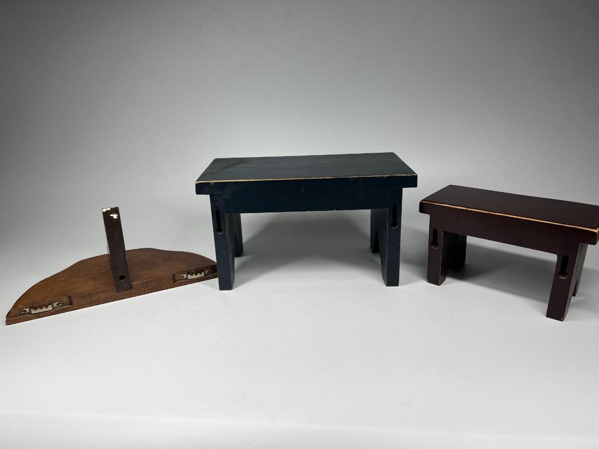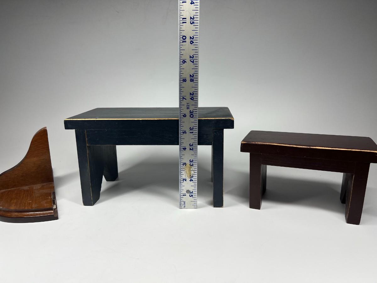 Small Wood Display Benches and Shelf. Good condition. The small benches are worn for a rustic look.