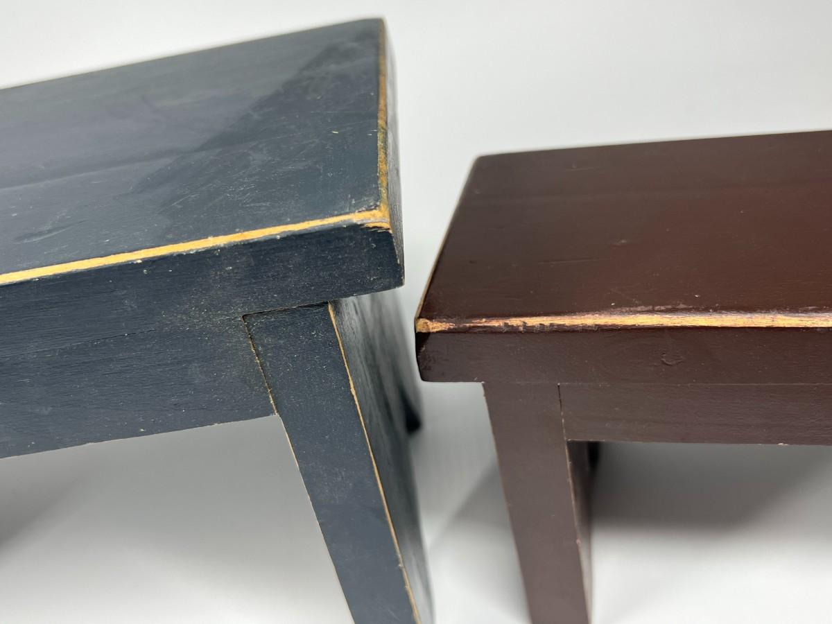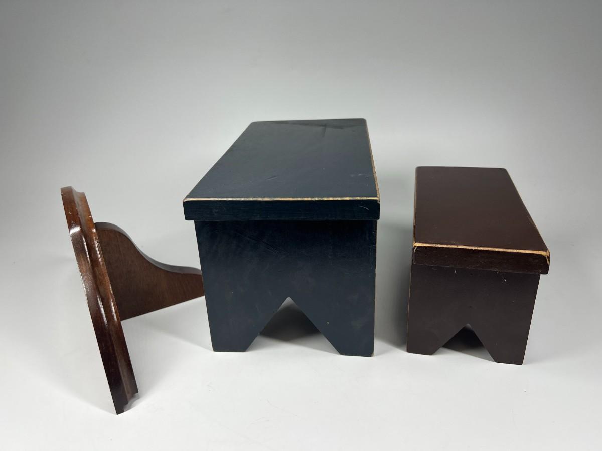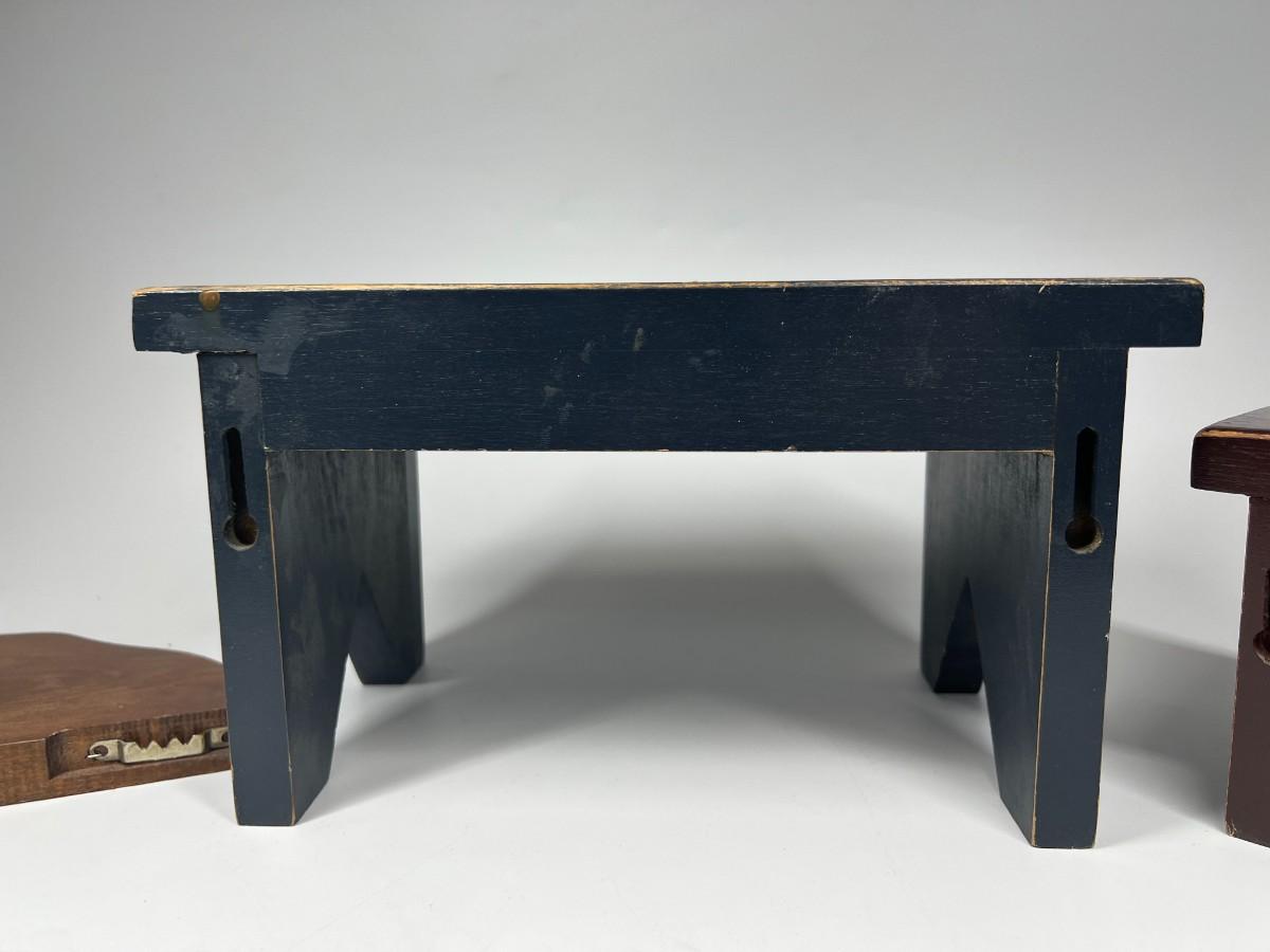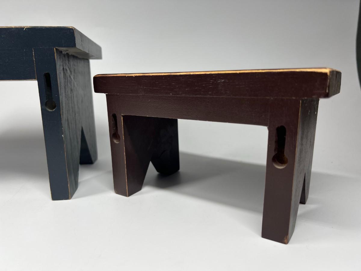 Small Wood Display Benches and Shelf. Good condition. The small benches are worn for a rustic look.