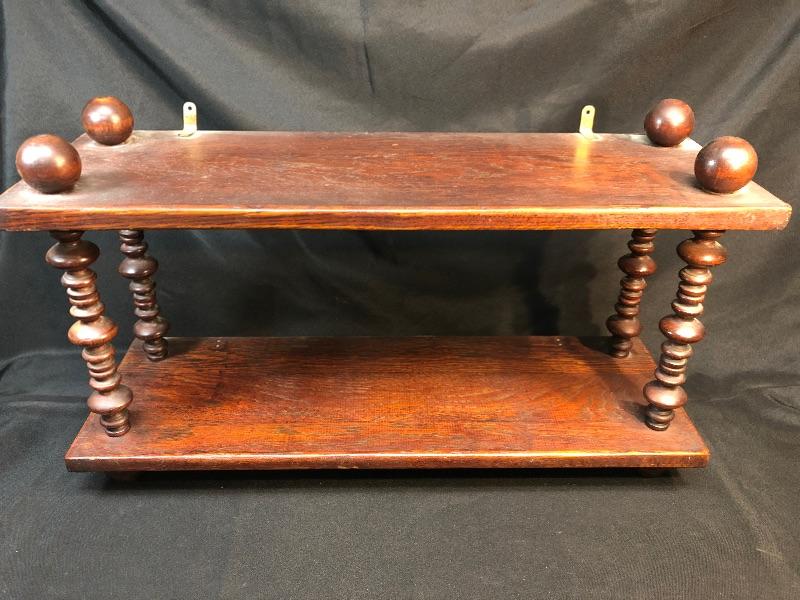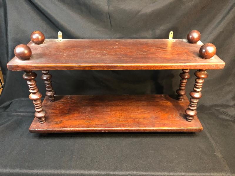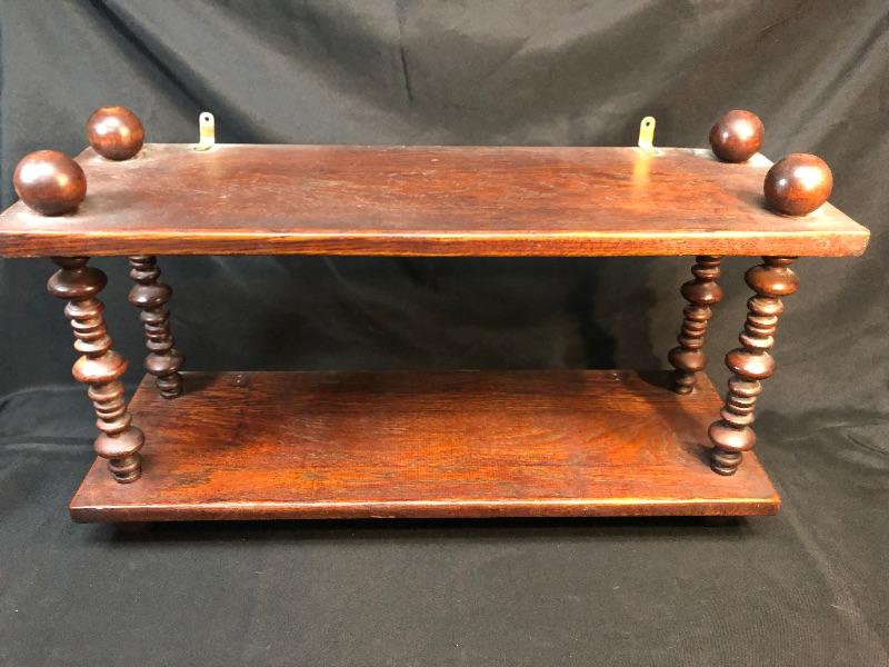 Small wood double shelf. Has brackets for wall hanging but could sit on a surface if desires. Use as is or paint to match any decor. Not very big, about 18" wide.