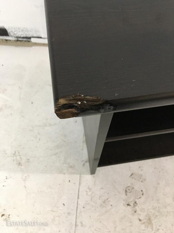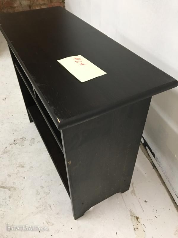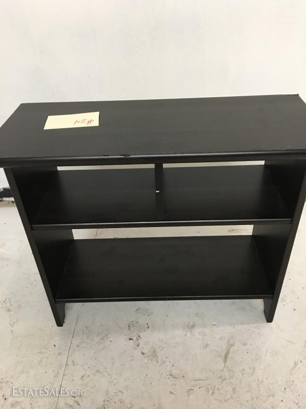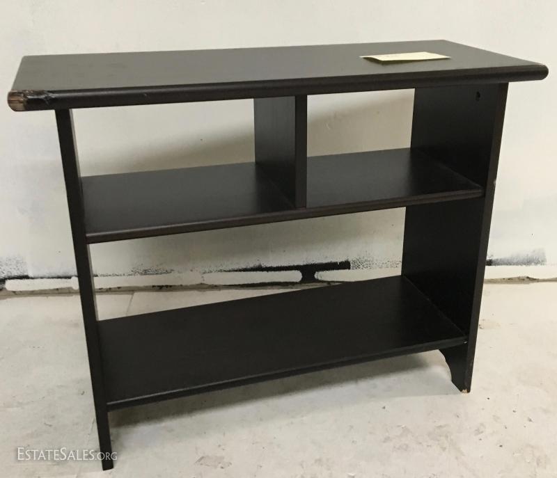 Shelf is dark stained pine measures 24" tall, 30" wide and 12" deep. One corner has some damage.
