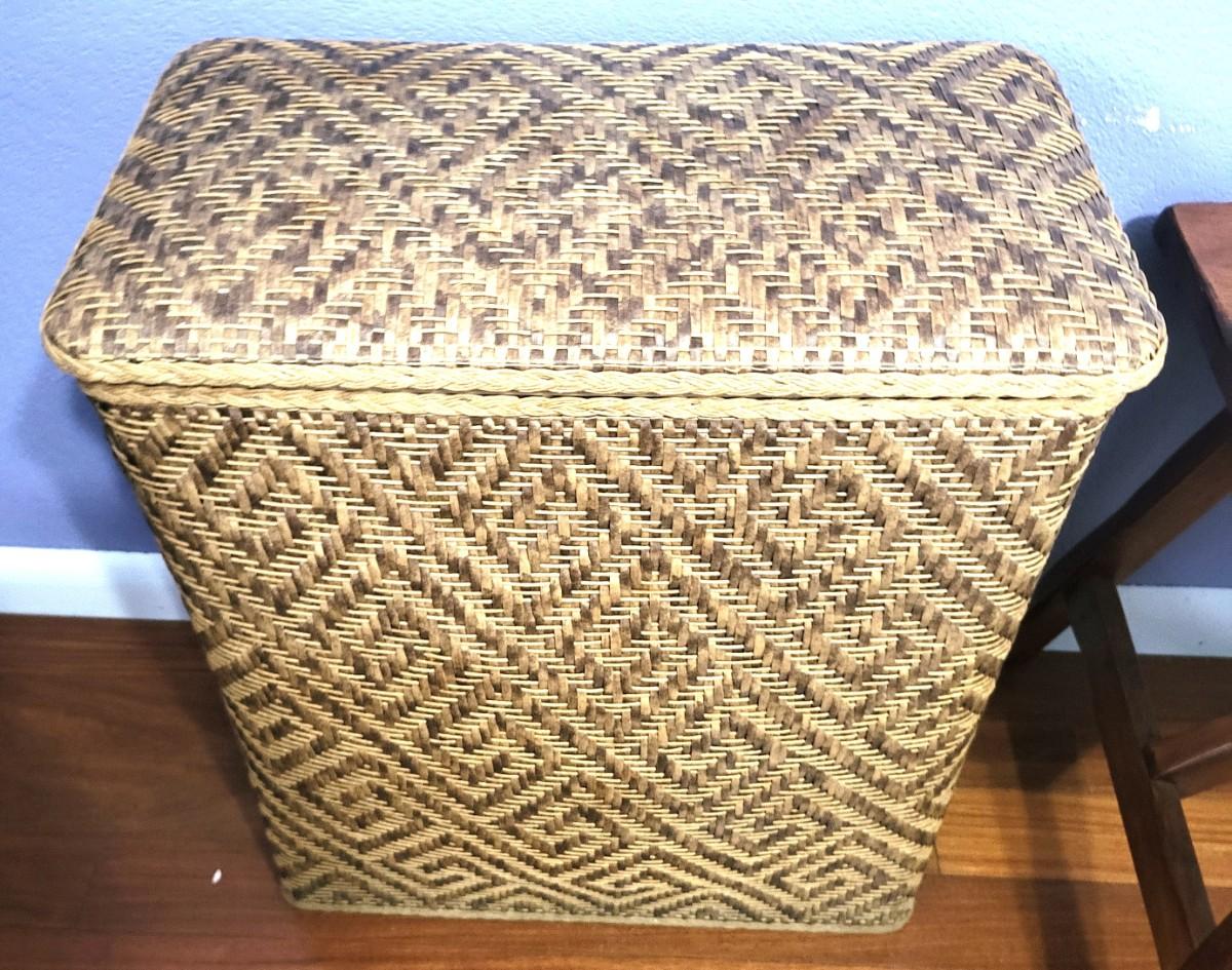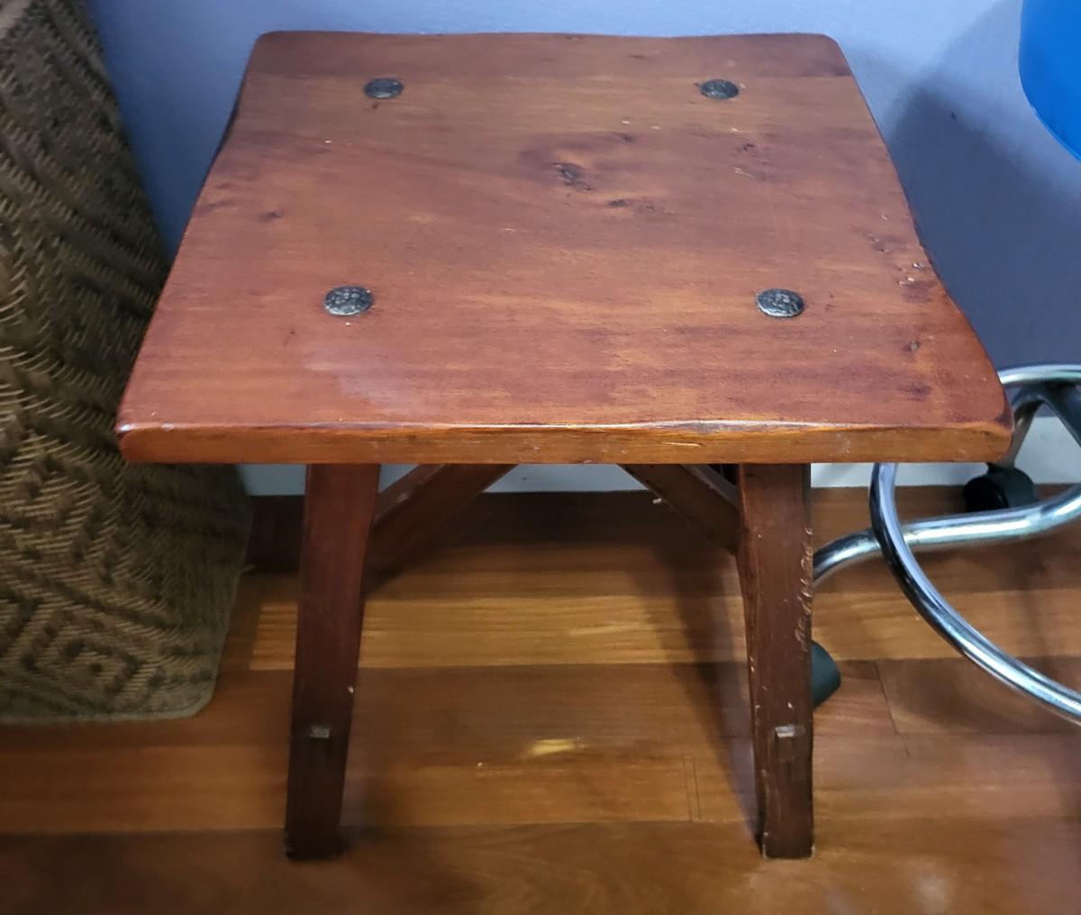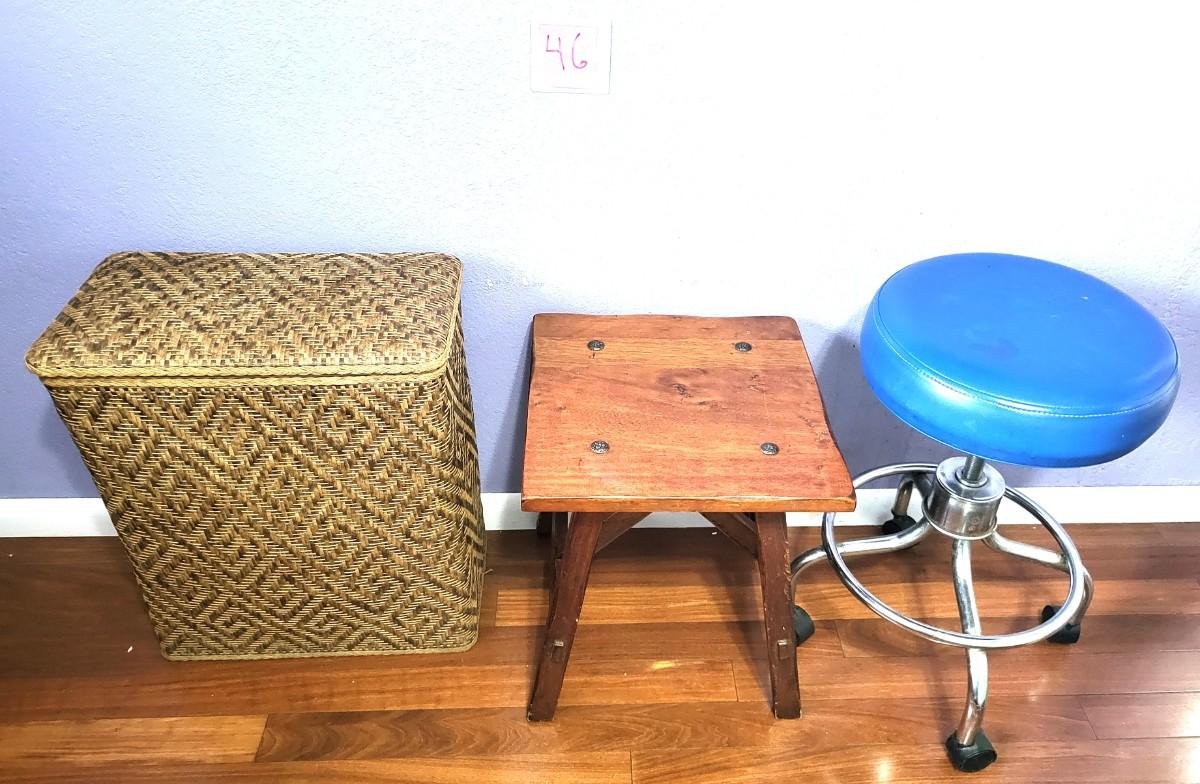 Small Wood Table with Wicker Woven Landry Hamper and Winco Exam Stool
