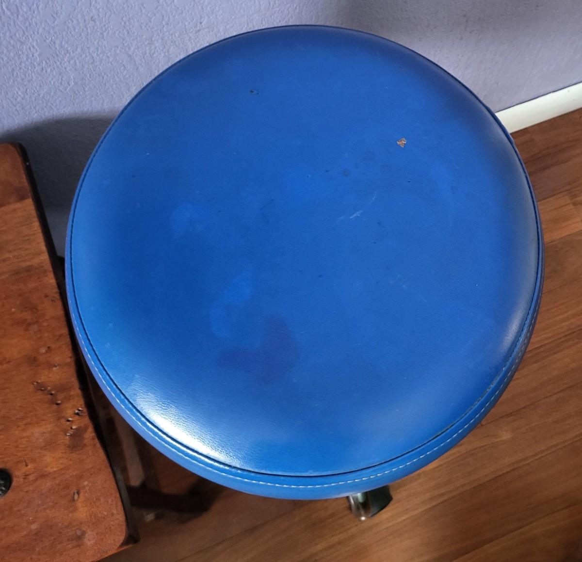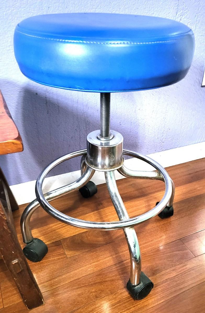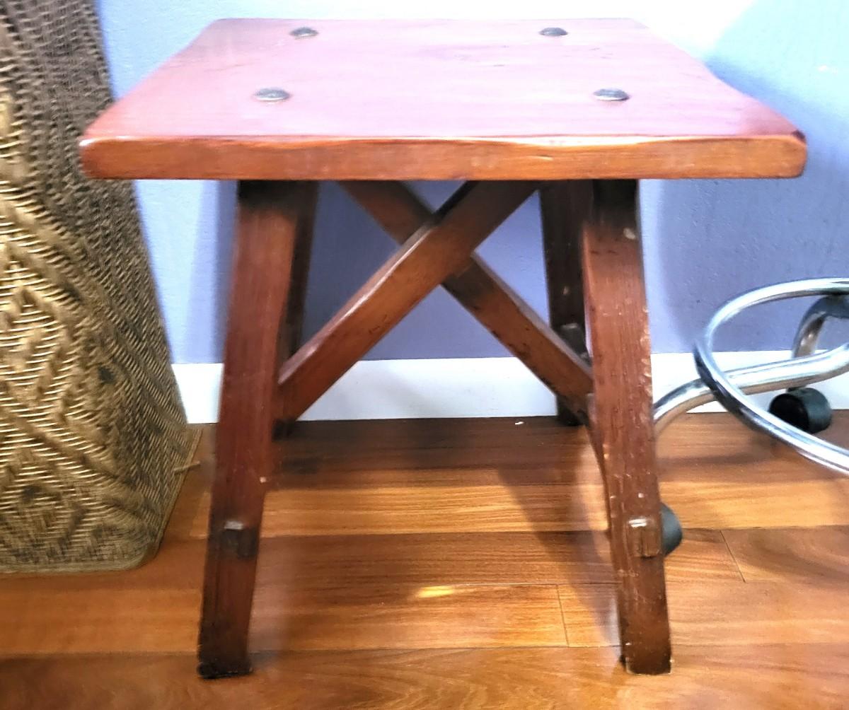 Small Wood Table with Wicker Woven Landry Hamper and Winco Exam Stool