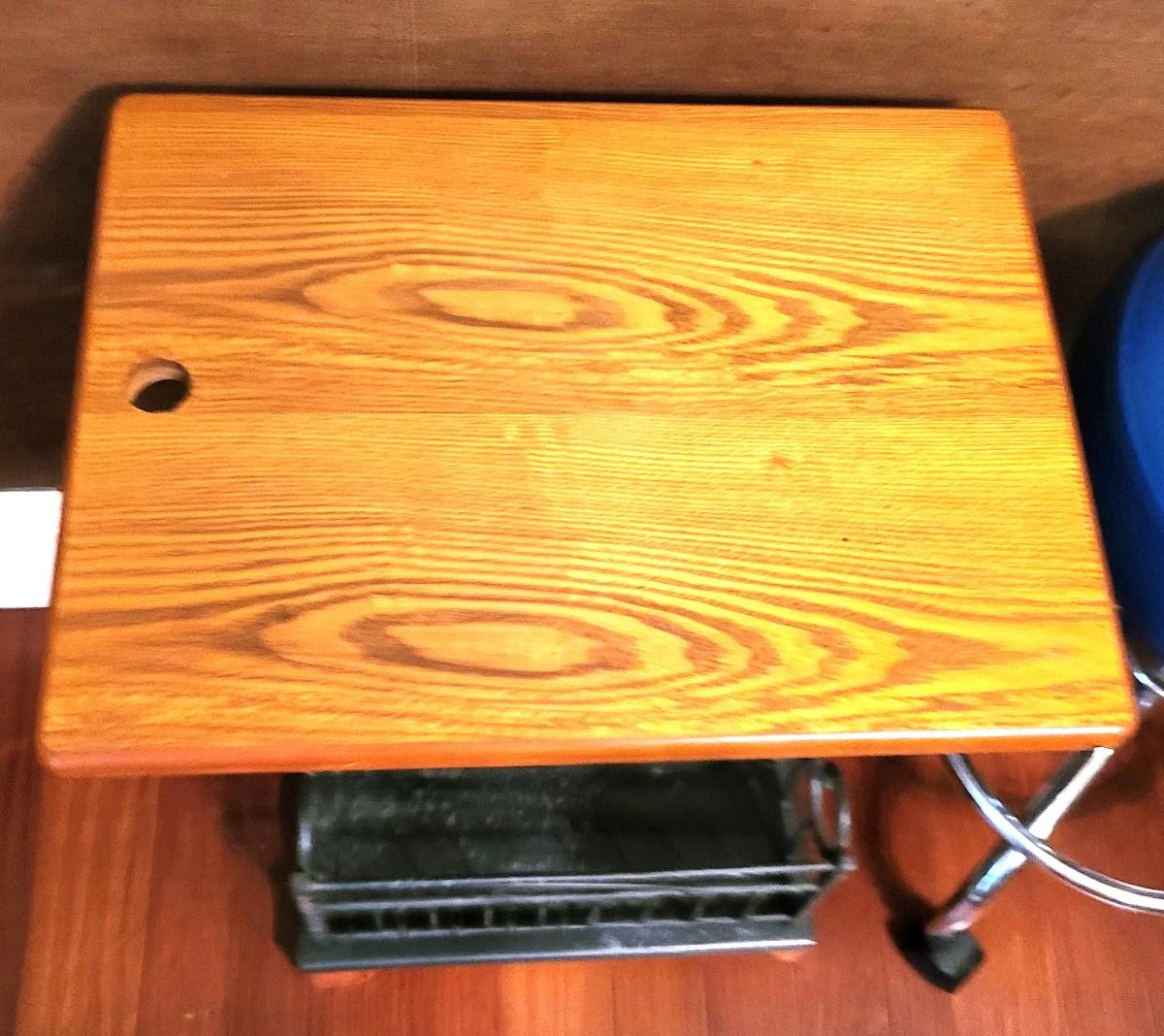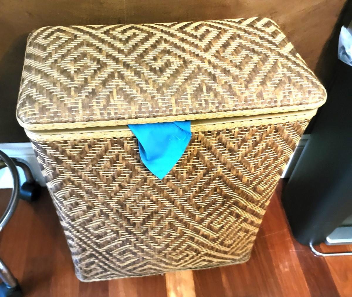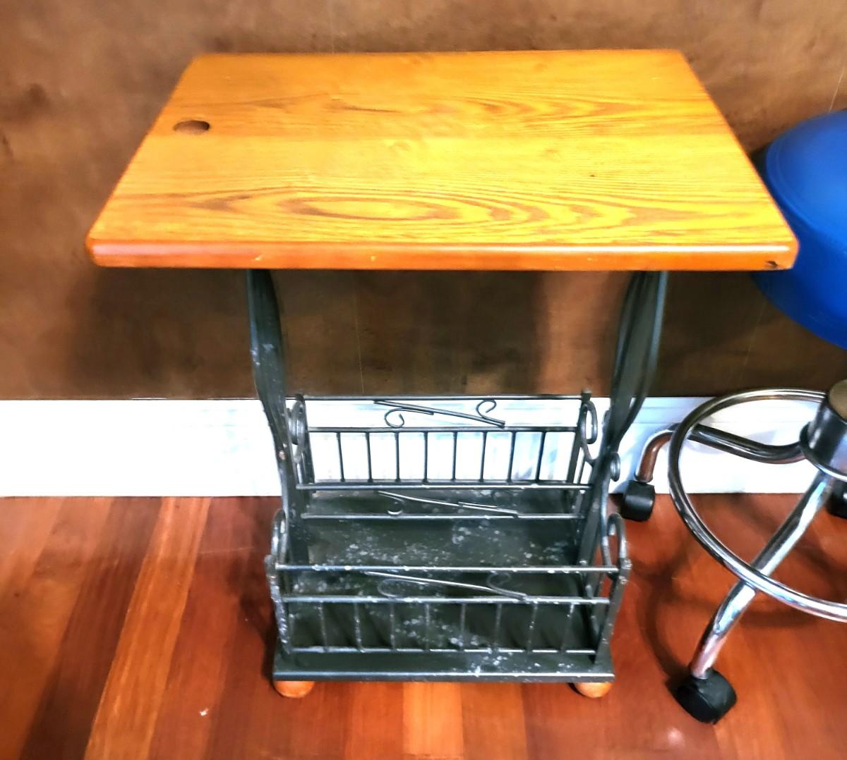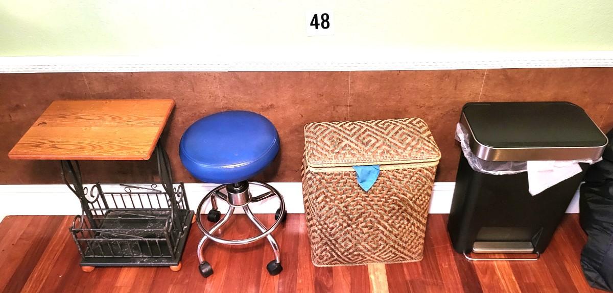 Small Wood Table with Magazine Rack, and Wicker Woven Landry Hamper and Winco Exam Stool and Simplehuman Waste Can