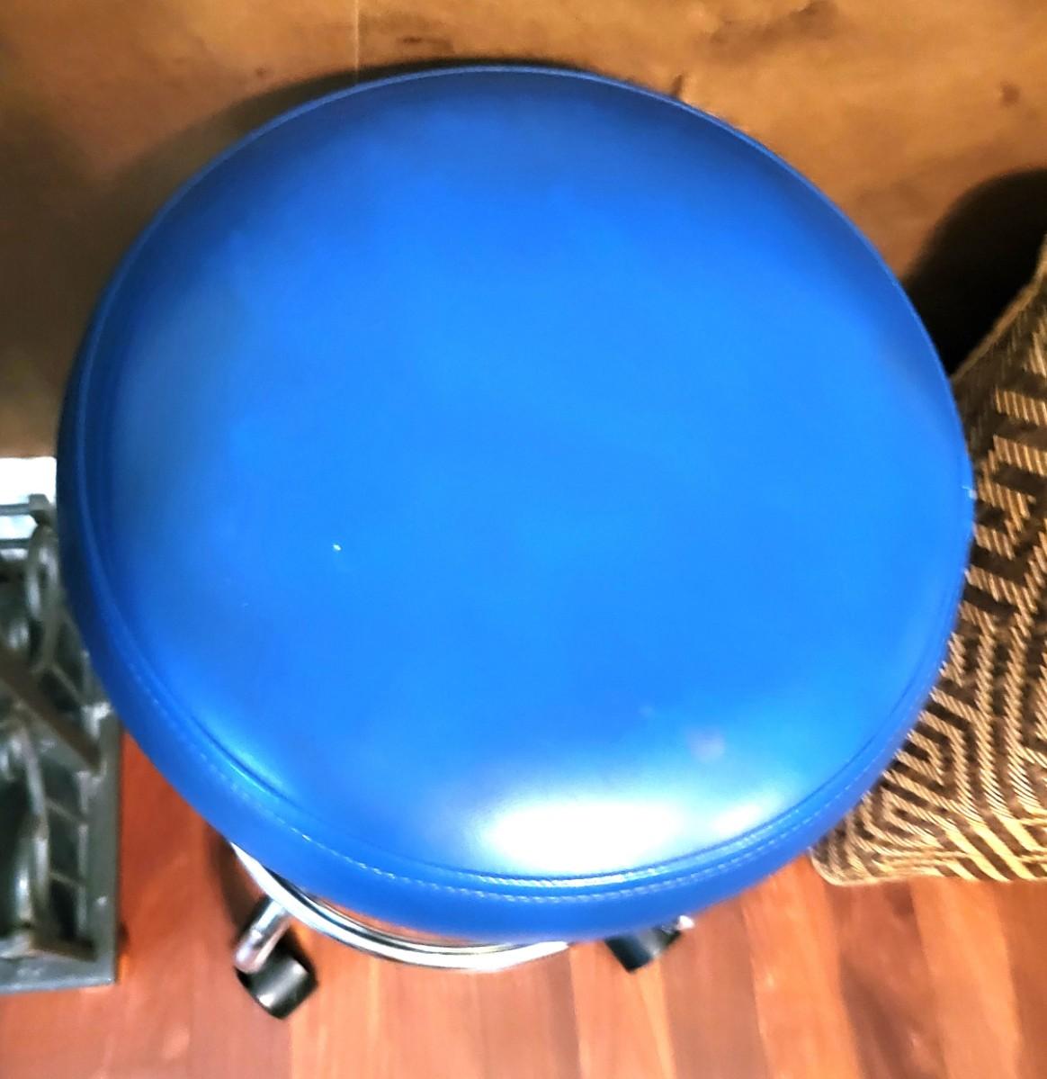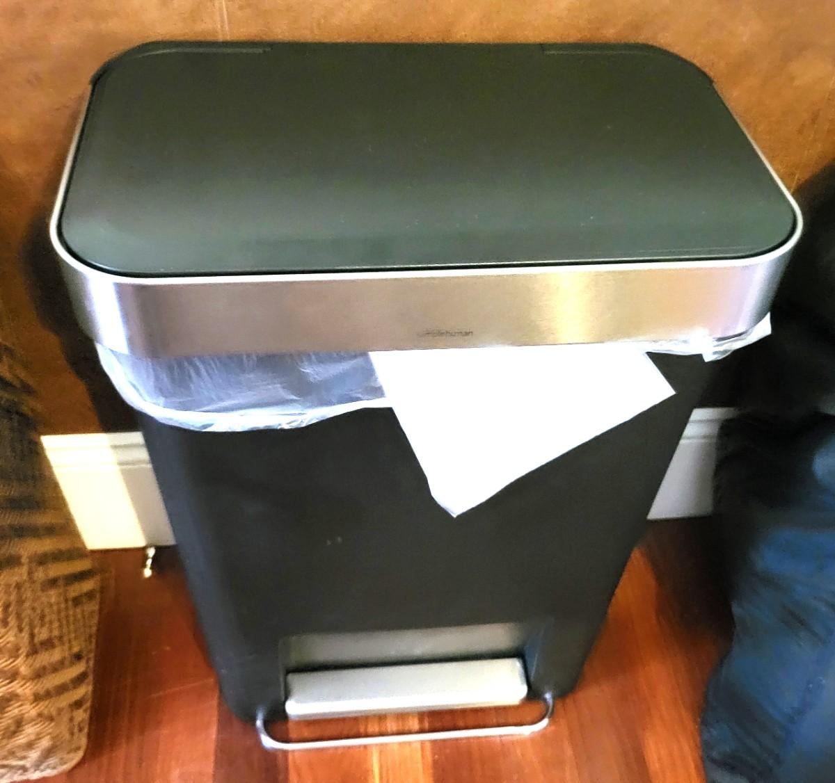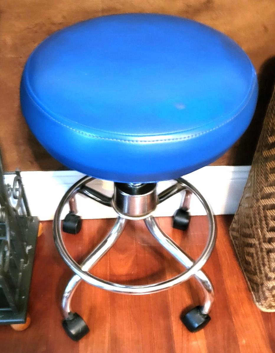 Small Wood Table with Magazine Rack, and Wicker Woven Landry Hamper and Winco Exam Stool and Simplehuman Waste Can
