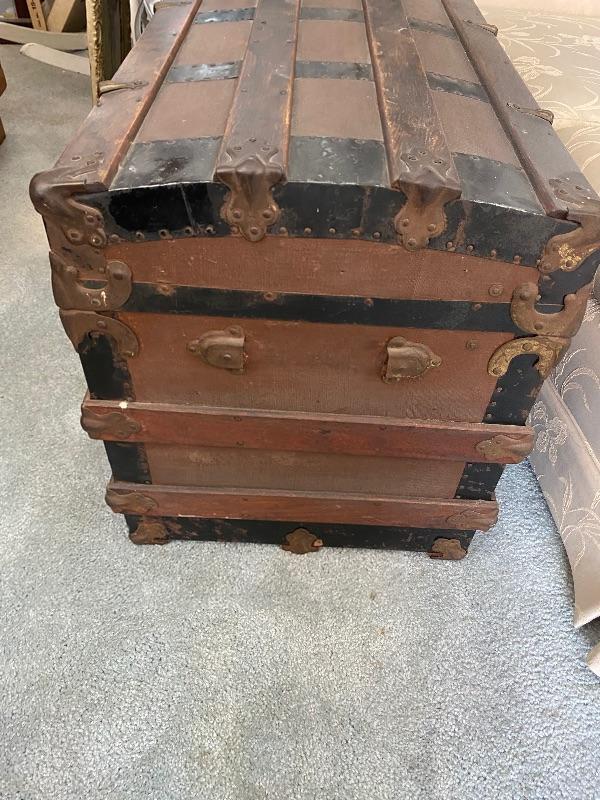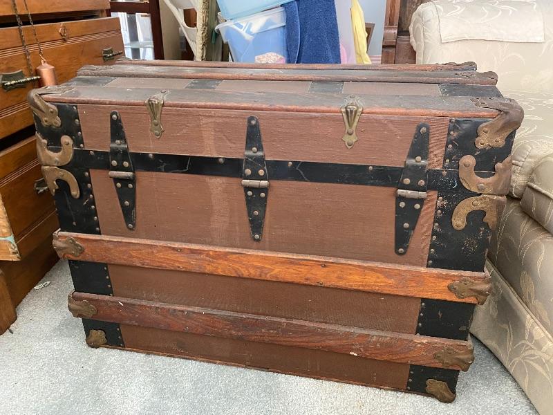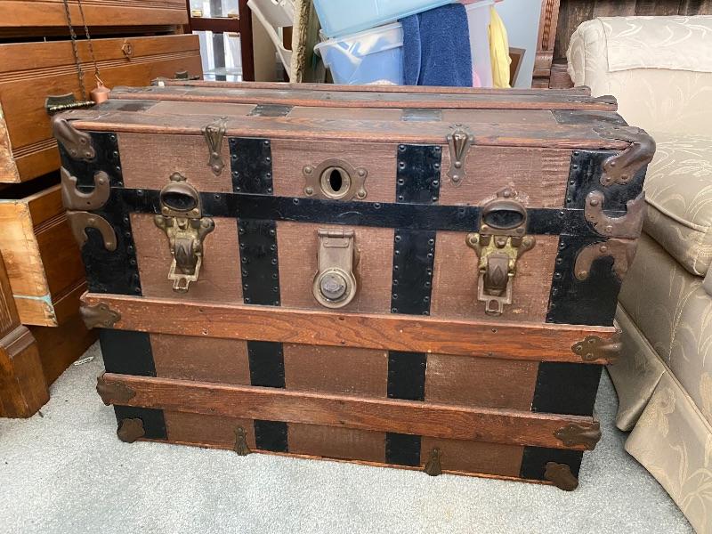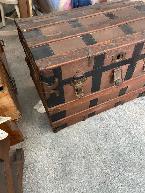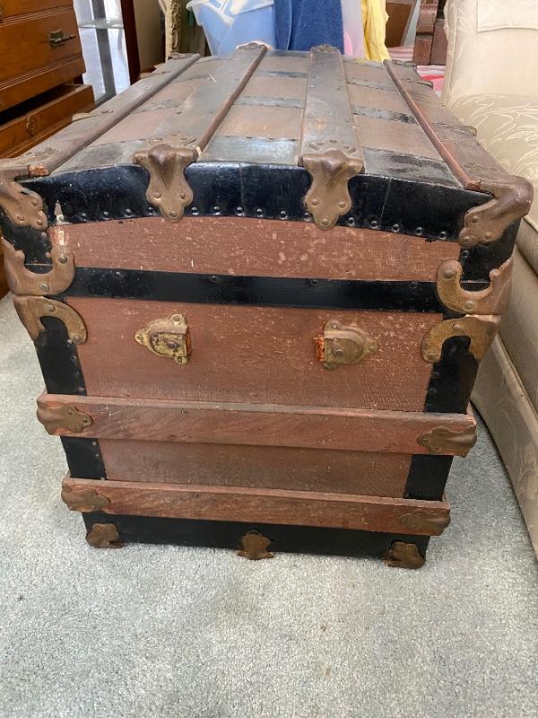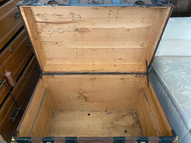 Great wood steamer truck. Looks great inside and out. Missing the removable shelf inside and the side handle on the outside. Lots of potential, displays great. Measures roughly 28" length.