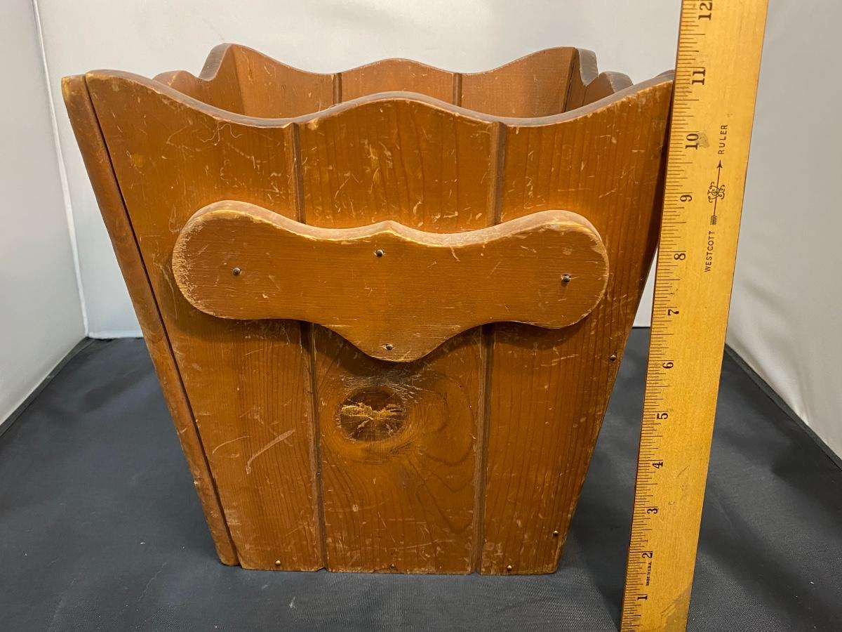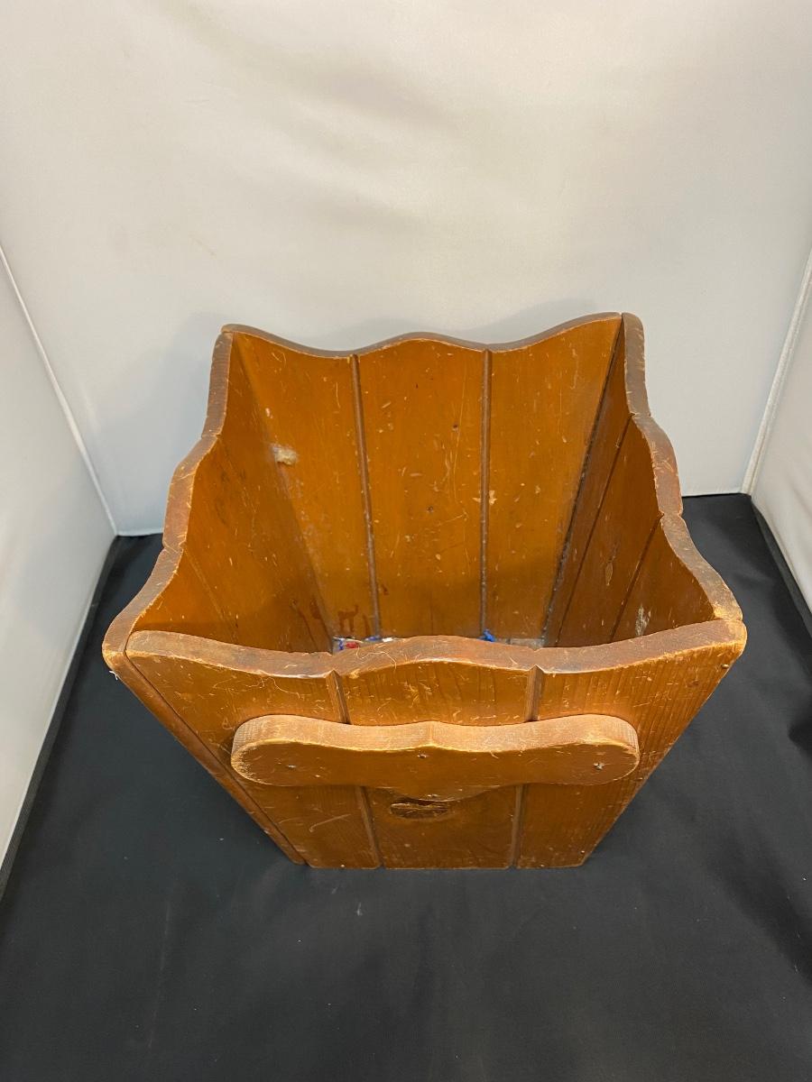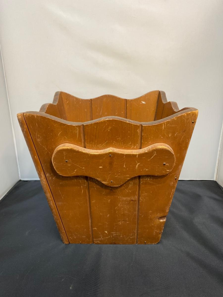 Small wood trash can. Used, has signs of wear. Perfect for bedroom, office or restroom.