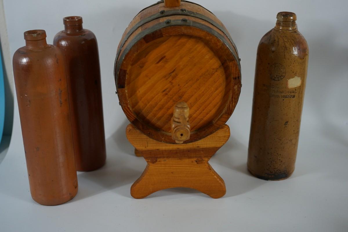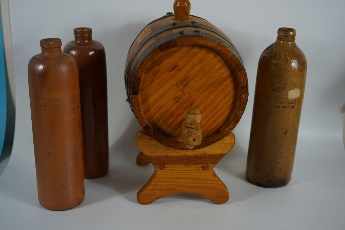 SMALL WOODEN BARRELL W/ THREE STONEWARE BOTTLES GROUPING.