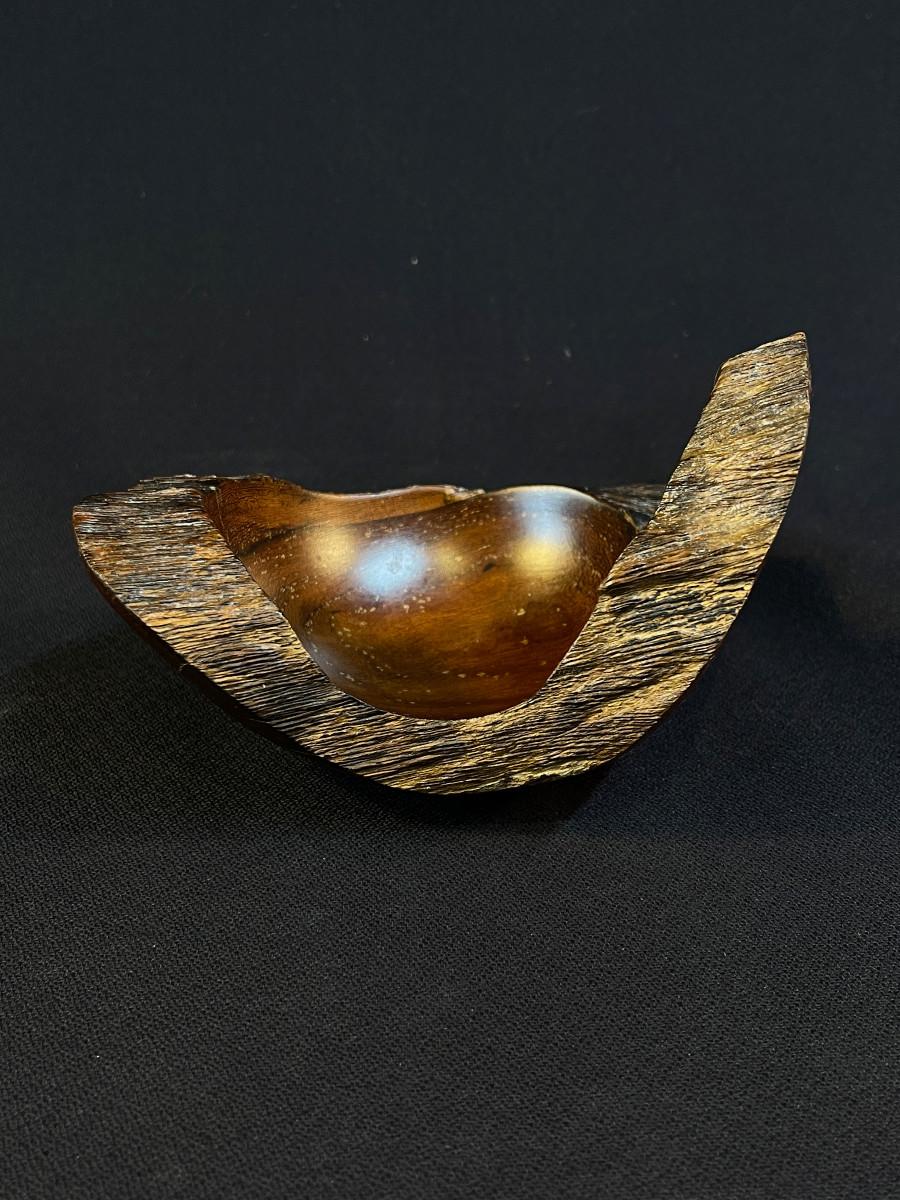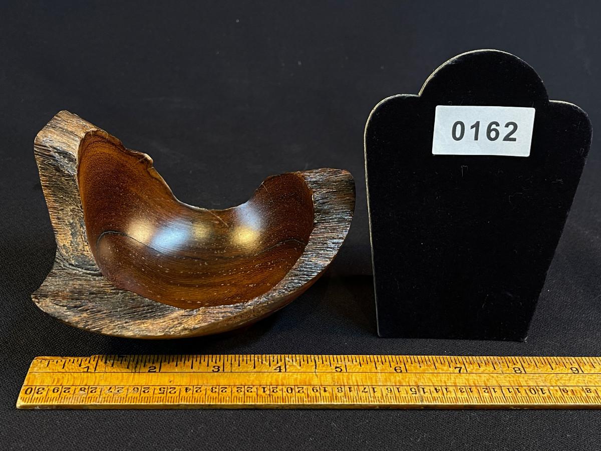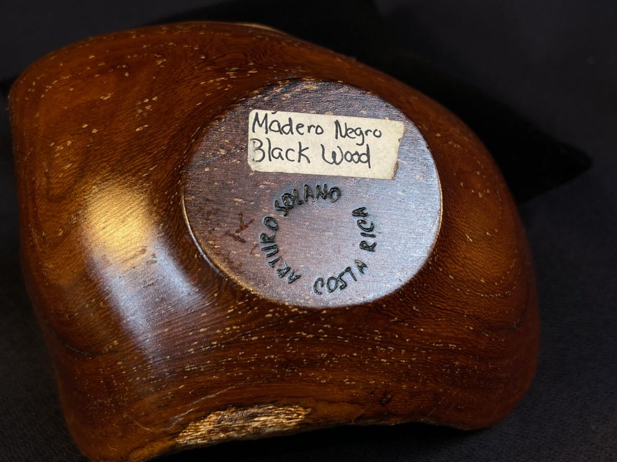 The subject item is a hand-crafted wood bowl from Costa Rica, rendered in Madero Negro wood. Although small, the asymmetrical sculptural form of the bowl, paired with its high polish, makes this a truly great accent piece. The bowl is burn-marked under the base.