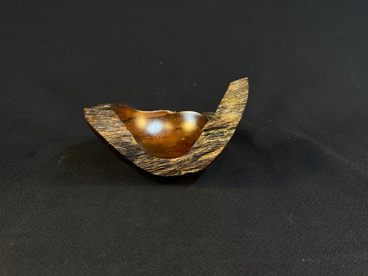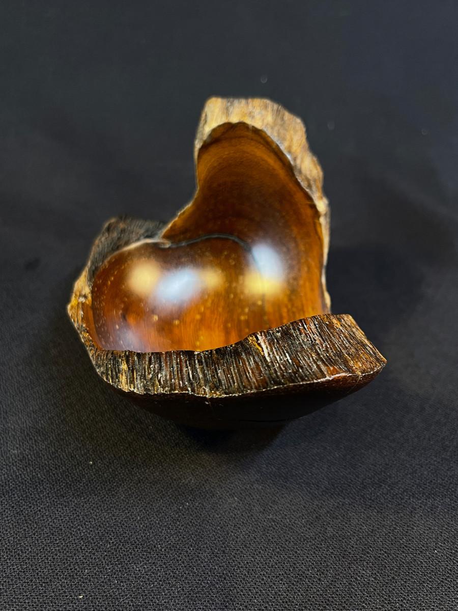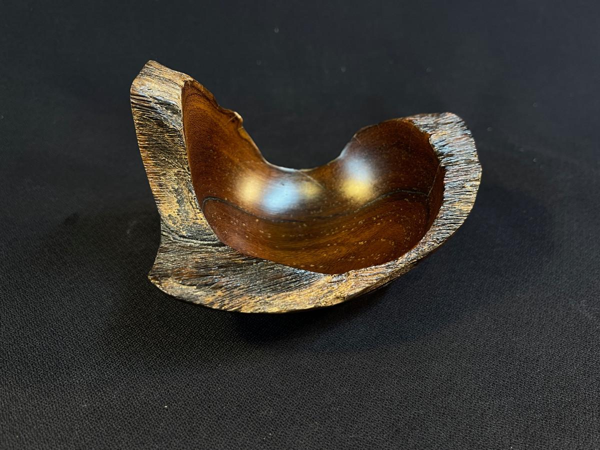 The subject item is a hand-crafted wood bowl from Costa Rica, rendered in Madero Negro wood. Although small, the asymmetrical sculptural form of the bowl, paired with its high polish, makes this a truly great accent piece. The bowl is burn-marked under the base.