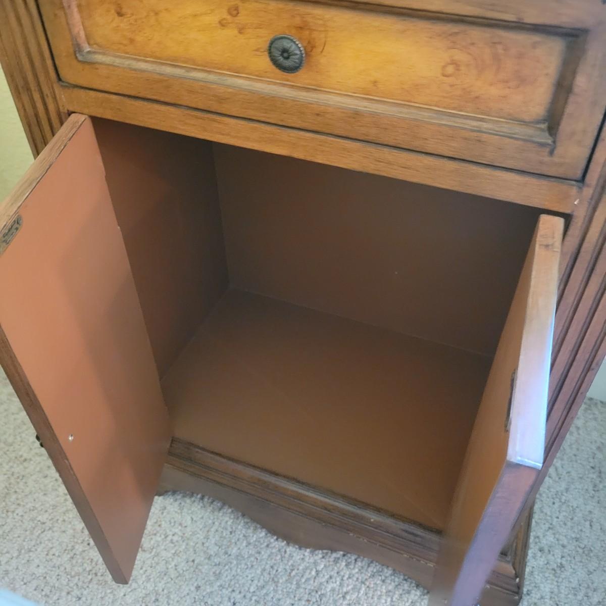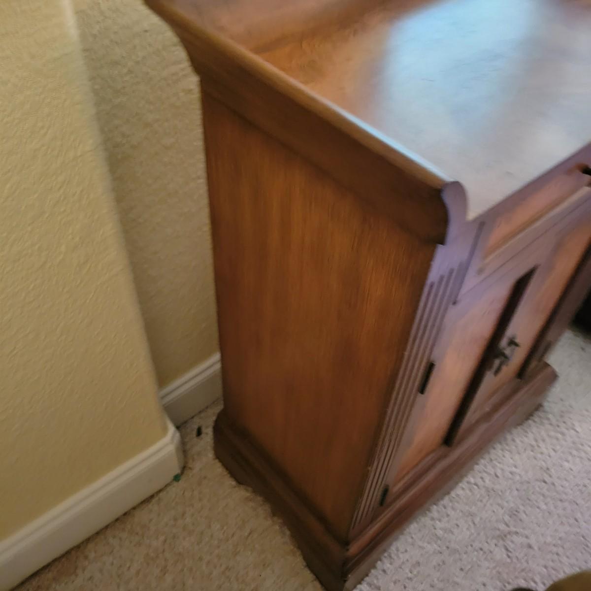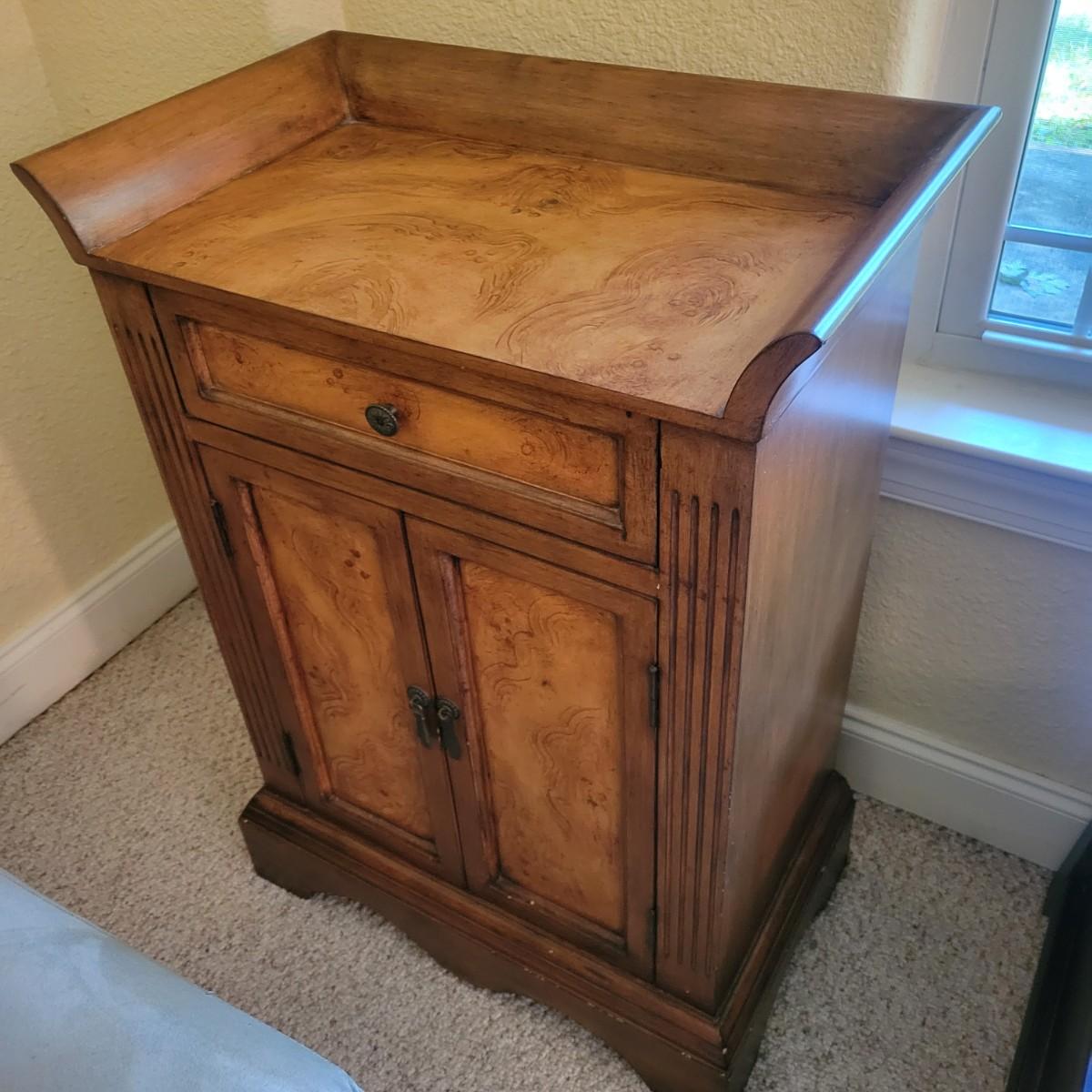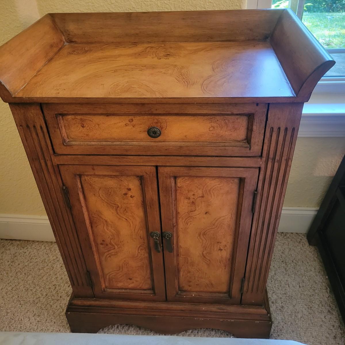A small wooden cabinet that has one drawer, a two doored cabinet space and measures approximately 26" x 15.5" x 36"H. Local pickup only