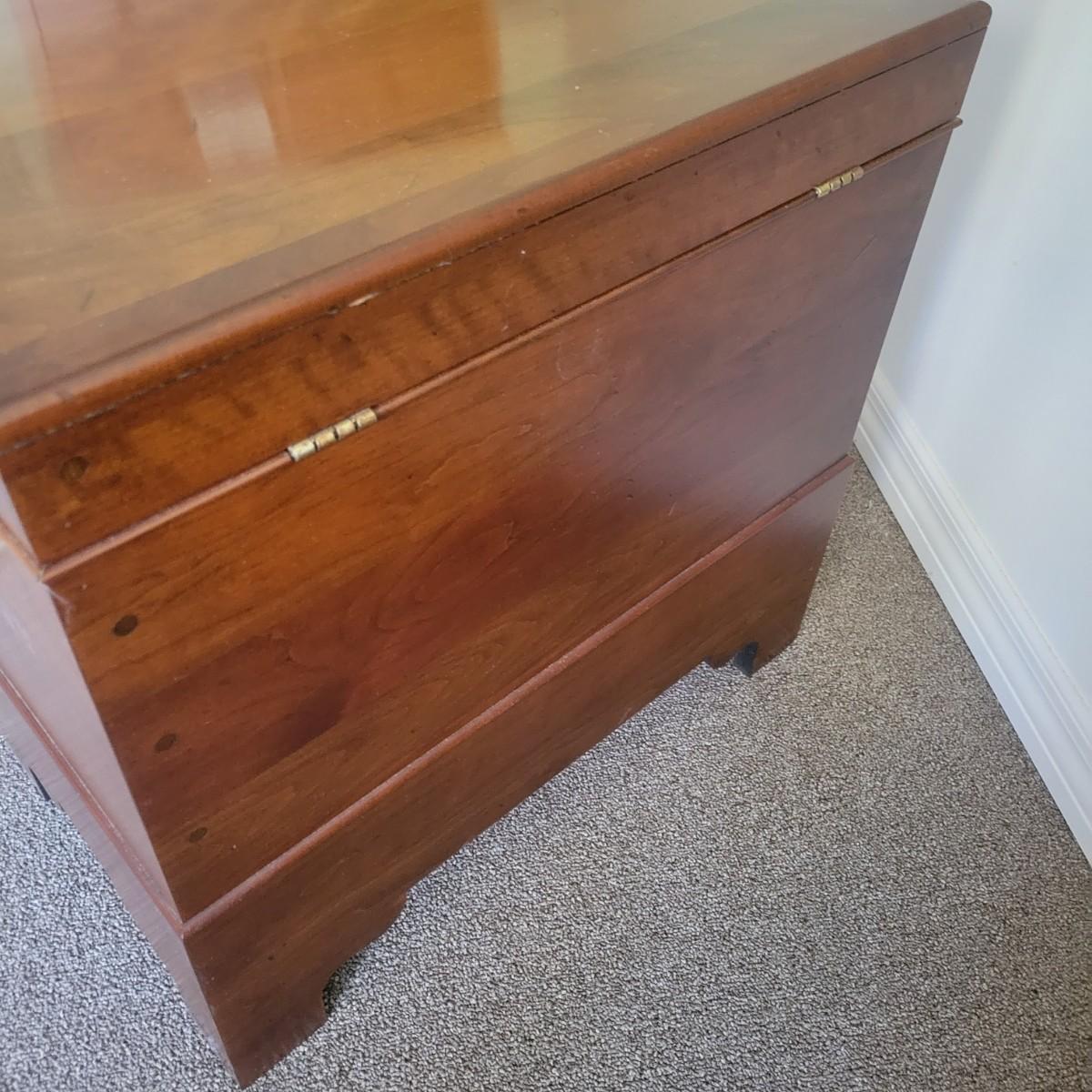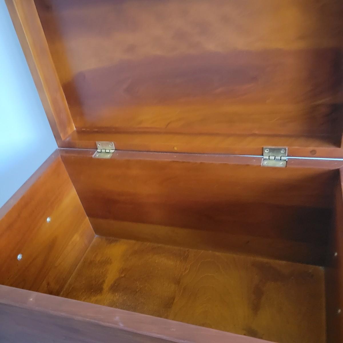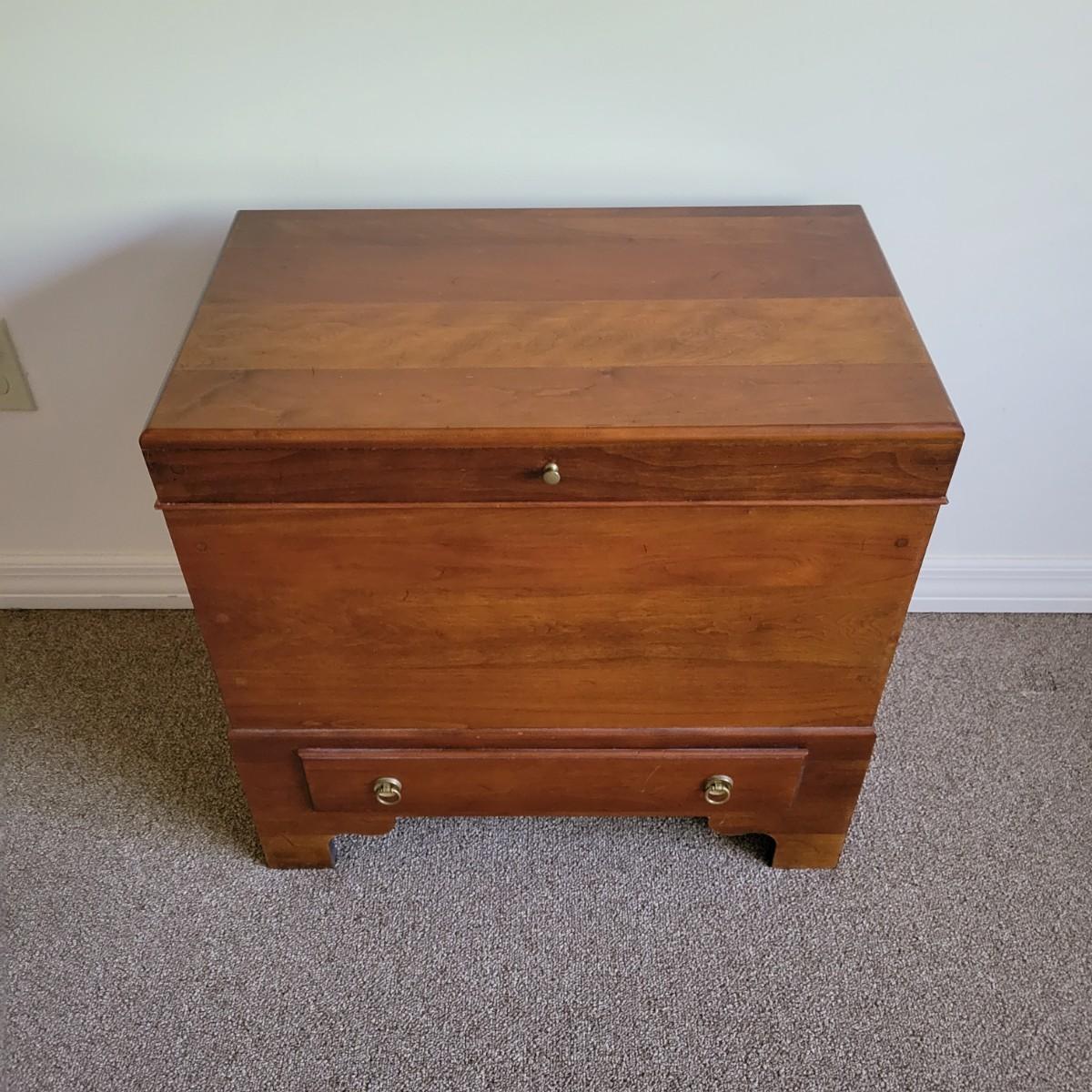 A small wooden chest that is made of cherry manufacturedby Madison Square Furniture. It features one dovetailed drawer and a a hinged lid that opens to a large storage space. It measures approximately 22" x 13" x 21.5"H. Local pickup only