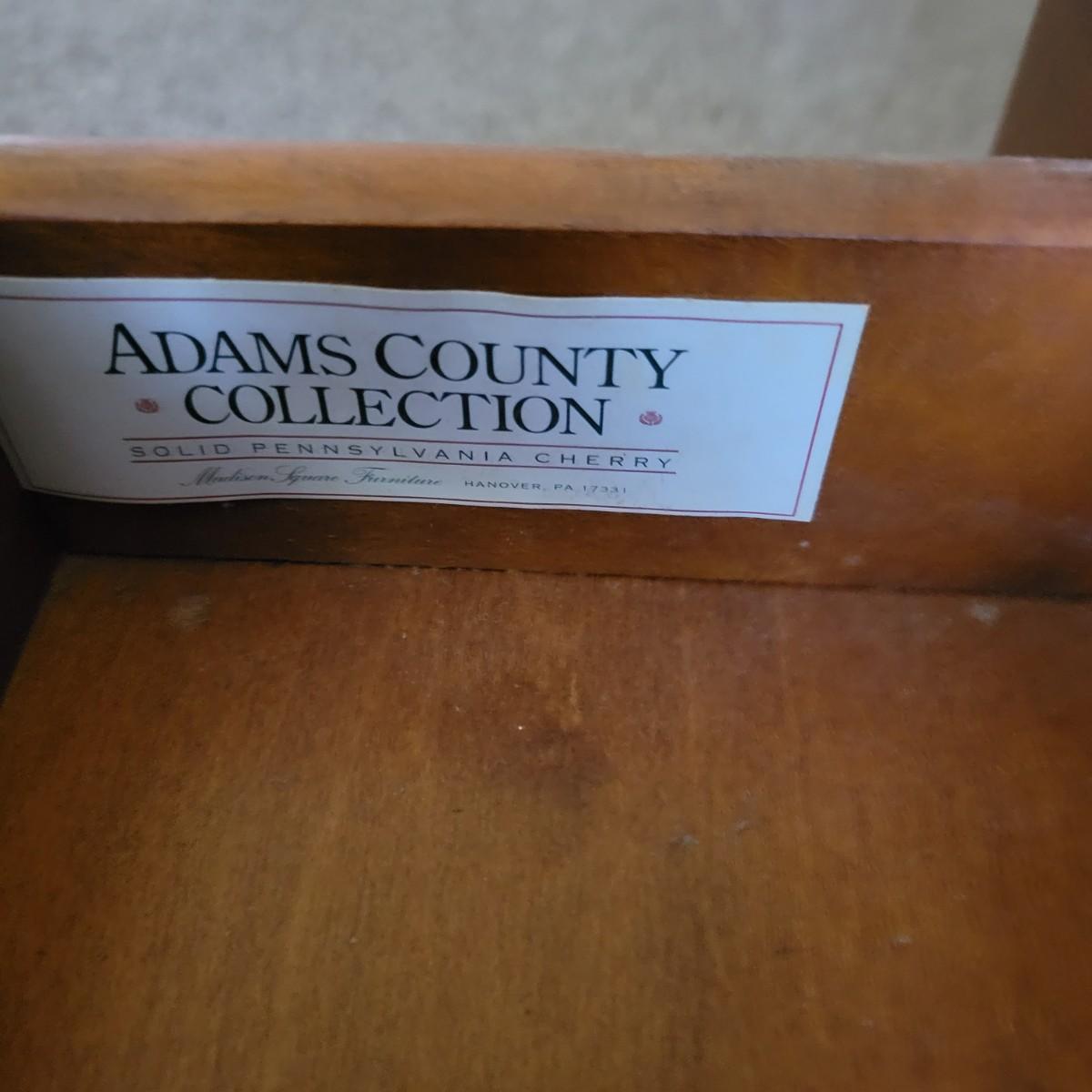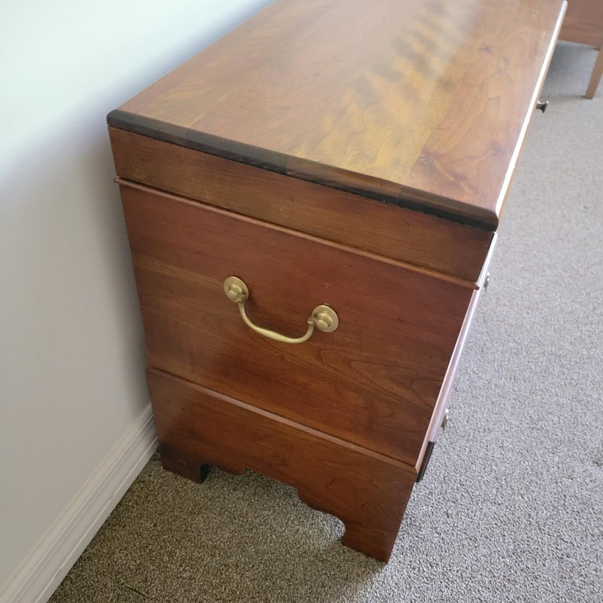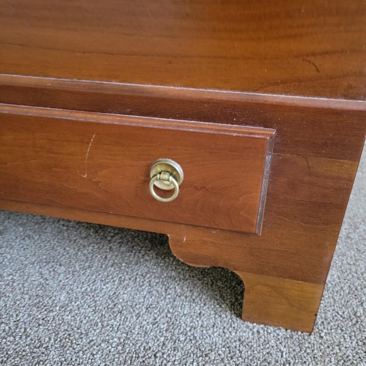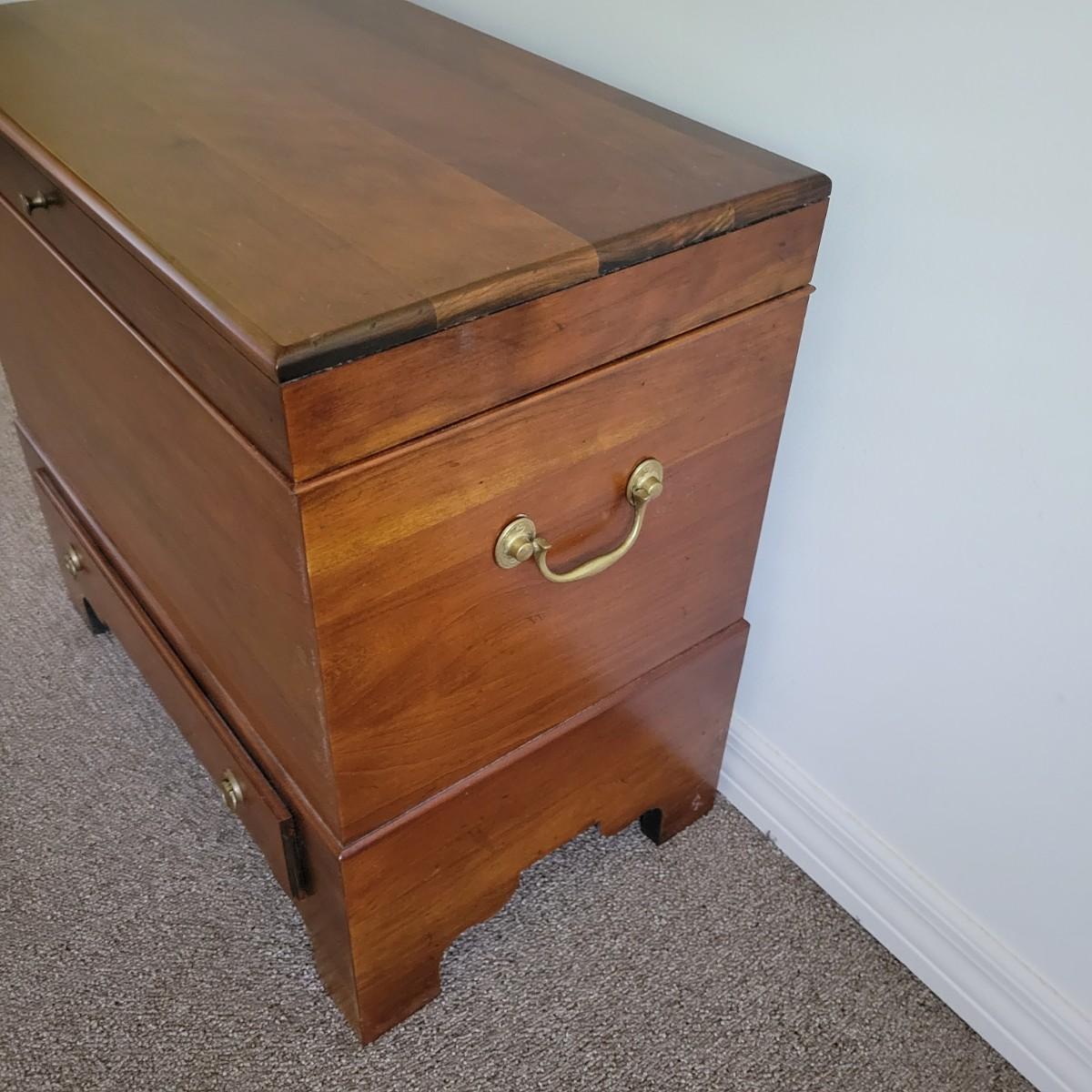 A small wooden chest that is made of cherry manufacturedby Madison Square Furniture. It features one dovetailed drawer and a a hinged lid that opens to a large storage space. It measures approximately 22" x 13" x 21.5"H. Local pickup only