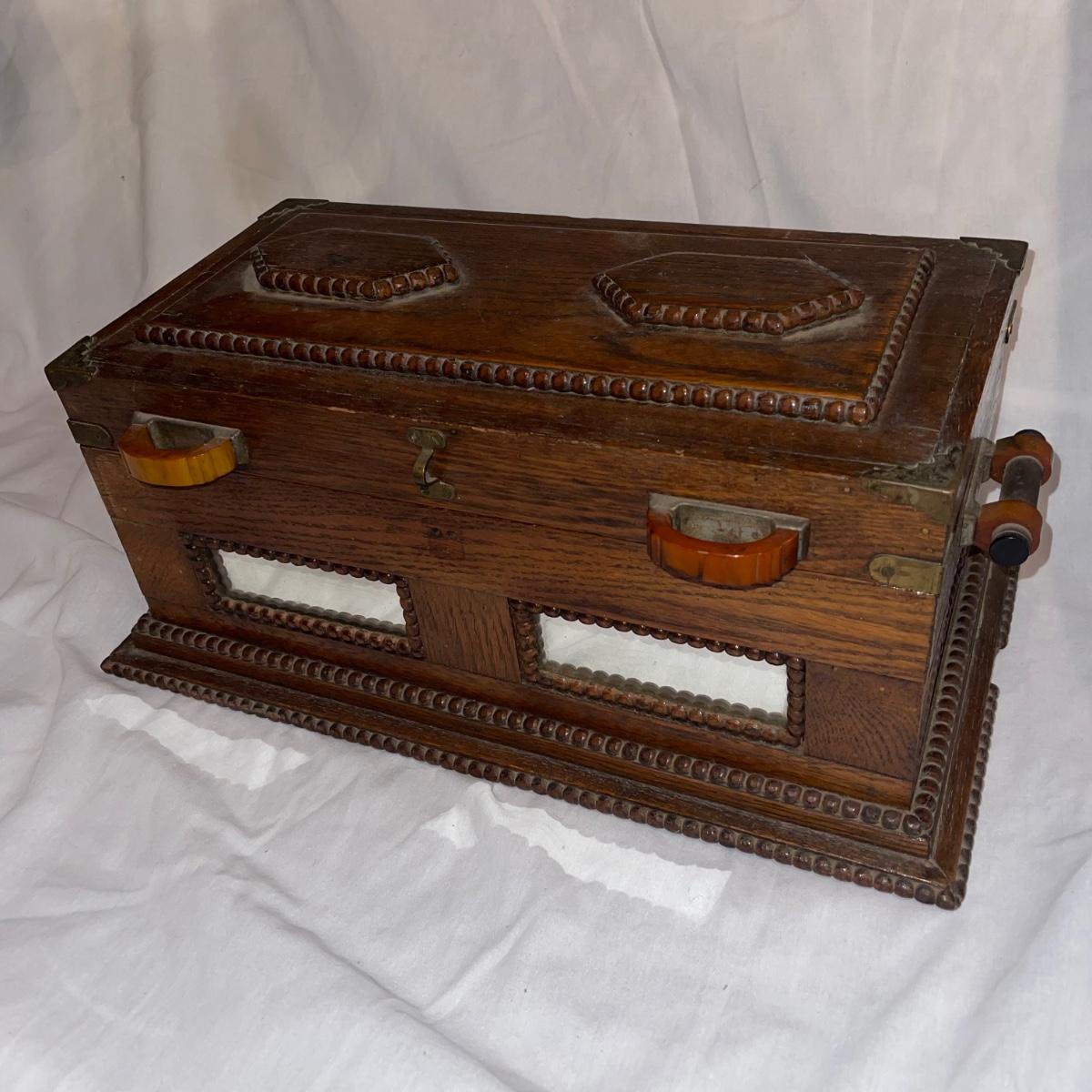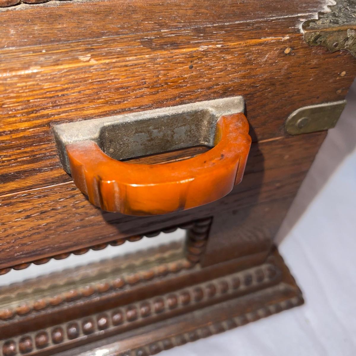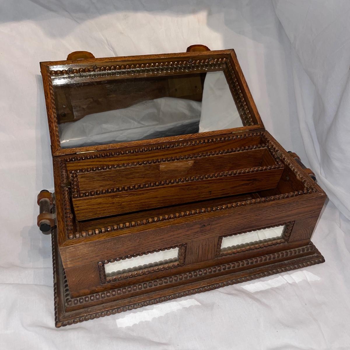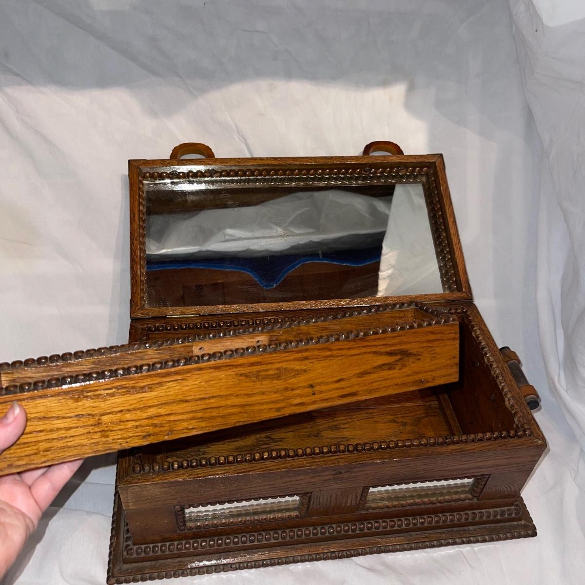 This wooden chest that appears to be hand built, measures 19.25” x 10.75” x 8”. There are two mirrors on the front of the box, one on either side, and one on the interior of the lid. Some of the molding is missing and the handles on the front and sides appear to be made of colored plastic imitating stone. There is a removable and adjustable drawer inside.