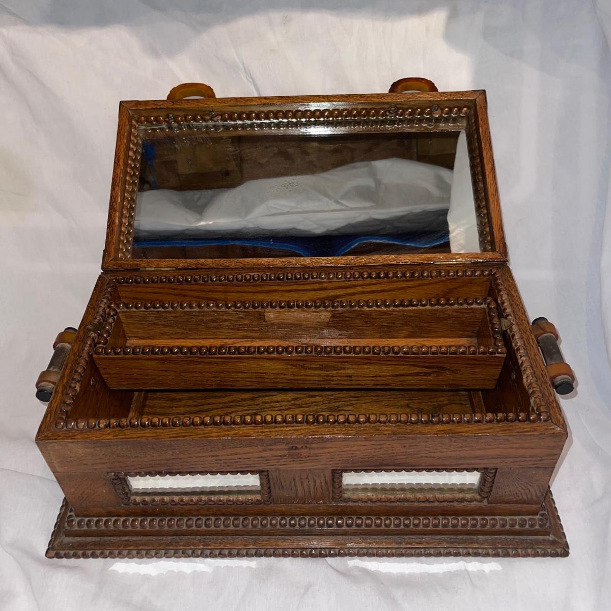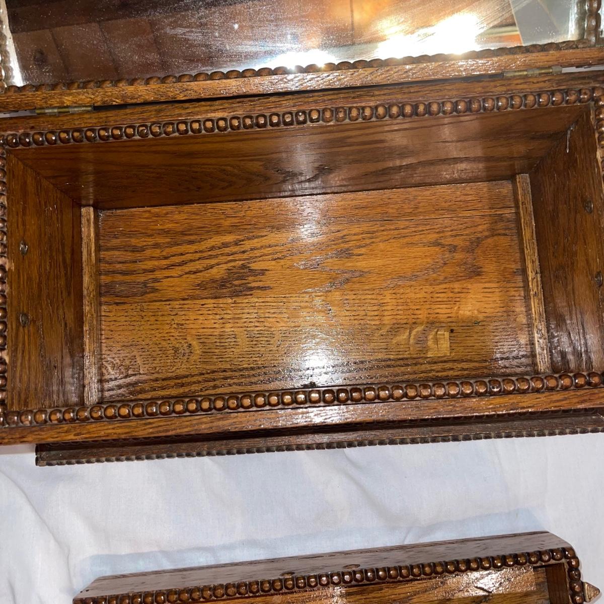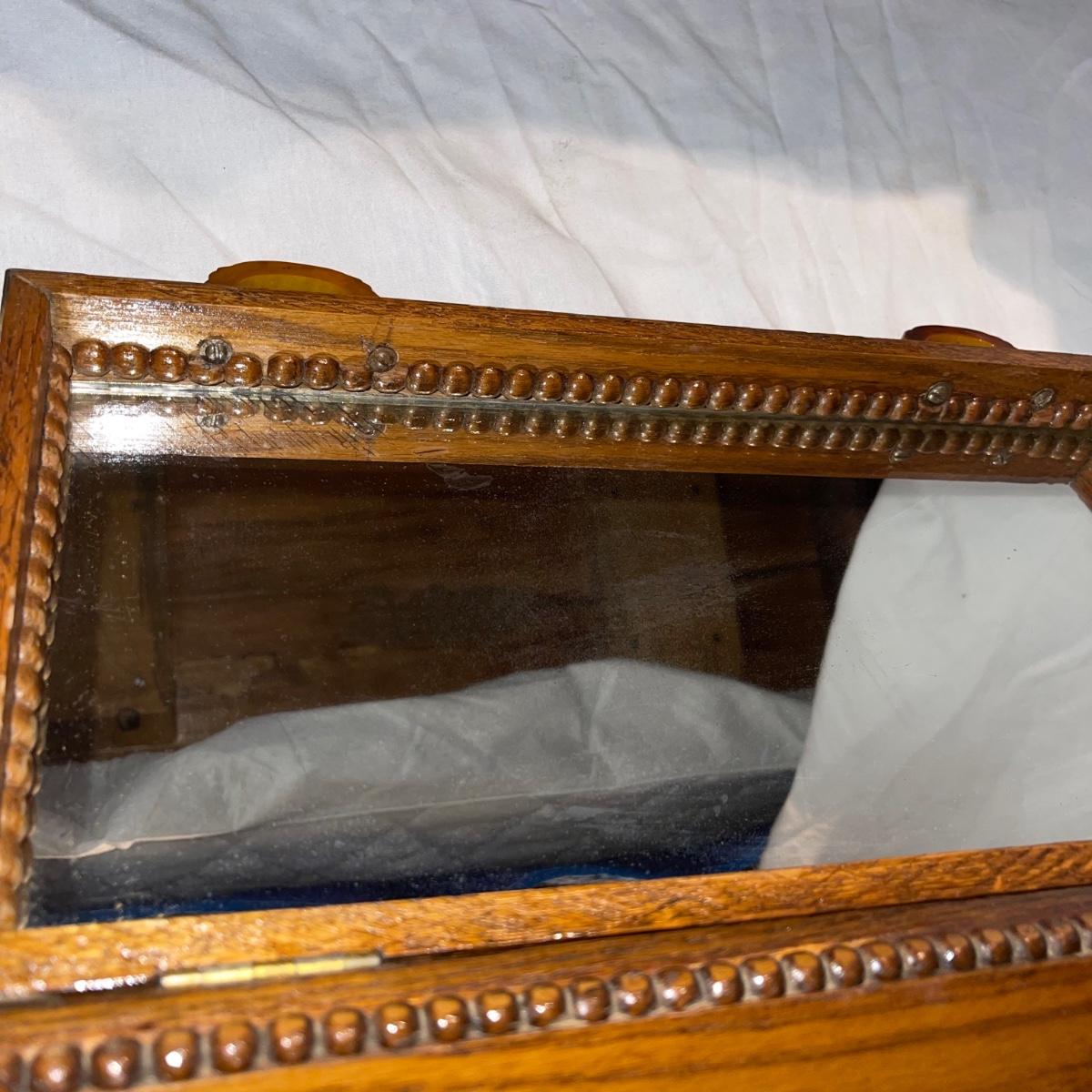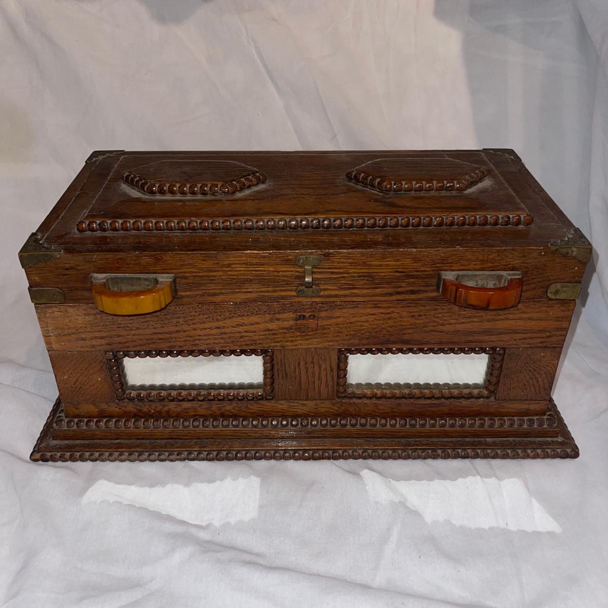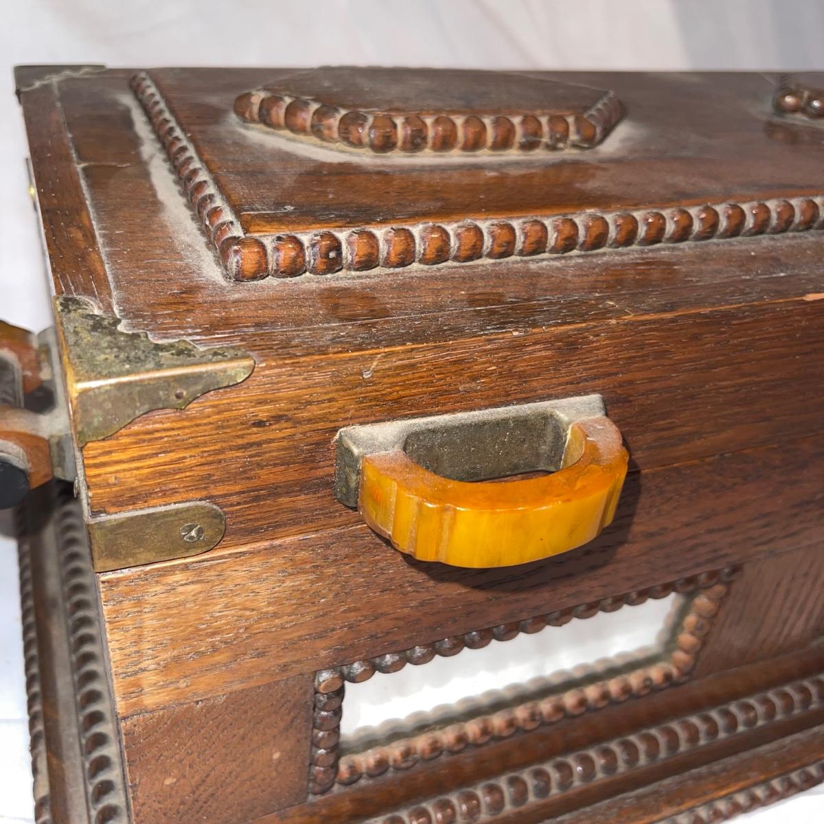 This wooden chest that appears to be hand built, measures 19.25” x 10.75” x 8”. There are two mirrors on the front of the box, one on either side, and one on the interior of the lid. Some of the molding is missing and the handles on the front and sides appear to be made of colored plastic imitating stone. There is a removable and adjustable drawer inside.