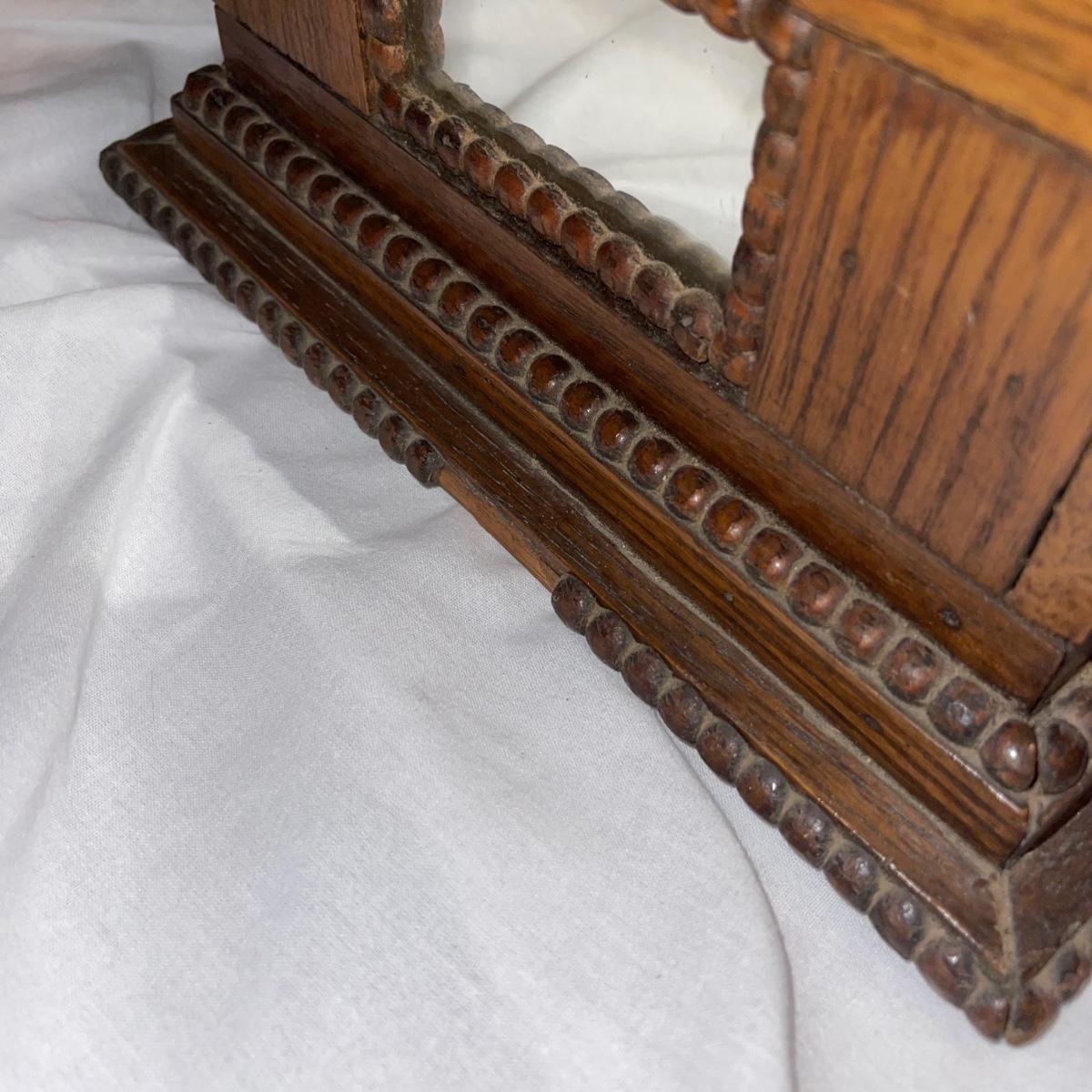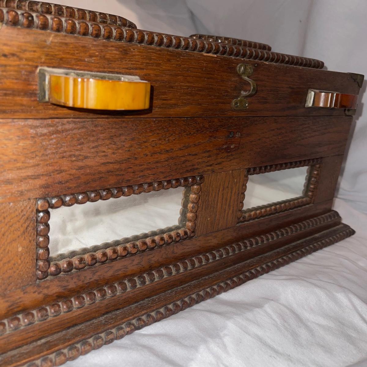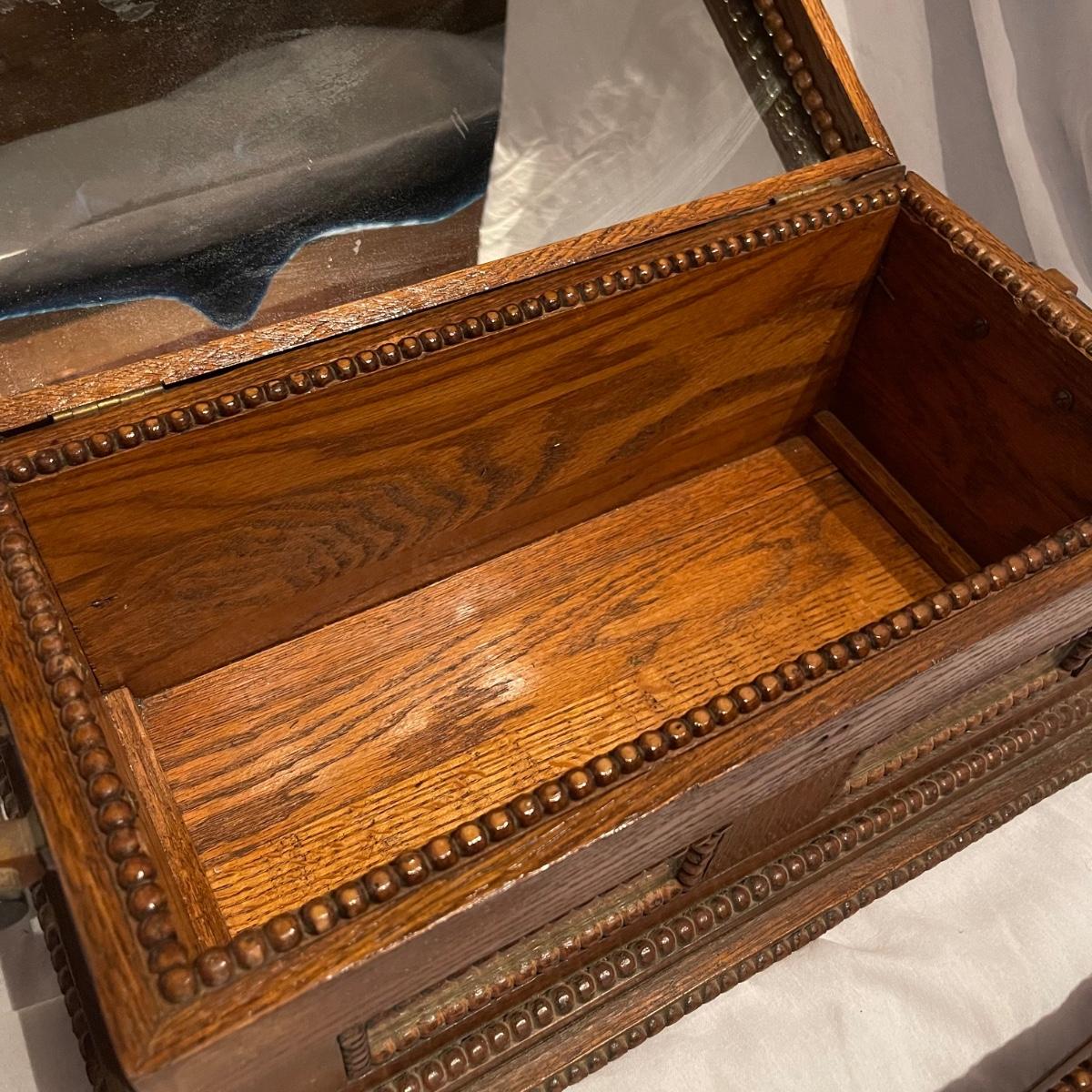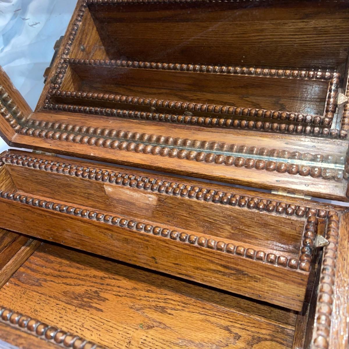 This wooden chest that appears to be hand built, measures 19.25” x 10.75” x 8”. There are two mirrors on the front of the box, one on either side, and one on the interior of the lid. Some of the molding is missing and the handles on the front and sides appear to be made of colored plastic imitating stone. There is a removable and adjustable drawer inside.