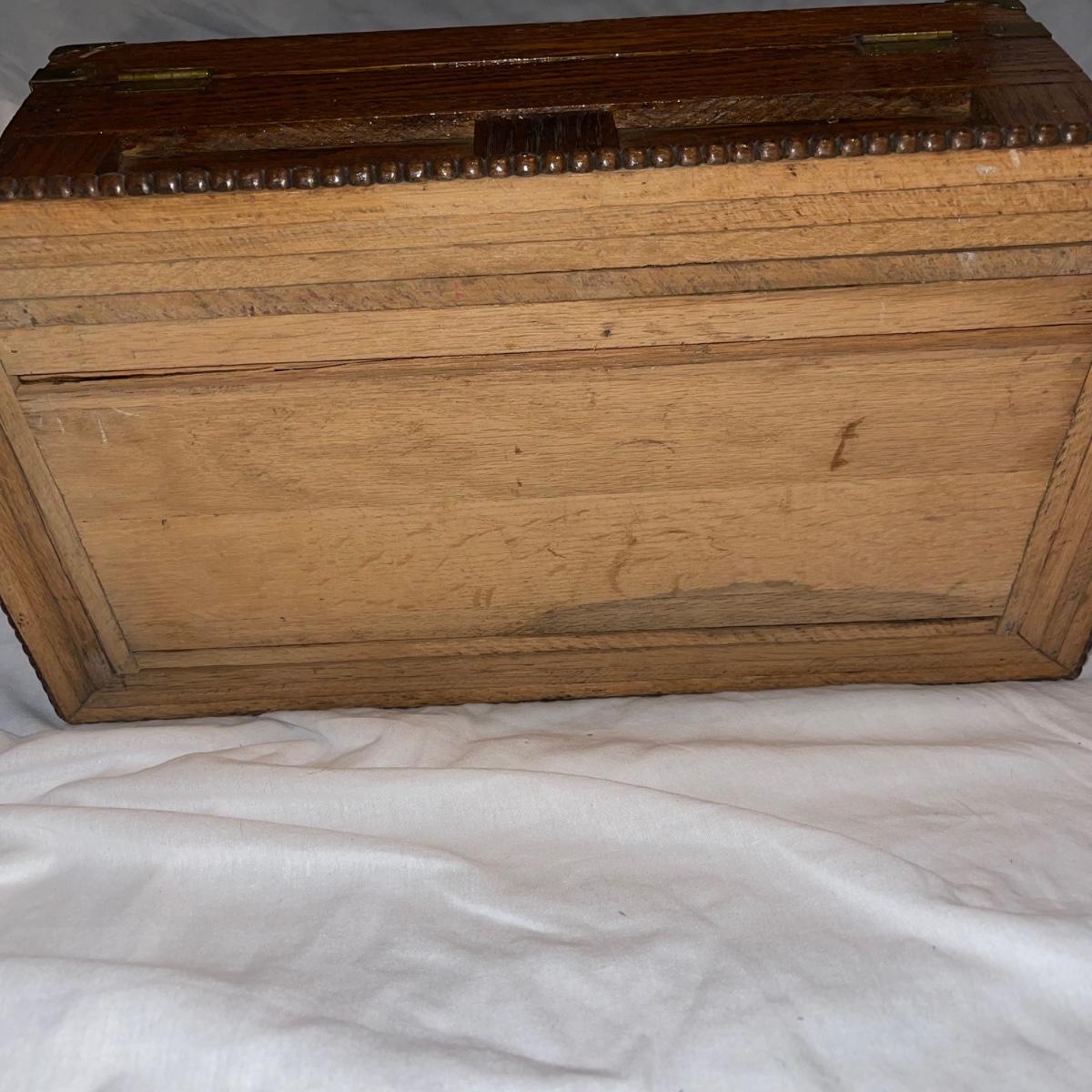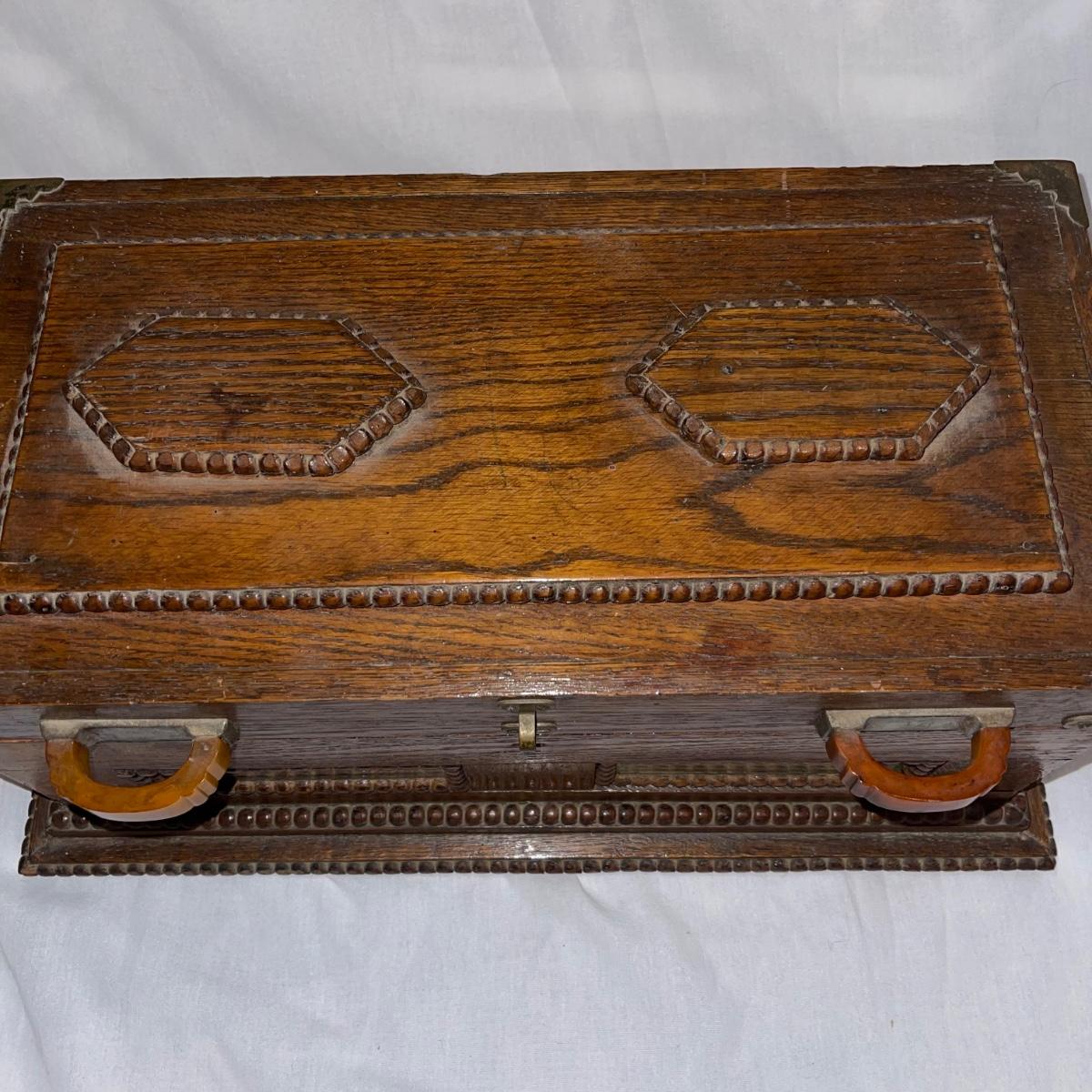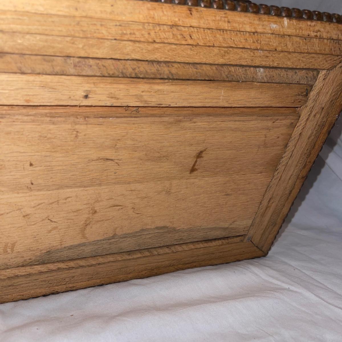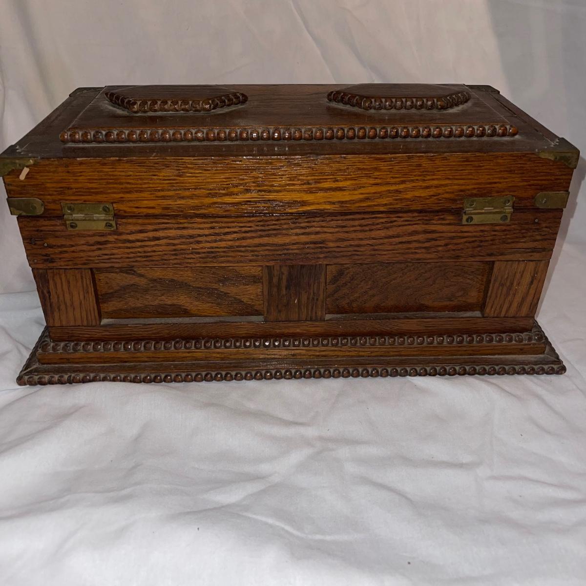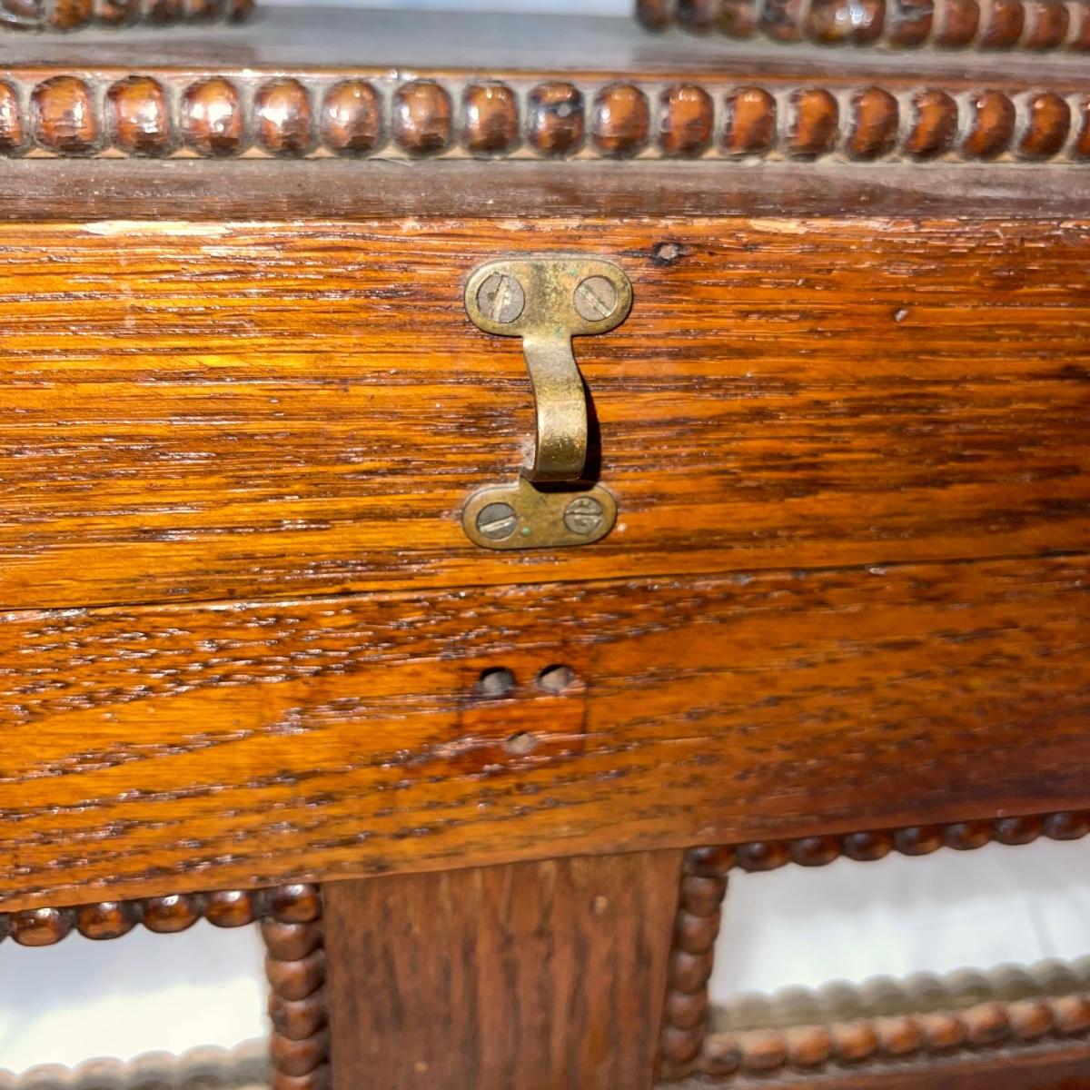 This wooden chest that appears to be hand built, measures 19.25” x 10.75” x 8”. There are two mirrors on the front of the box, one on either side, and one on the interior of the lid. Some of the molding is missing and the handles on the front and sides appear to be made of colored plastic imitating stone. There is a removable and adjustable drawer inside.