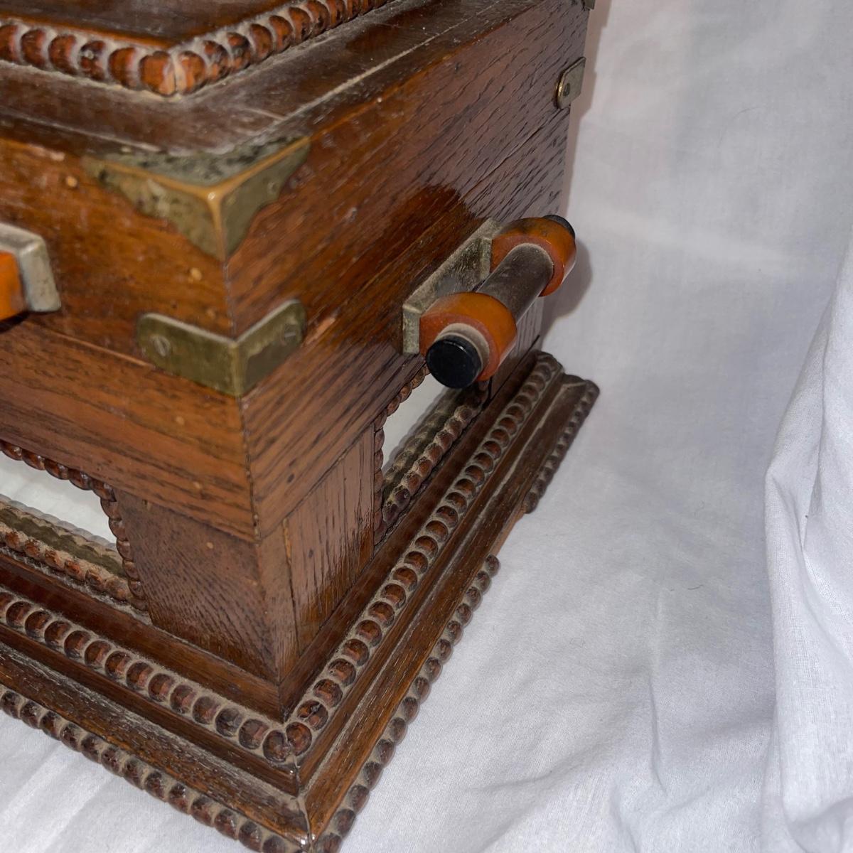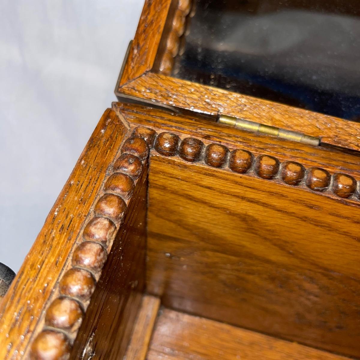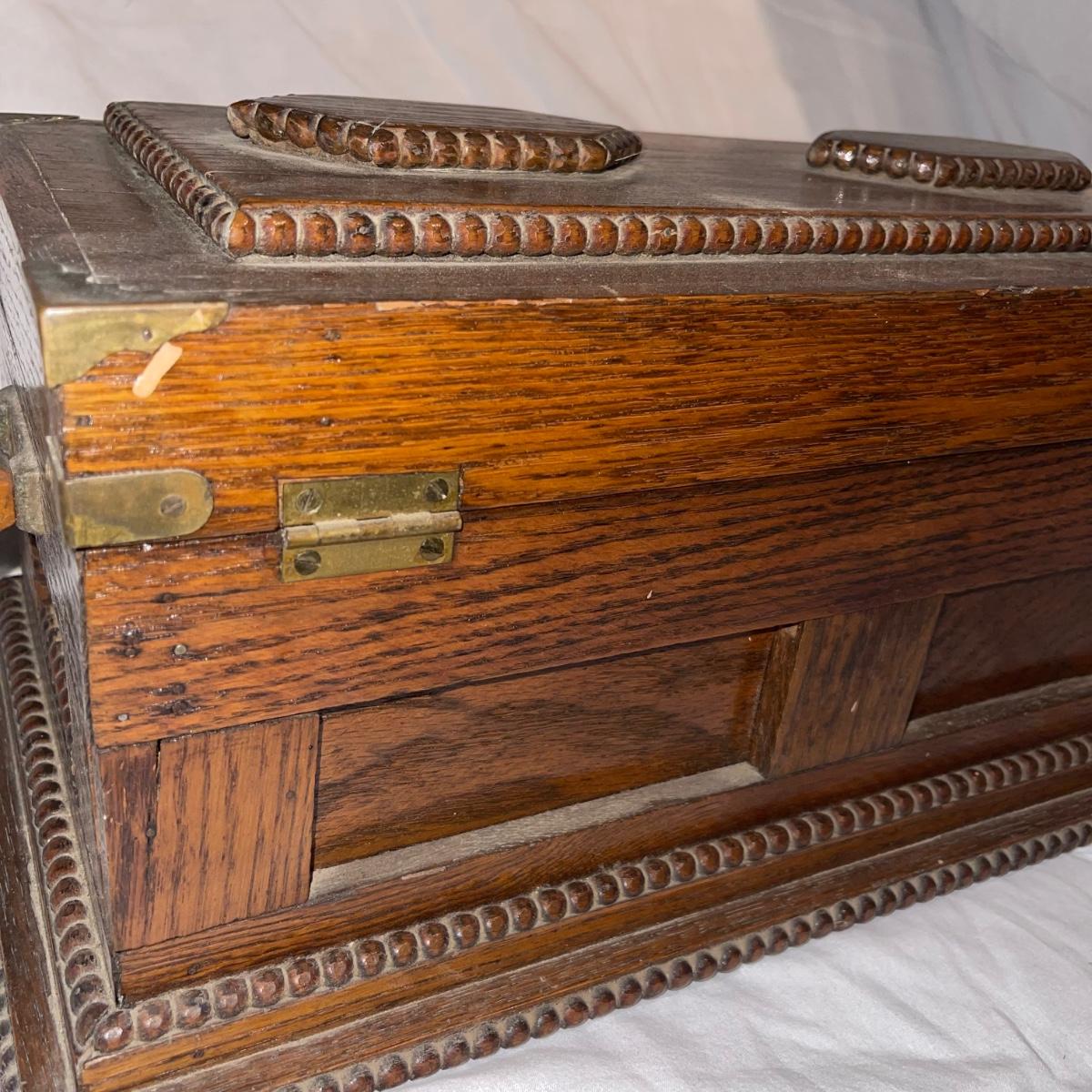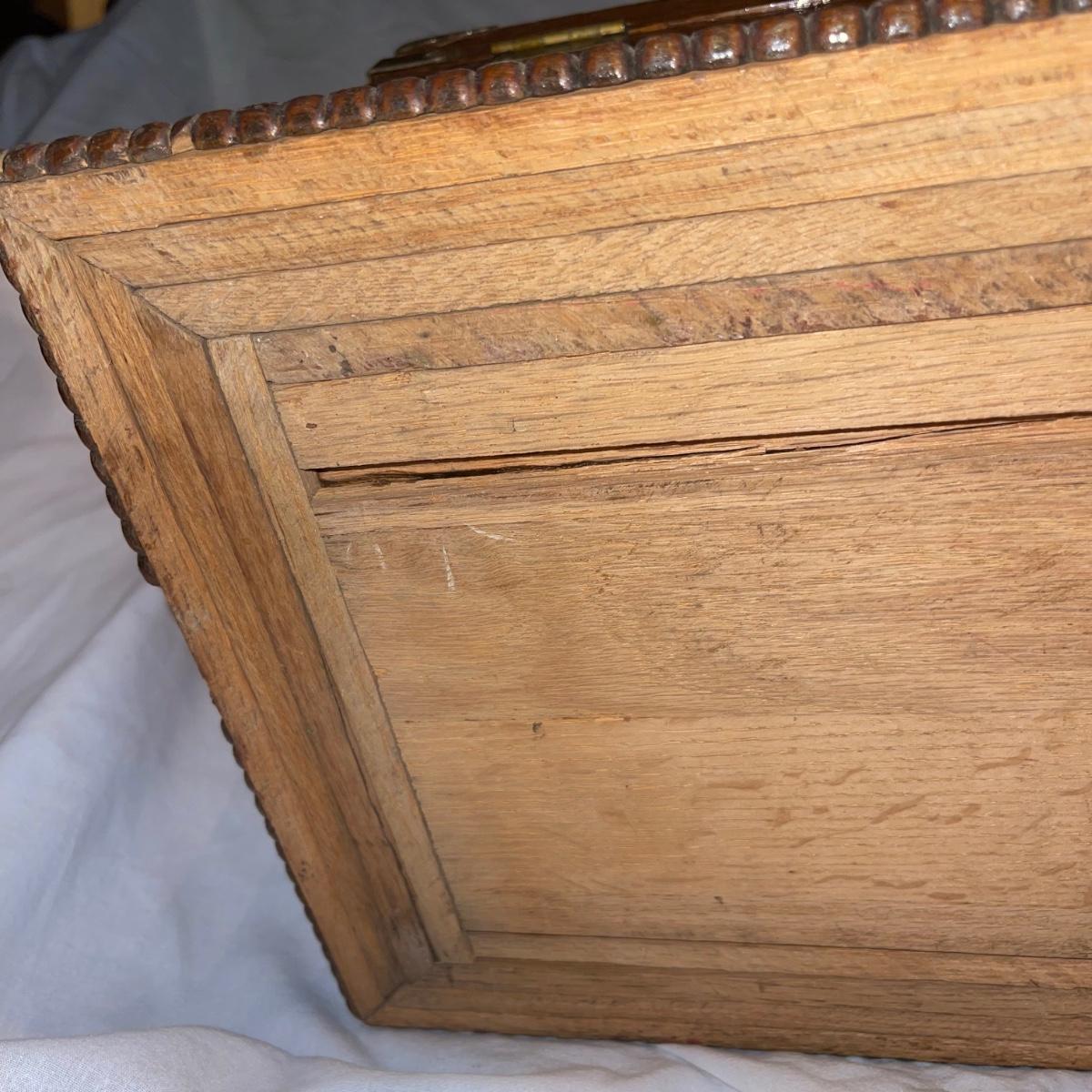This wooden chest that appears to be hand built, measures 19.25” x 10.75” x 8”. There are two mirrors on the front of the box, one on either side, and one on the interior of the lid. Some of the molding is missing and the handles on the front and sides appear to be made of colored plastic imitating stone. There is a removable and adjustable drawer inside.