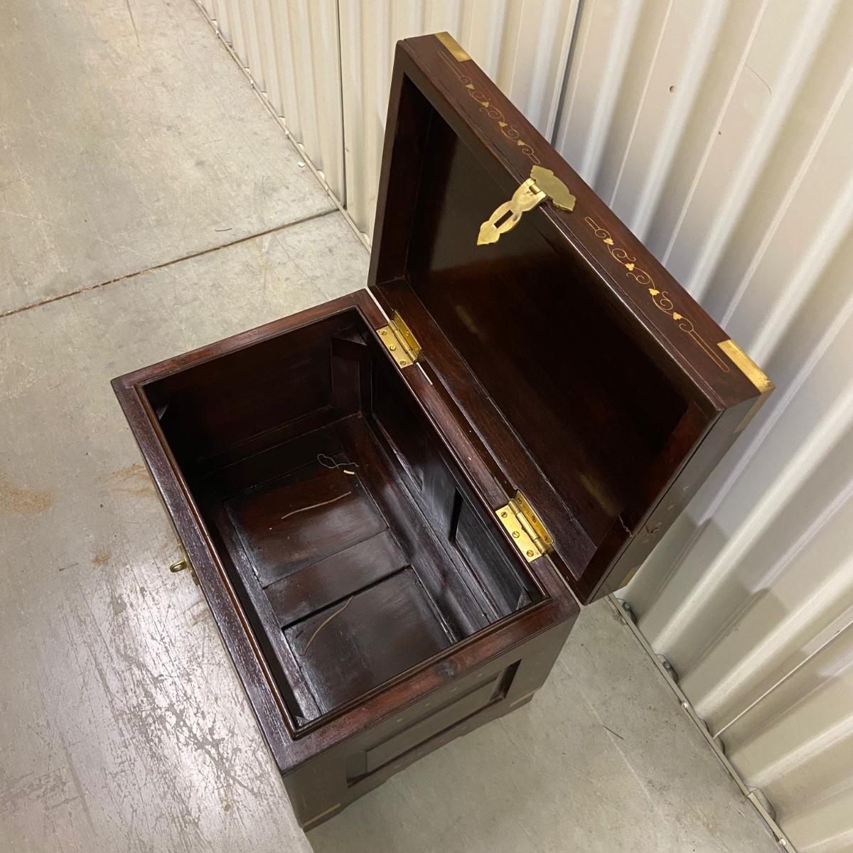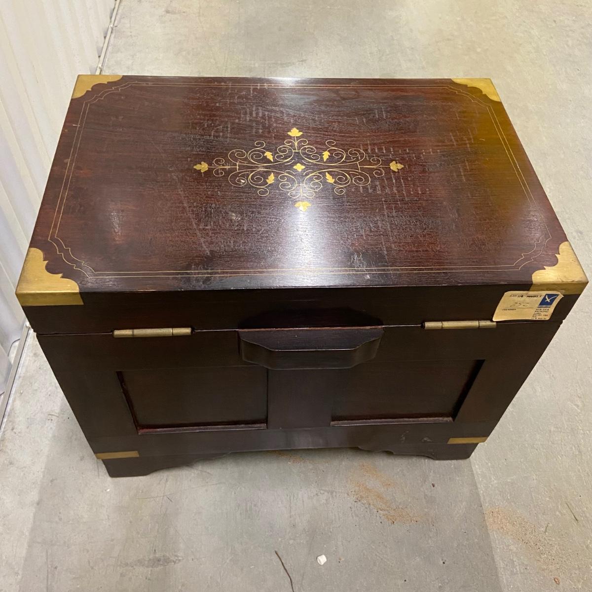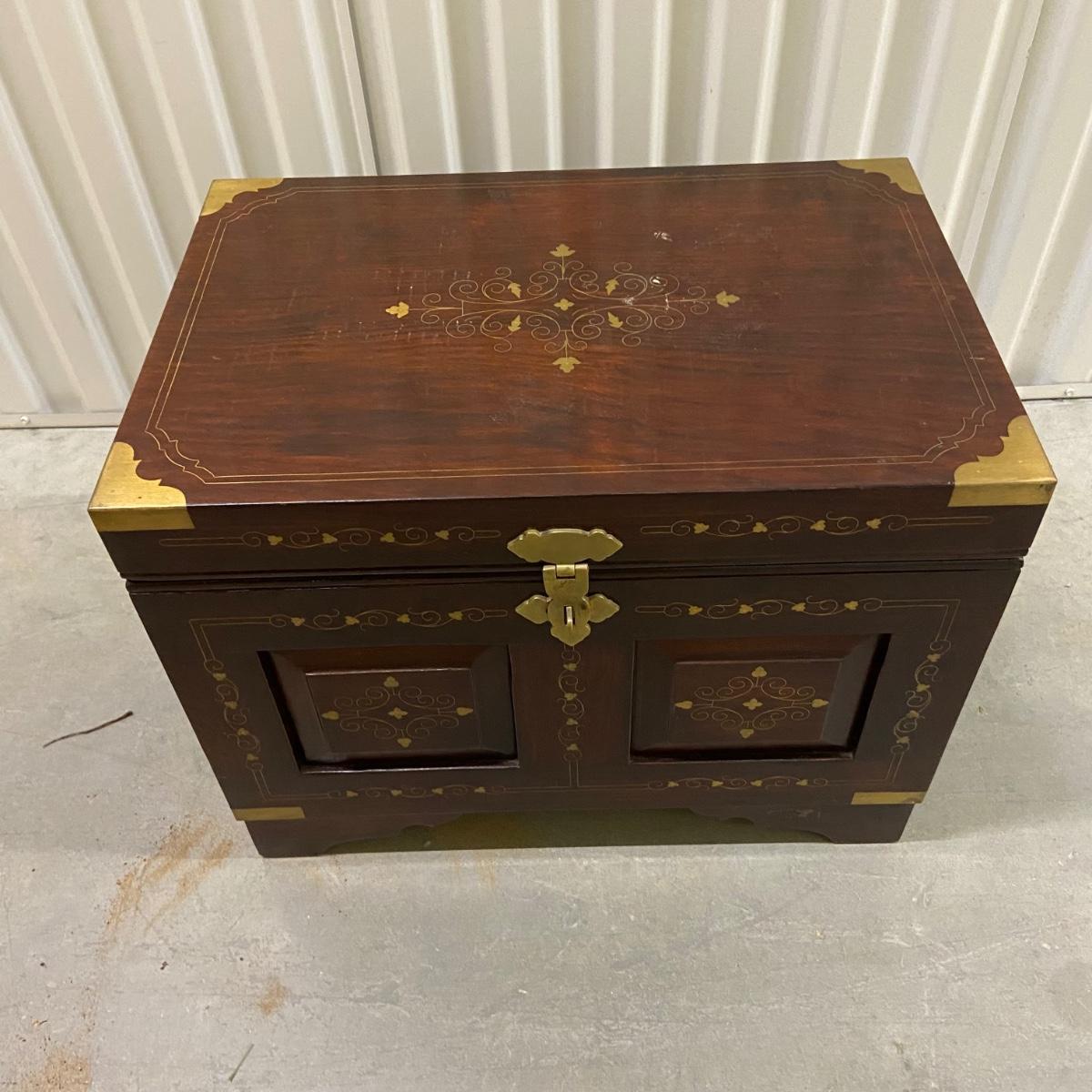 This gorgeous small chest has a stunning dark mahogany color with a lovely brass colored inlay. It measures 18” x 12” x 14”. This chest has hardware on the front so you could put a lock on it and the lid lifts open on hinges. Shipping available.