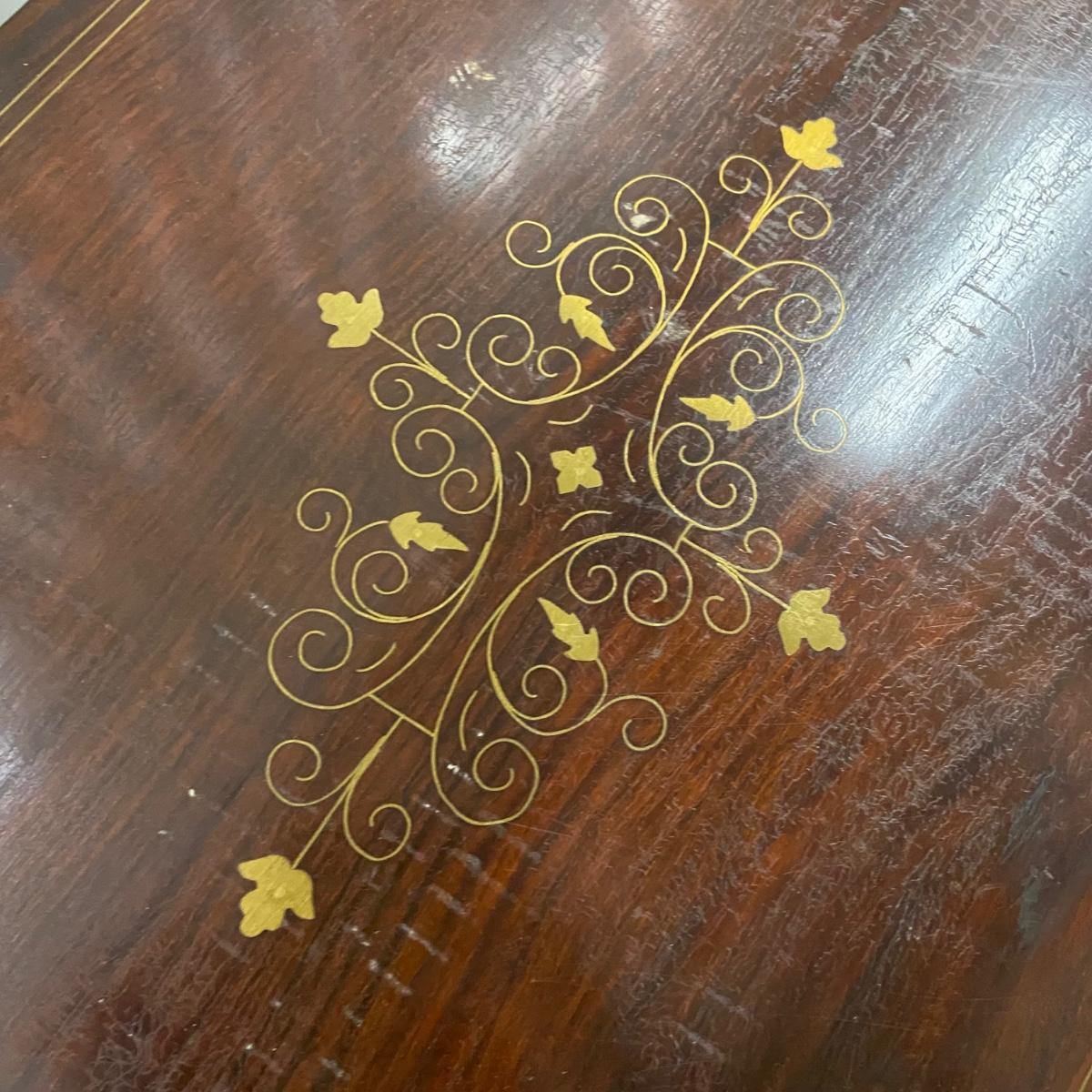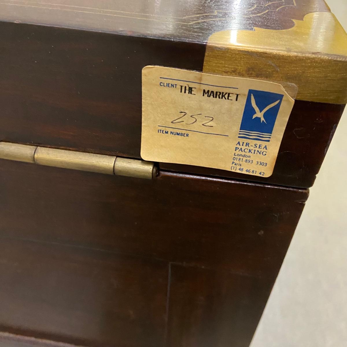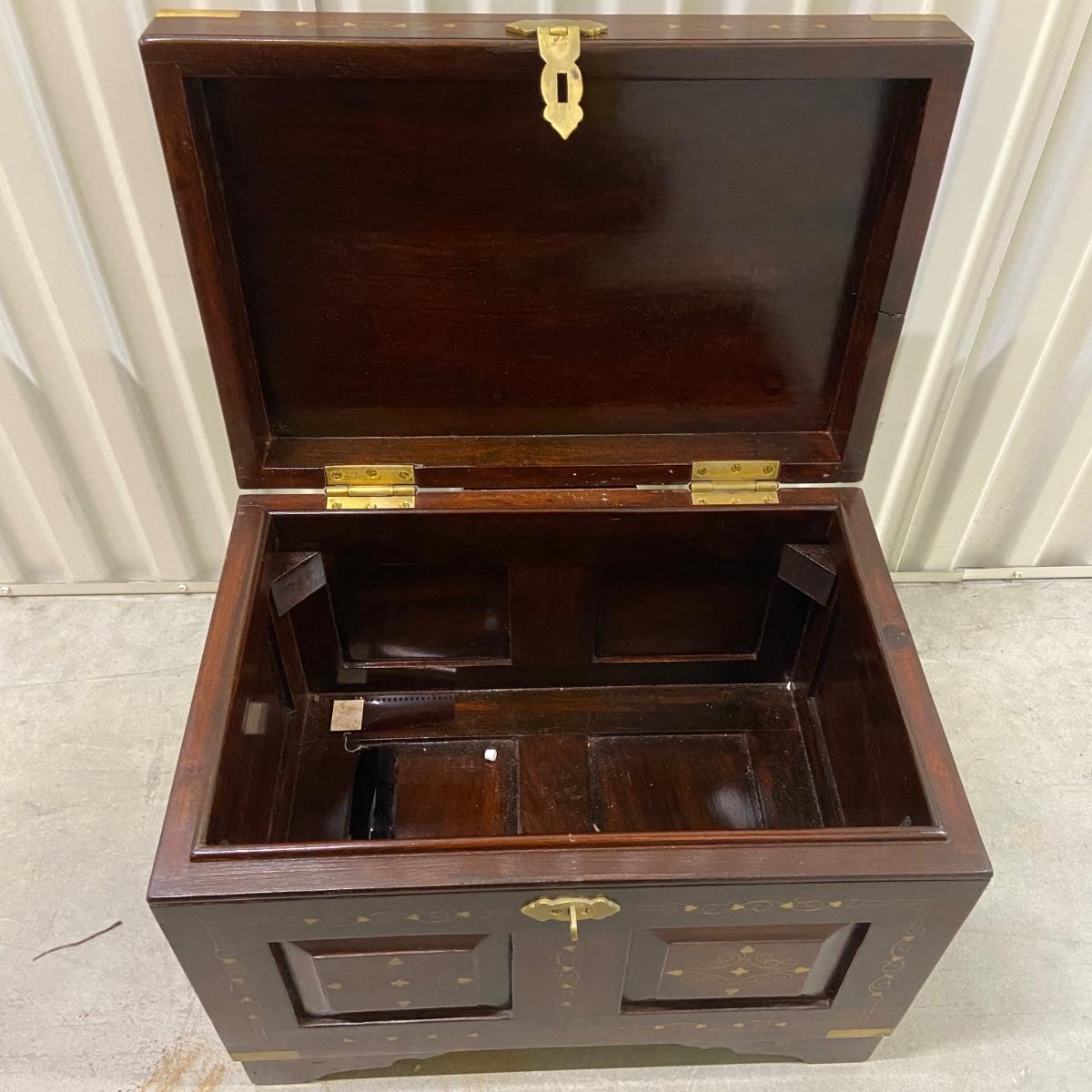 This gorgeous small chest has a stunning dark mahogany color with a lovely brass colored inlay. It measures 18” x 12” x 14”. This chest has hardware on the front so you could put a lock on it and the lid lifts open on hinges. Shipping available.