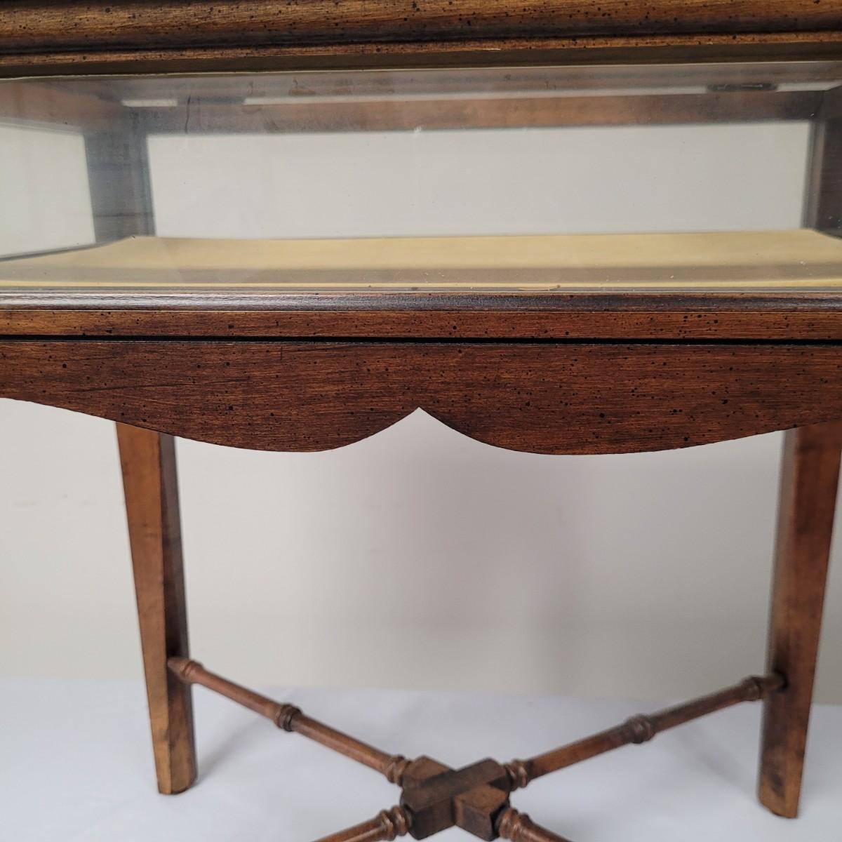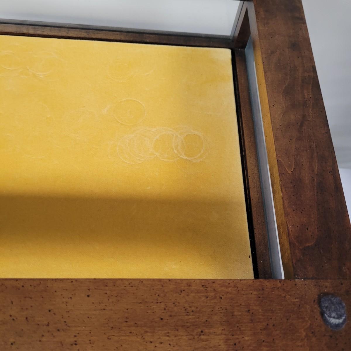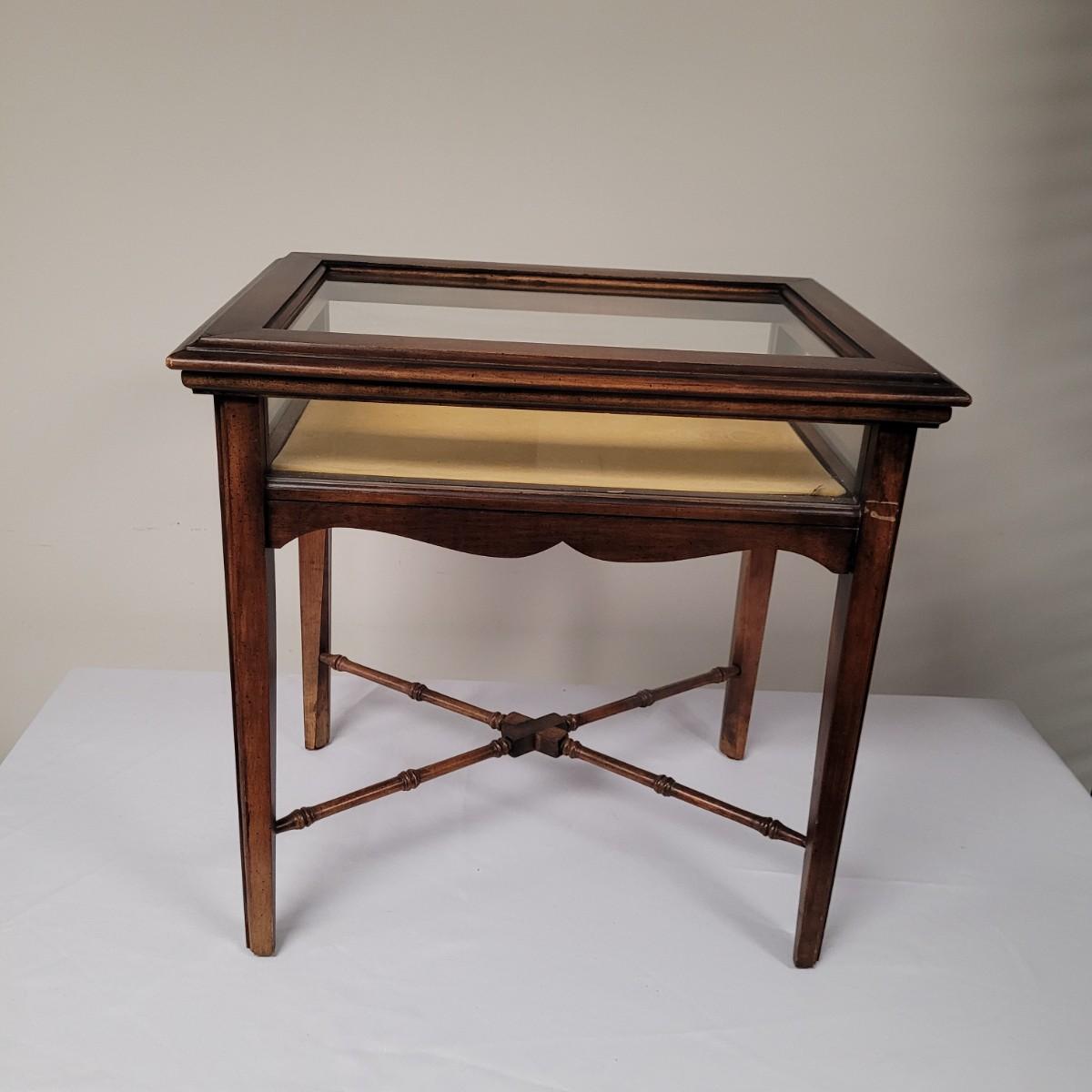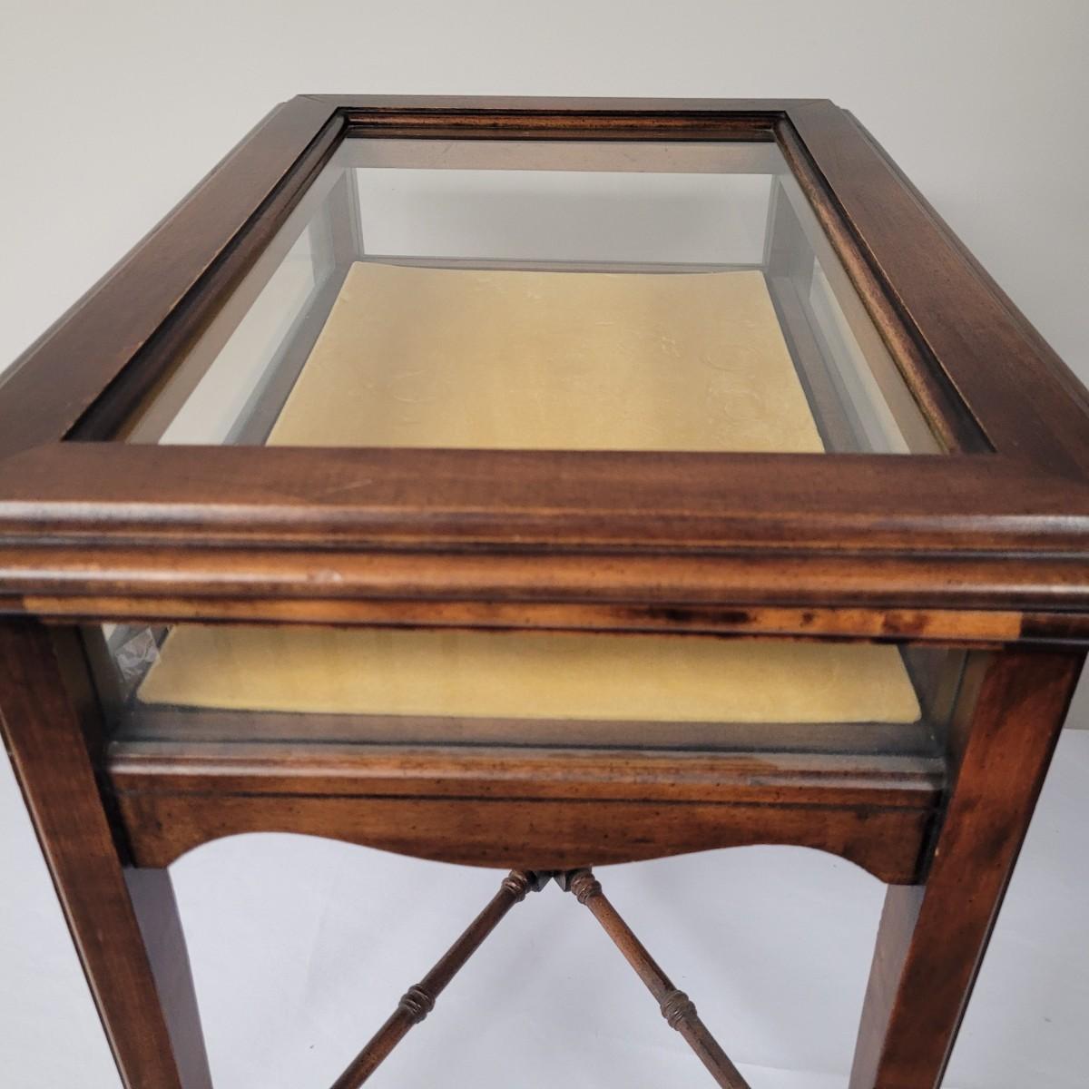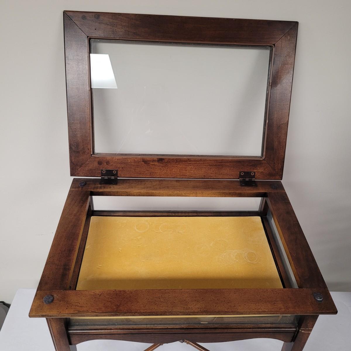 Small solid wood table with glass sides and top, which opens to hold small items for display. Velvet pad shows imprints from past use, and carries the odor of old items, however overall appears clean and dry. Table is sturdy and has a few scratches and knicks (see photos). Measures approximately 21"L x15"D x21"H. Local pickup only.