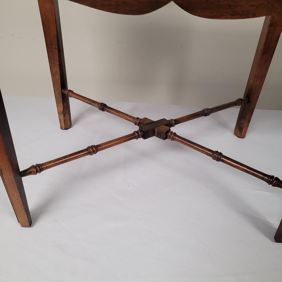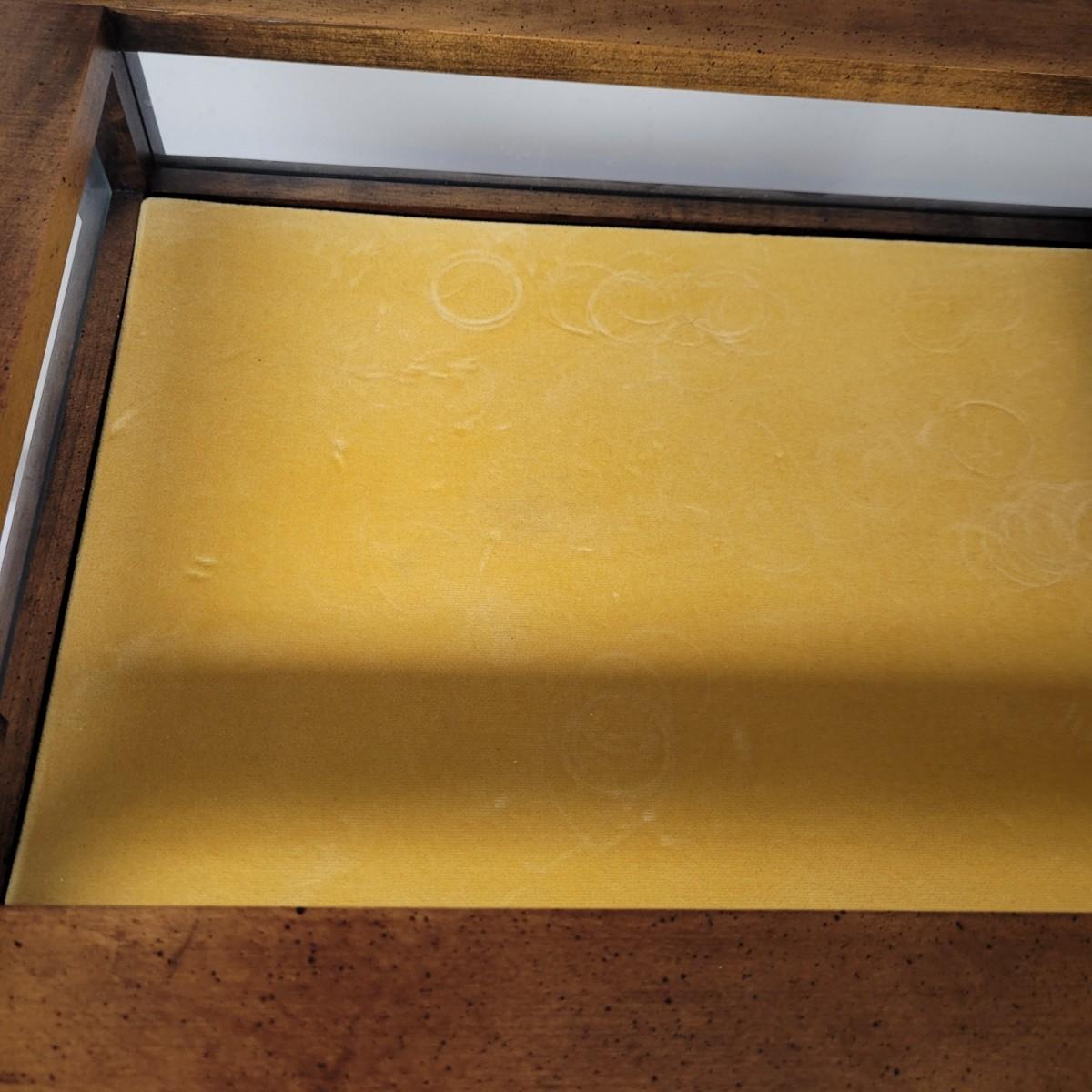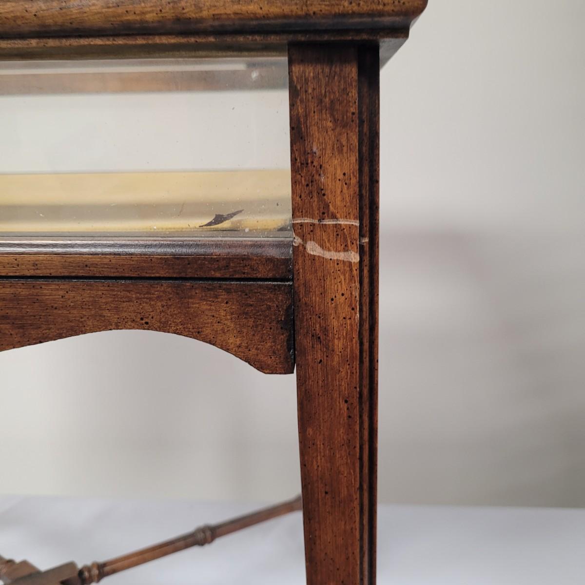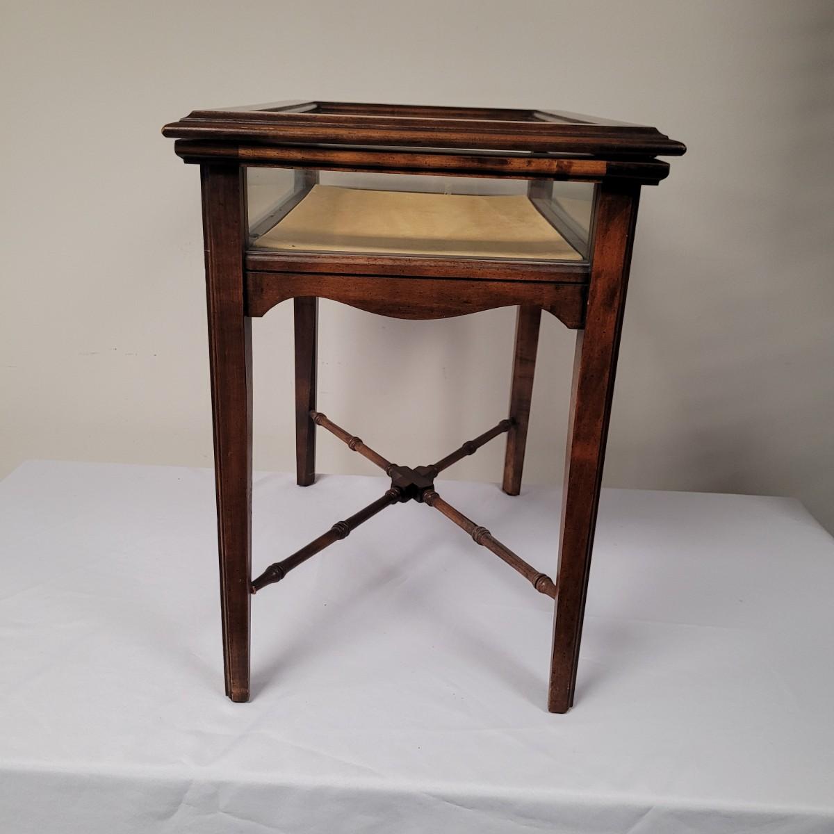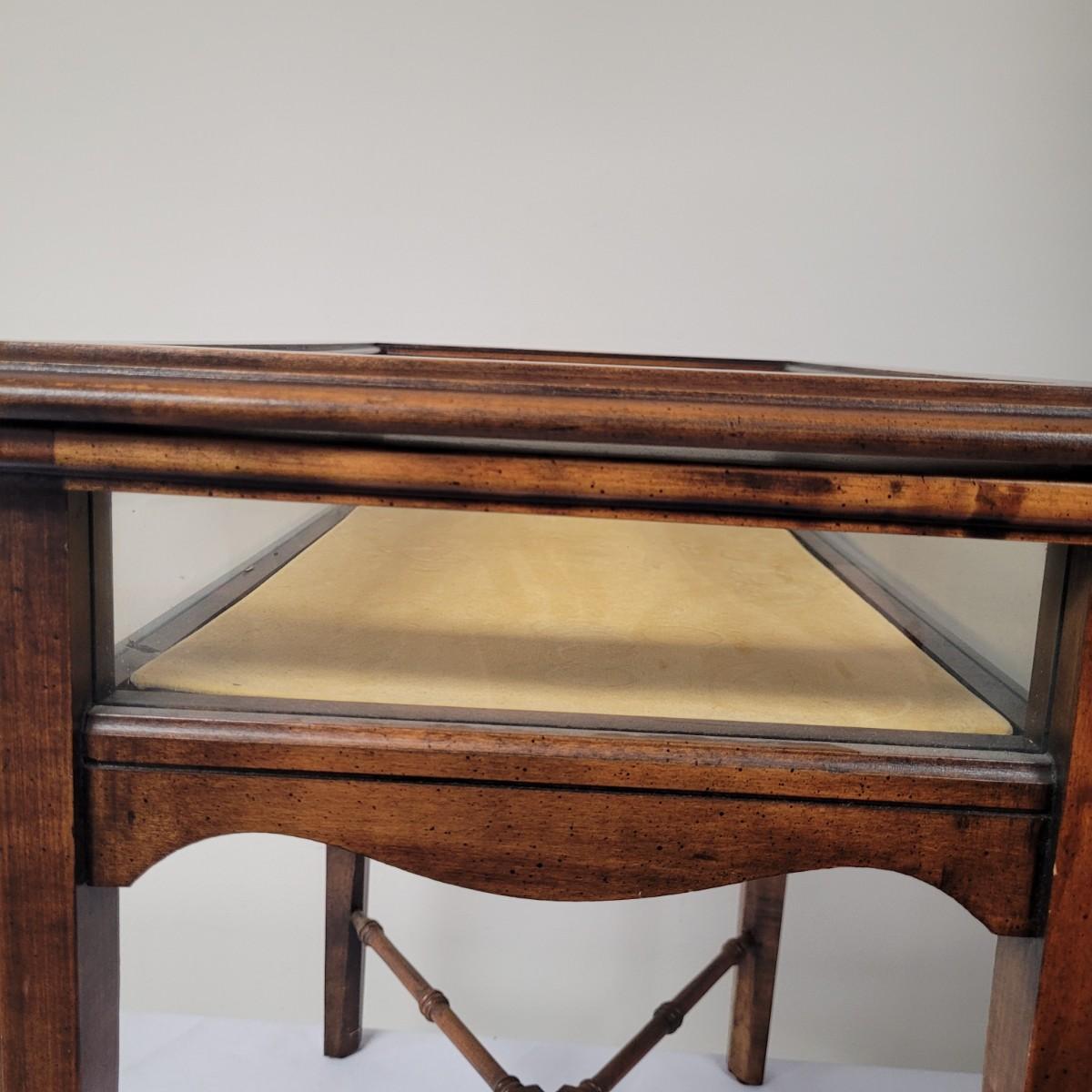 Small solid wood table with glass sides and top, which opens to hold small items for display. Velvet pad shows imprints from past use, and carries the odor of old items, however overall appears clean and dry. Table is sturdy and has a few scratches and knicks (see photos). Measures approximately 21"L x15"D x21"H. Local pickup only.