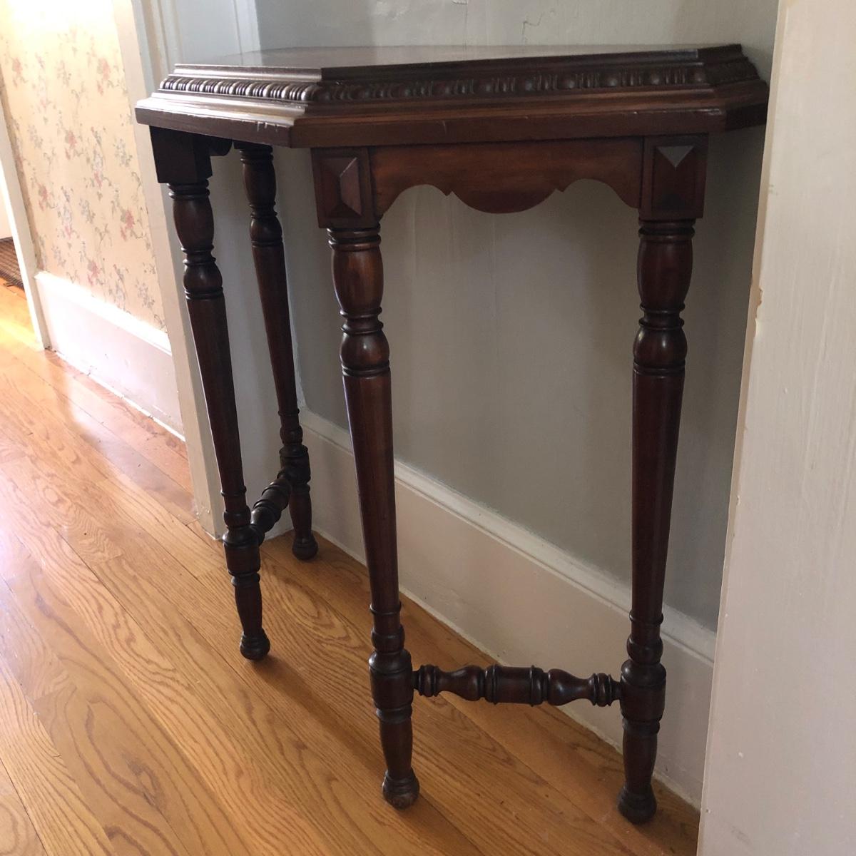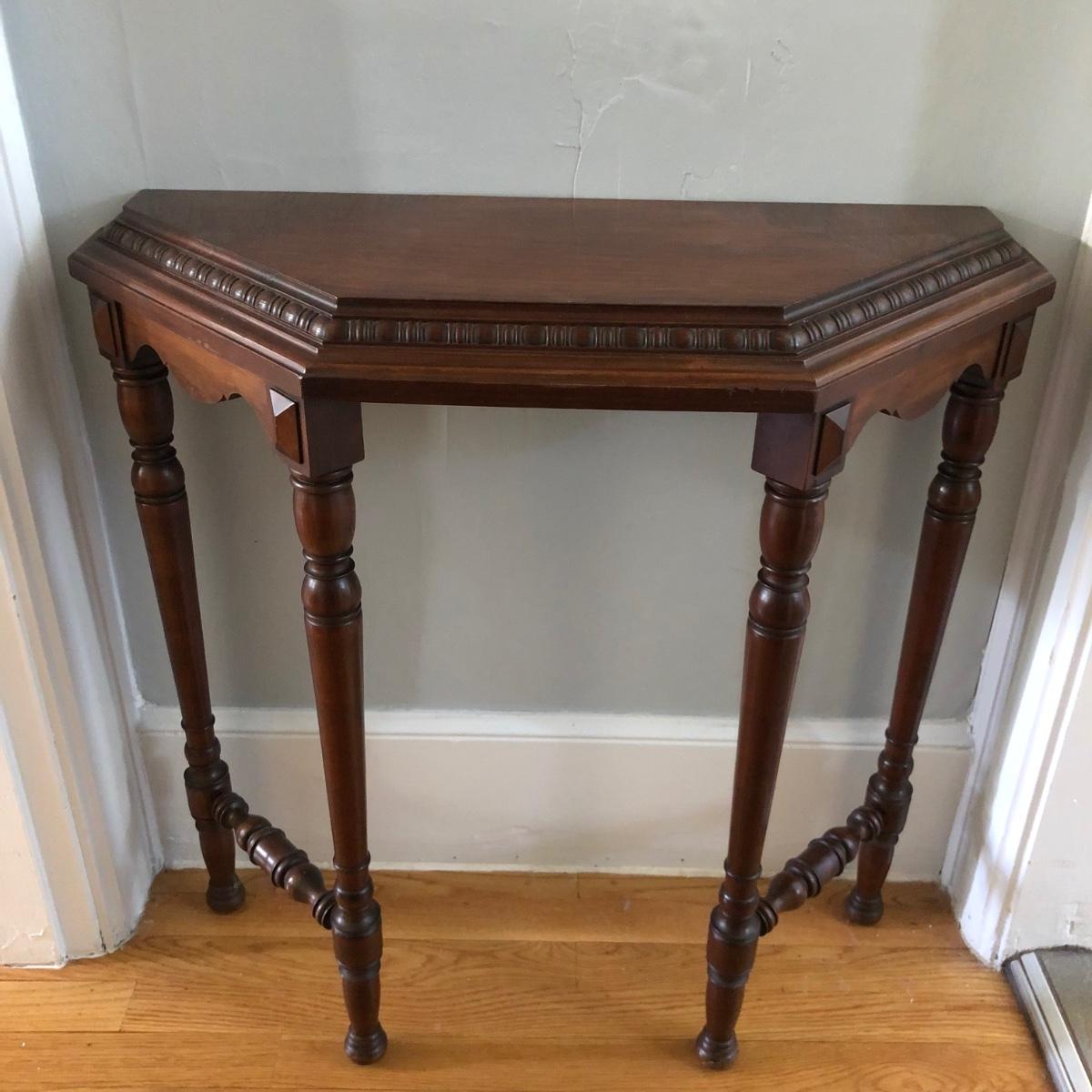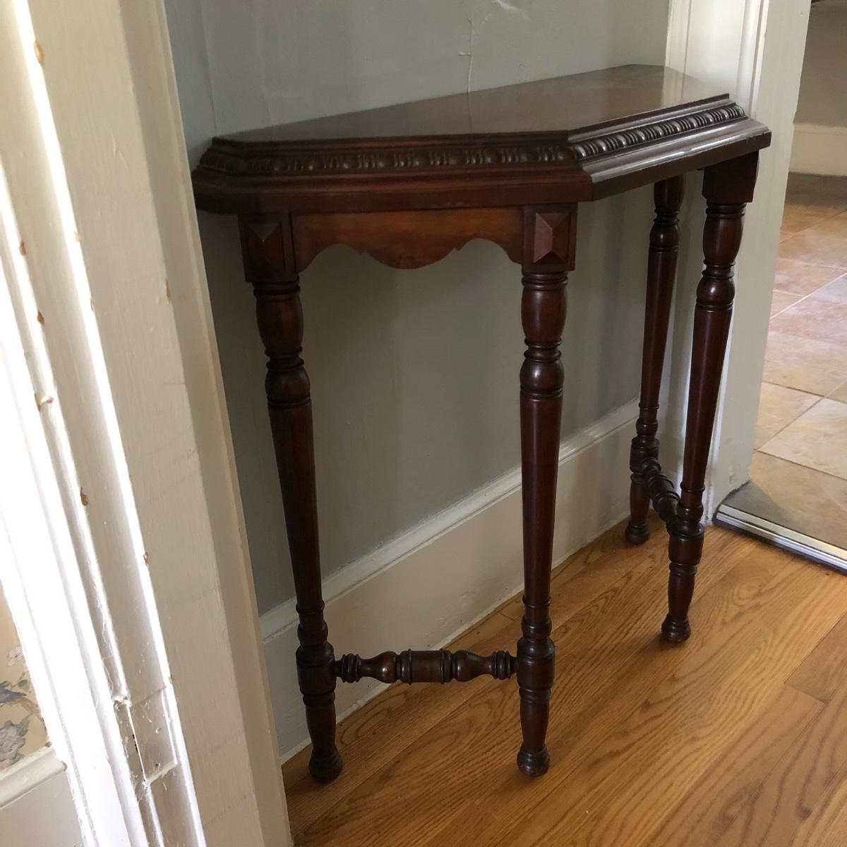 This small lightweight wooden entryway table is solid dark wood. It fits flush against the wall as pictured and has carved details. The 4-legged table measures 2’ 6.5” x 2’ 5.5” x 11.5”. There are some small areas on the surface of the table that are lighter colored possible from water sitting on the surface in the past, and some small nicks in the surface as well. Local pickup only.