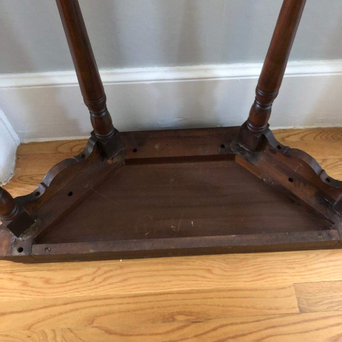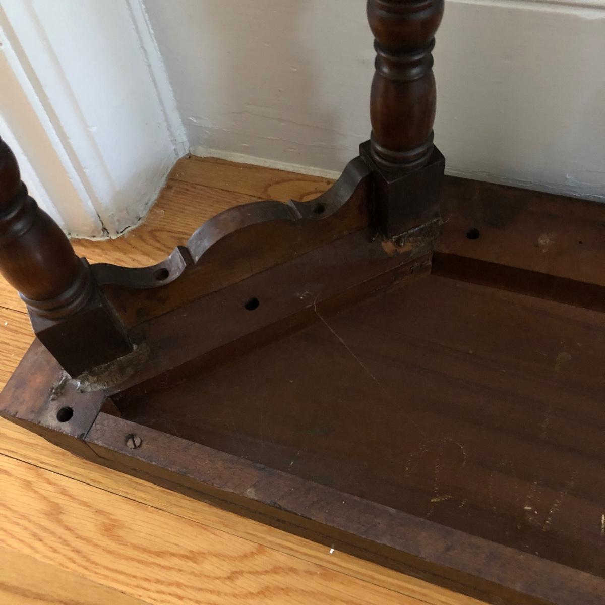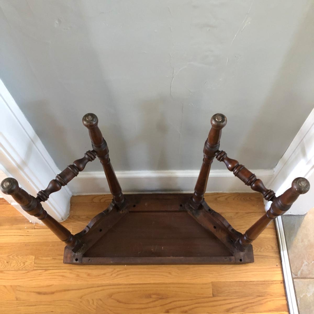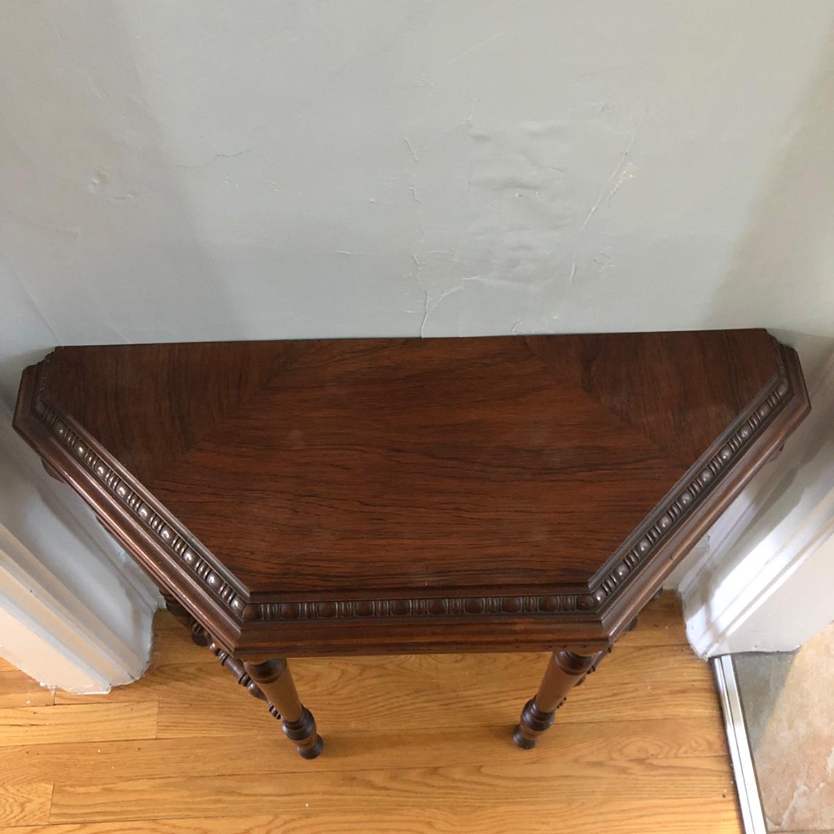 This small lightweight wooden entryway table is solid dark wood. It fits flush against the wall as pictured and has carved details. The 4-legged table measures 2’ 6.5” x 2’ 5.5” x 11.5”. There are some small areas on the surface of the table that are lighter colored possible from water sitting on the surface in the past, and some small nicks in the surface as well. Local pickup only.
