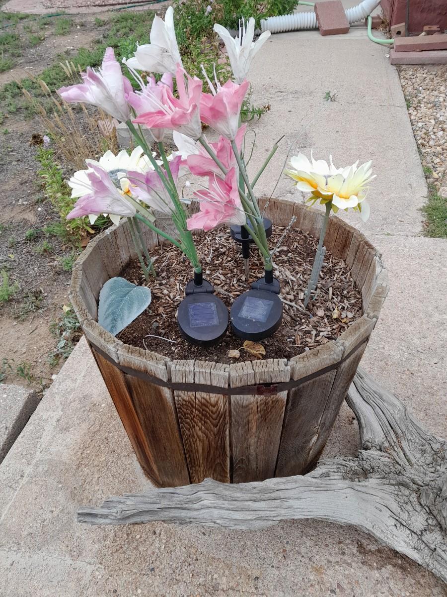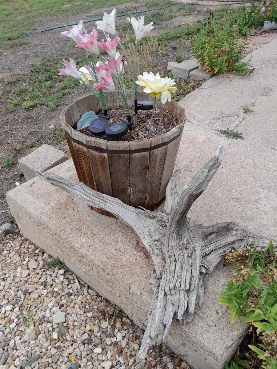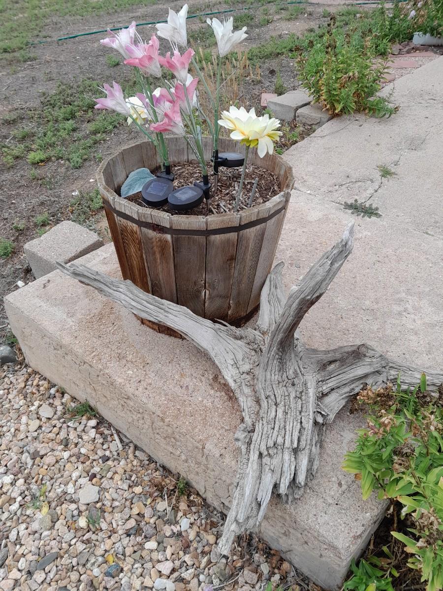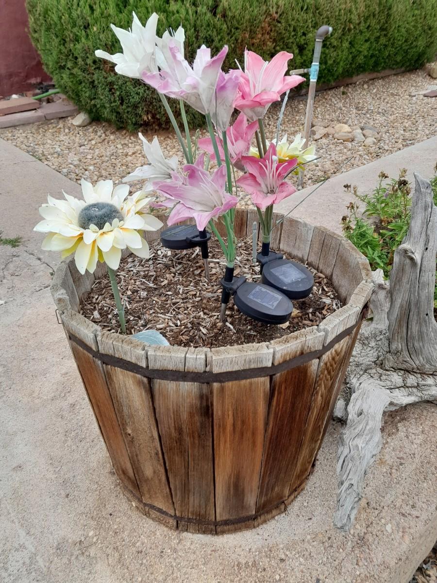 SMALL WOODEN FLOWERPOT BARREL 16" X 19", SOLAR FLORAL STAKES, AND LANSDCAPE STUMP