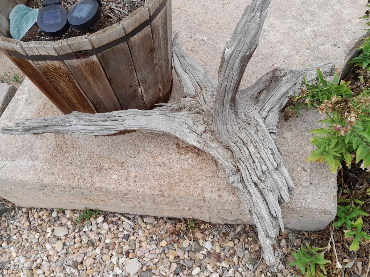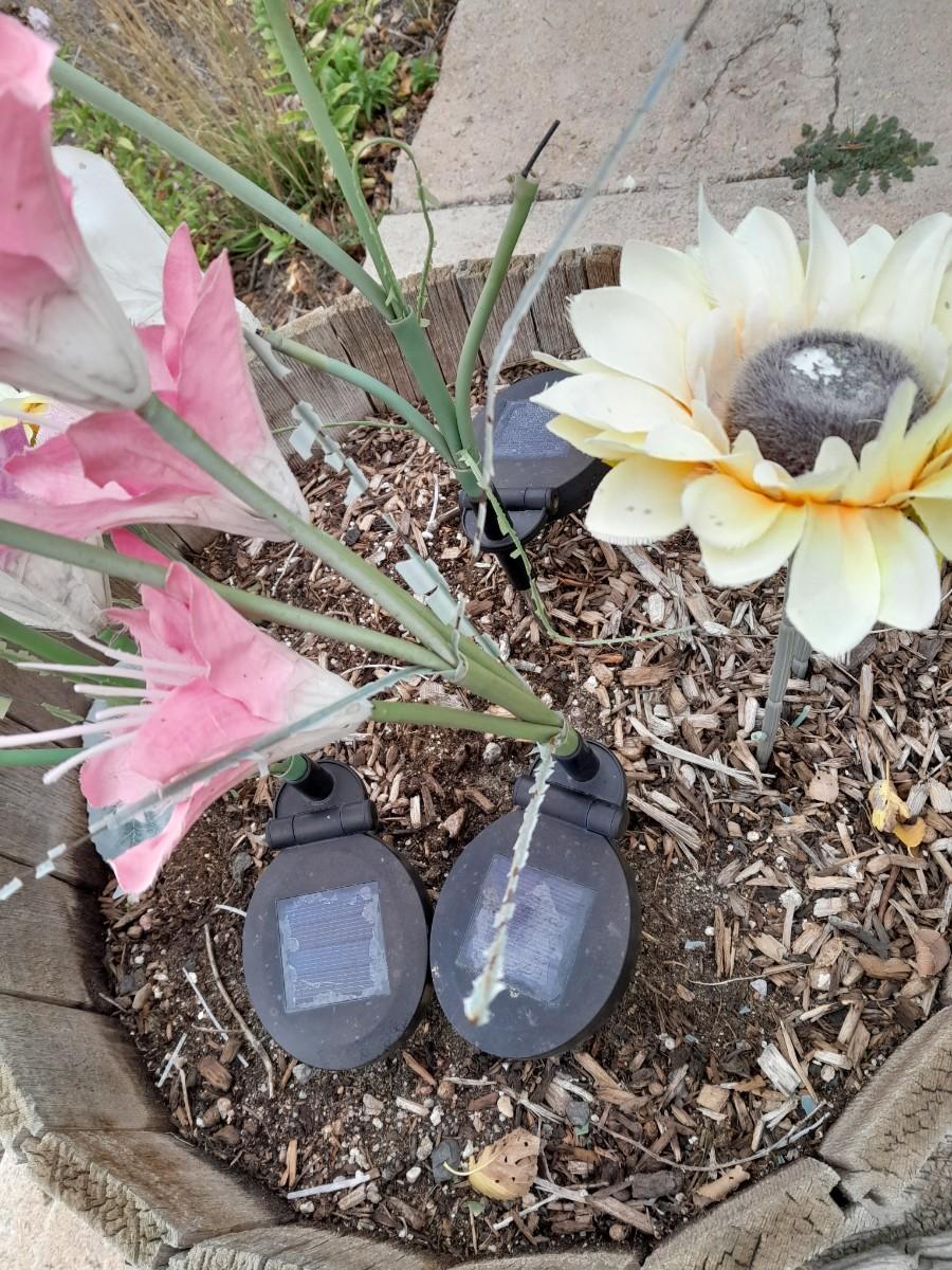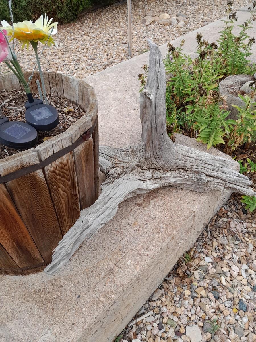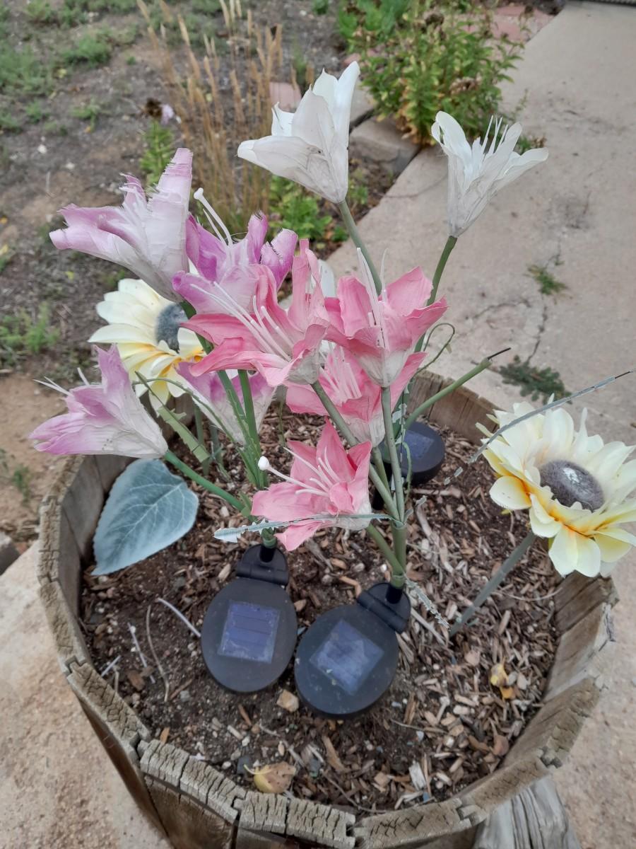SMALL WOODEN FLOWERPOT BARREL 16" X 19", SOLAR FLORAL STAKES, AND LANSDCAPE STUMP
