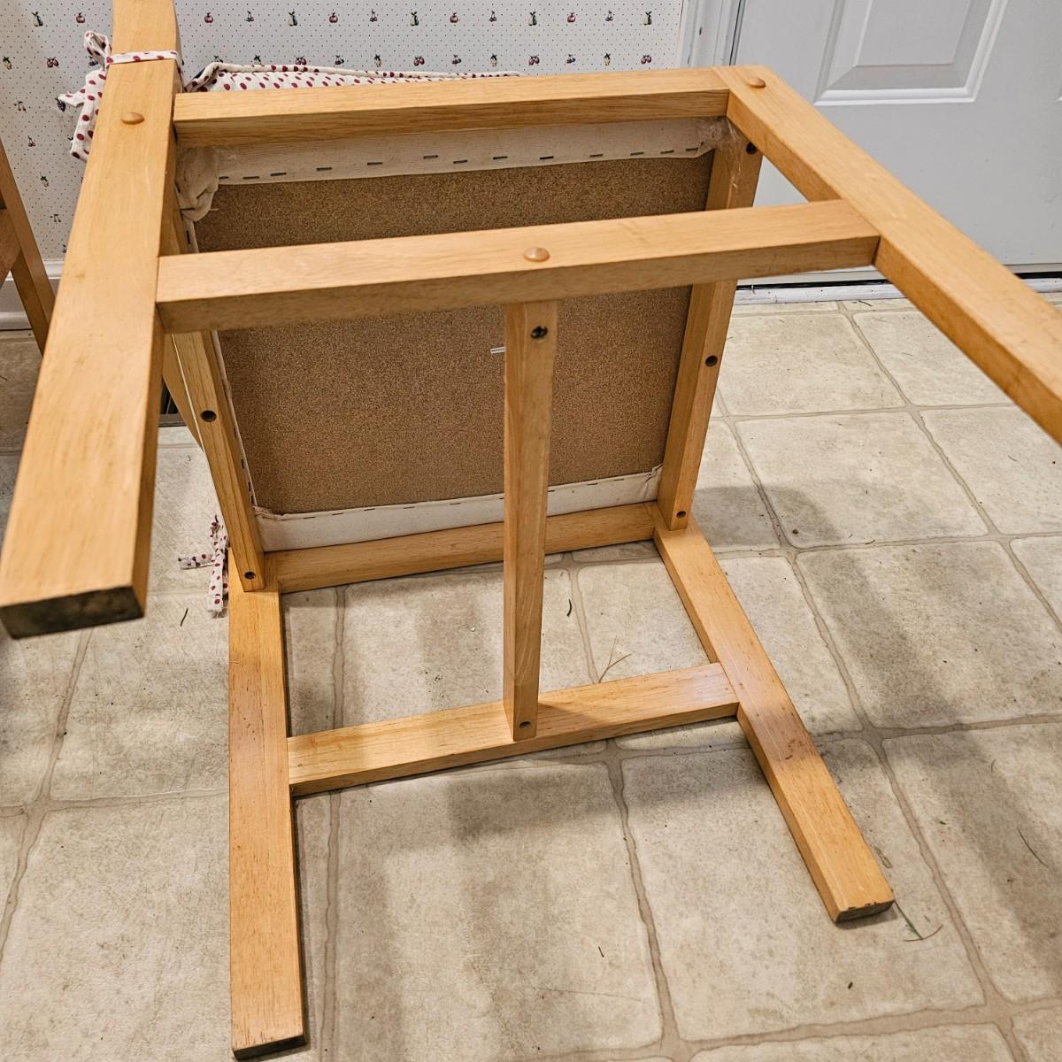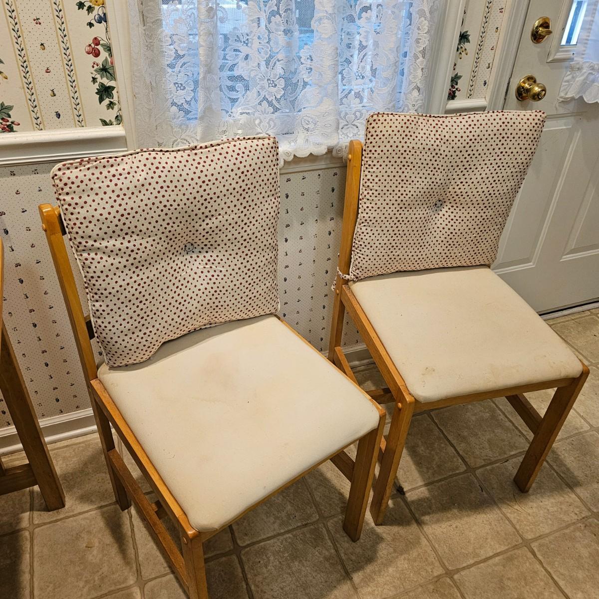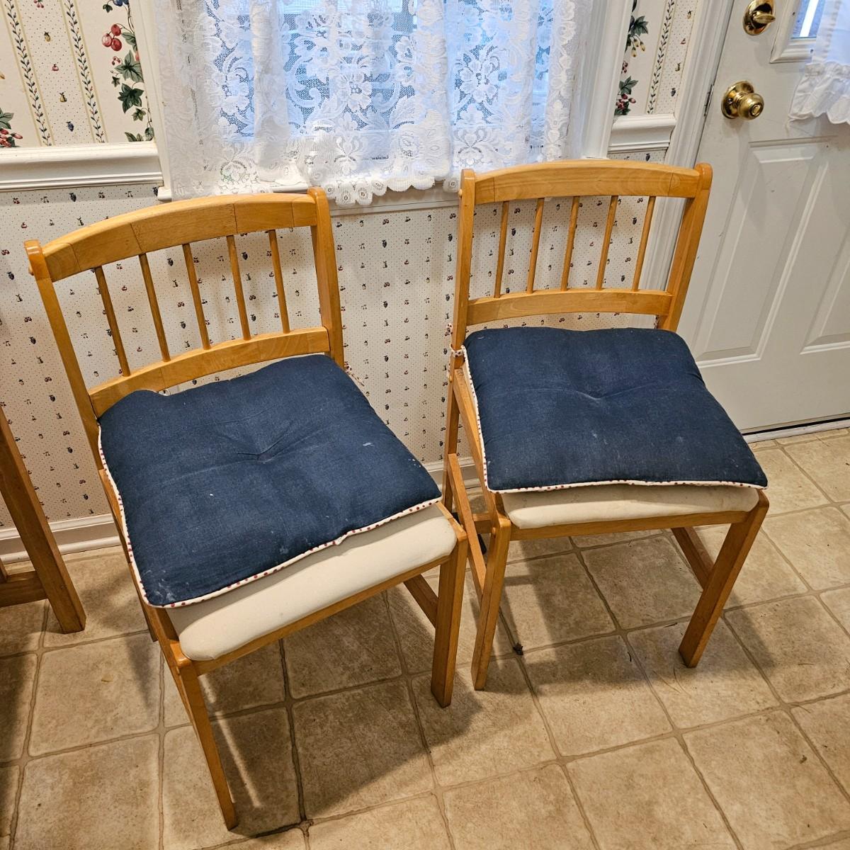 A nice petite set for a kitchen nook or otherwise. Table and chairs appear to be maple. Top of table shows wear and some scratches. Table measures 24" x 35" x 30"H. Chairs are 17" x 19" x 33"H, have 19"seat height. Two add on pads/back rests included. See photos for details. Local pickup only.