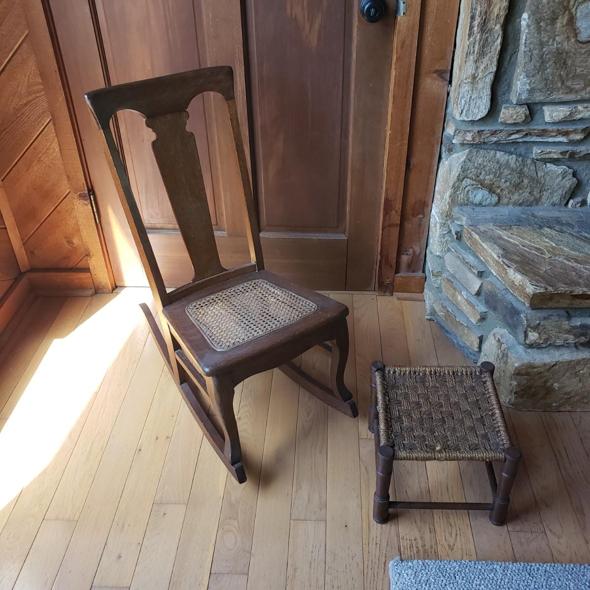 This smaller rocker features a cane seat. The rocker measures 16" x 29" x 32"H with a seat height of 14". There is a small area where the cane is separated, see picture. It appears to feel solid otherwise. The small stool features horse hair weaves with a wooden base. The stool measures 12" x 12" x 9"H.