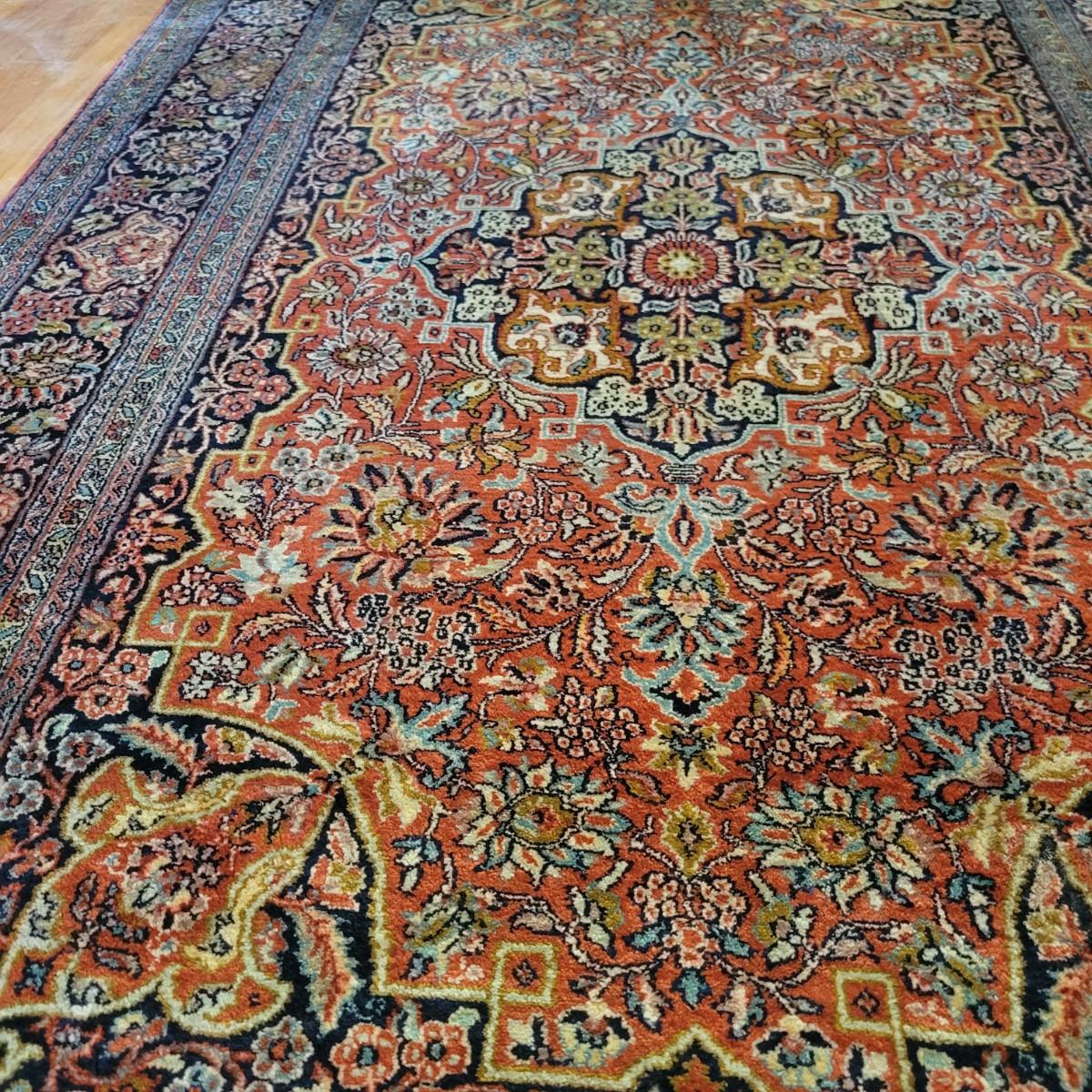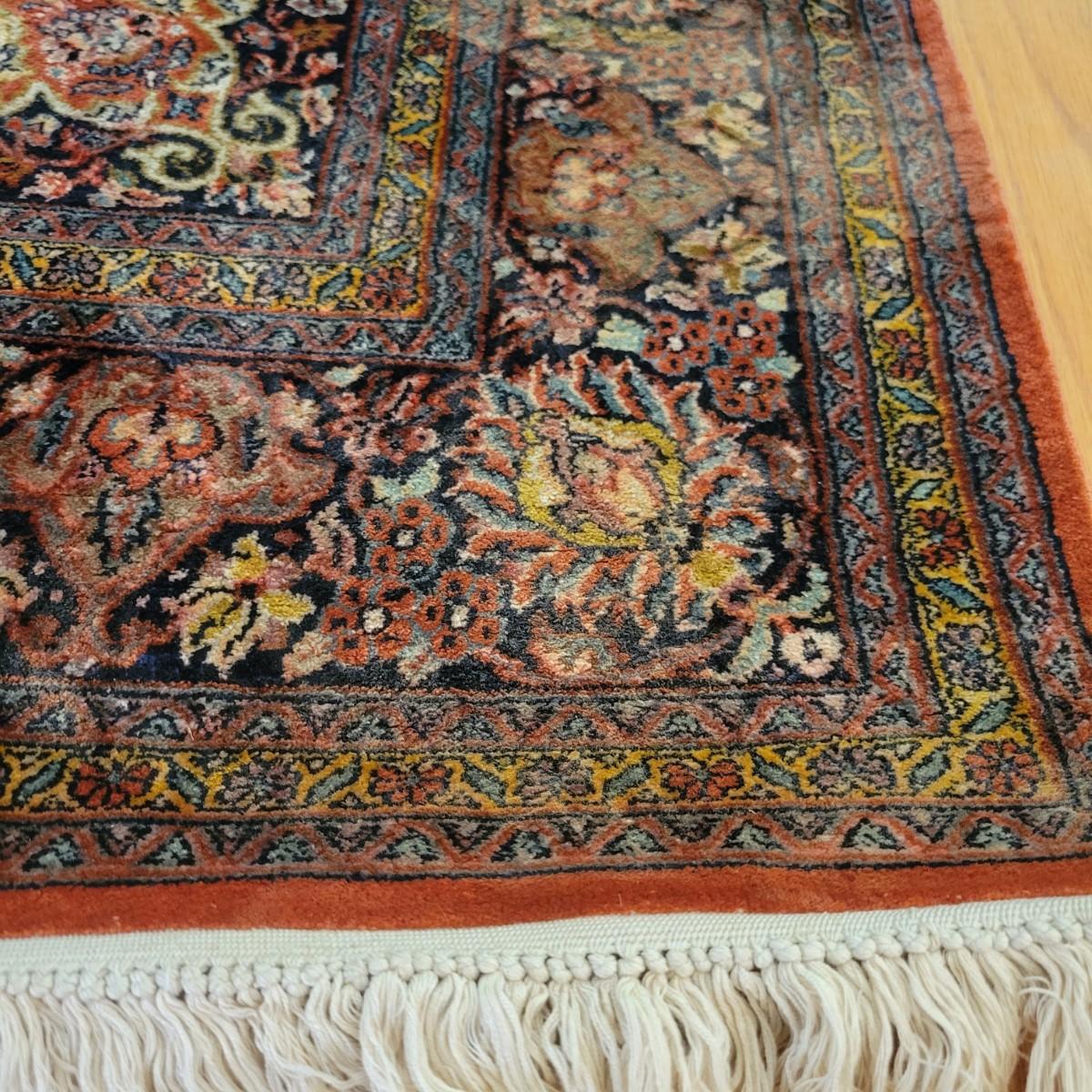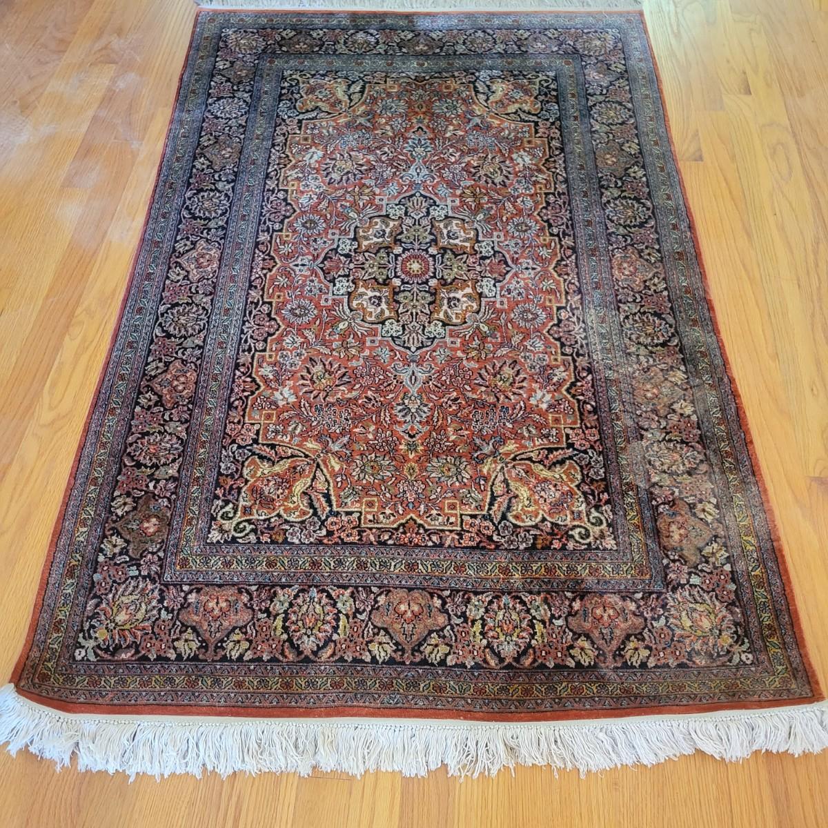A small rug in good condition with no stains, but the tassels are a little dirty. Rug appears to be wool, but we cannot guarantee so as there is no tag. This rug features rich colors set on a black background. Measures approximately 62" x 37". Local pickup only