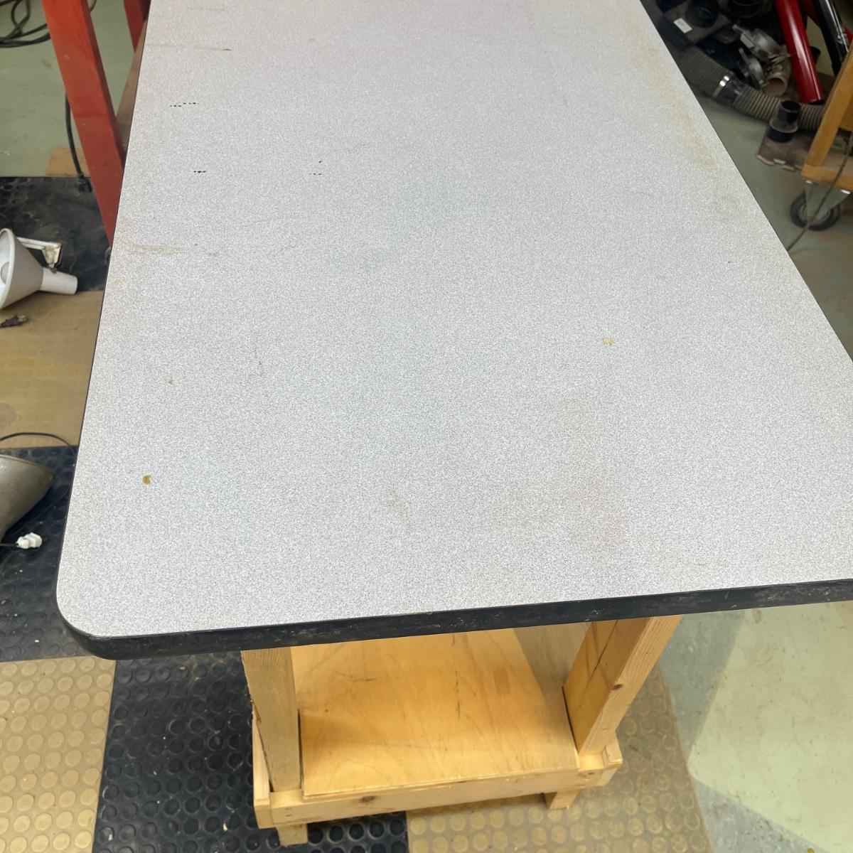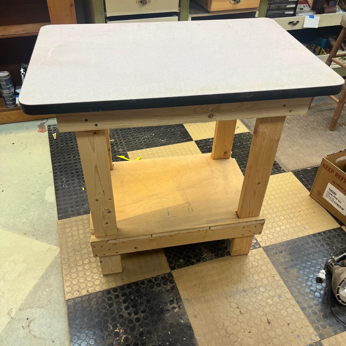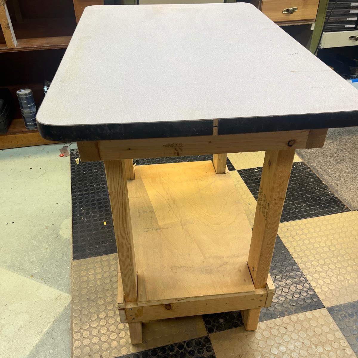 This wooden work bench has a Formica top with a shelf underneath. Bench measures 25.5” x 35.5” x 35”H. Top has some scratches and stains, see pictures.