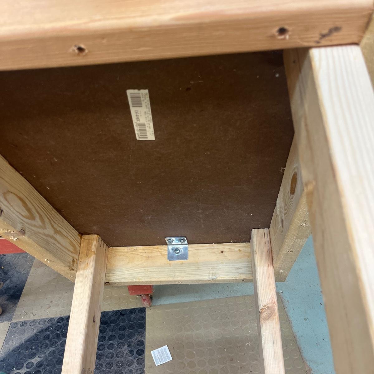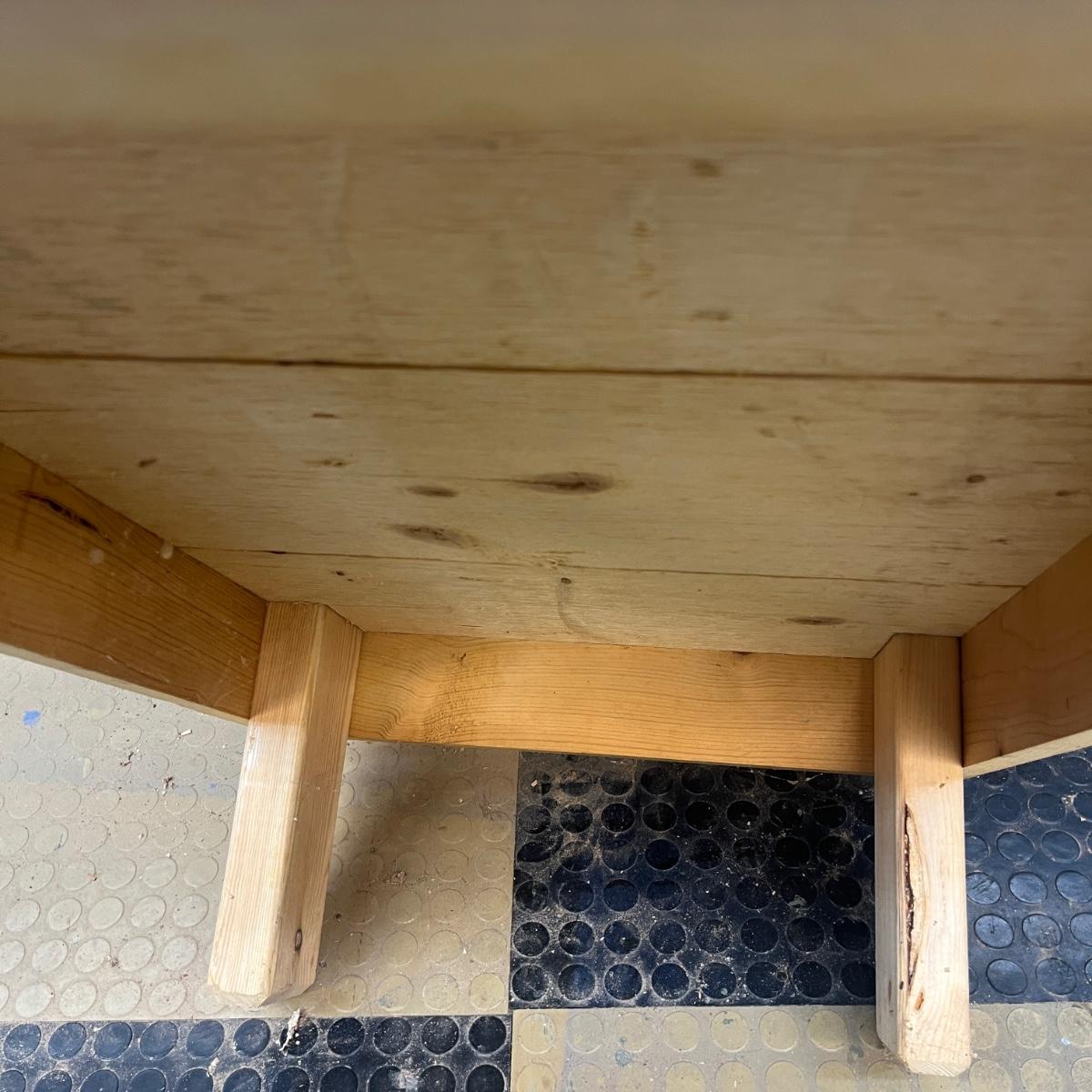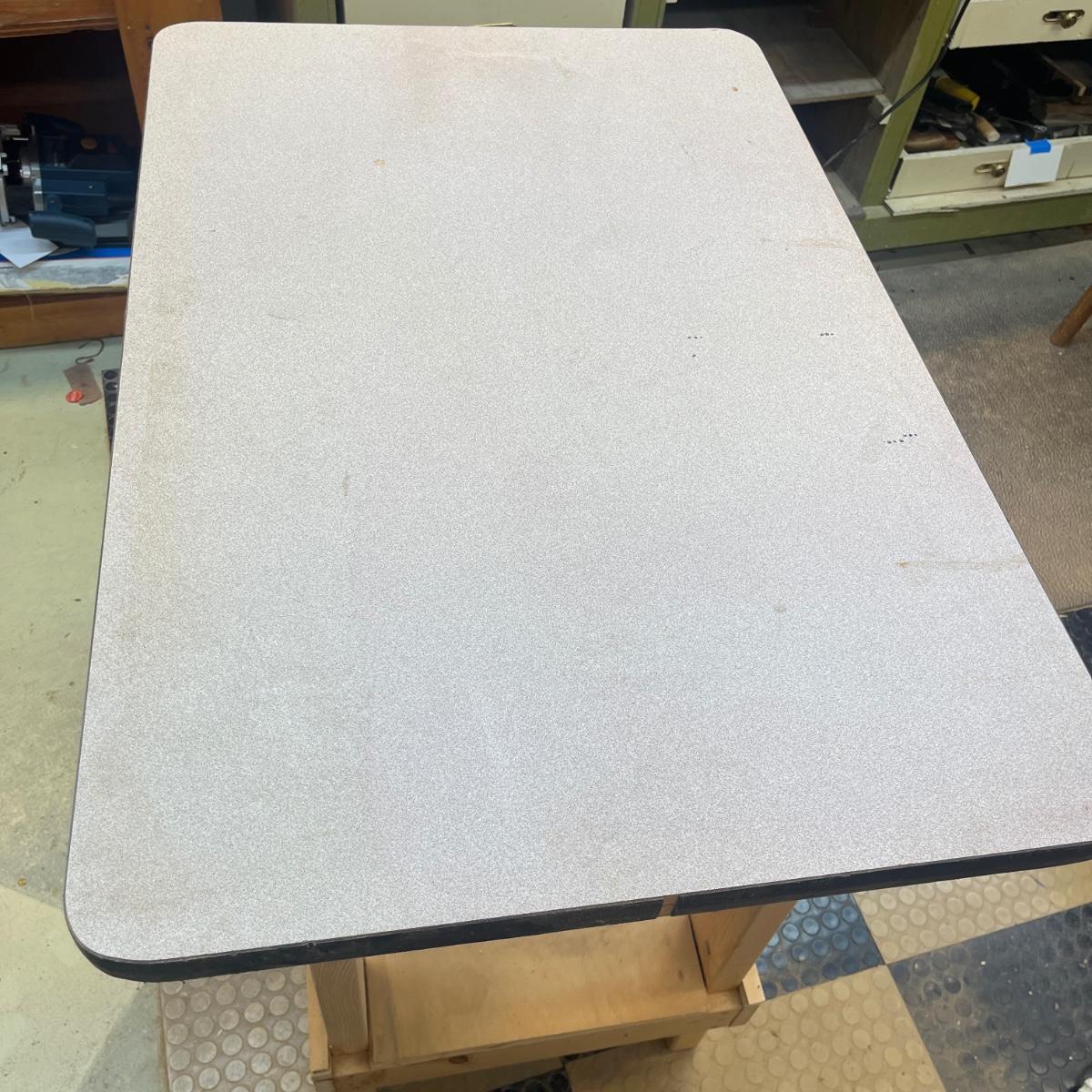This wooden work bench has a Formica top with a shelf underneath. Bench measures 25.5” x 35.5” x 35”H. Top has some scratches and stains, see pictures.