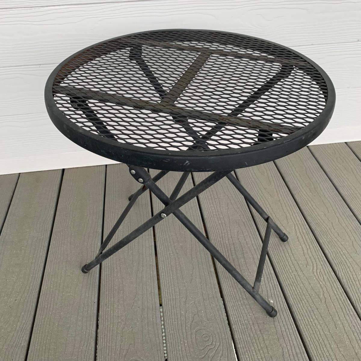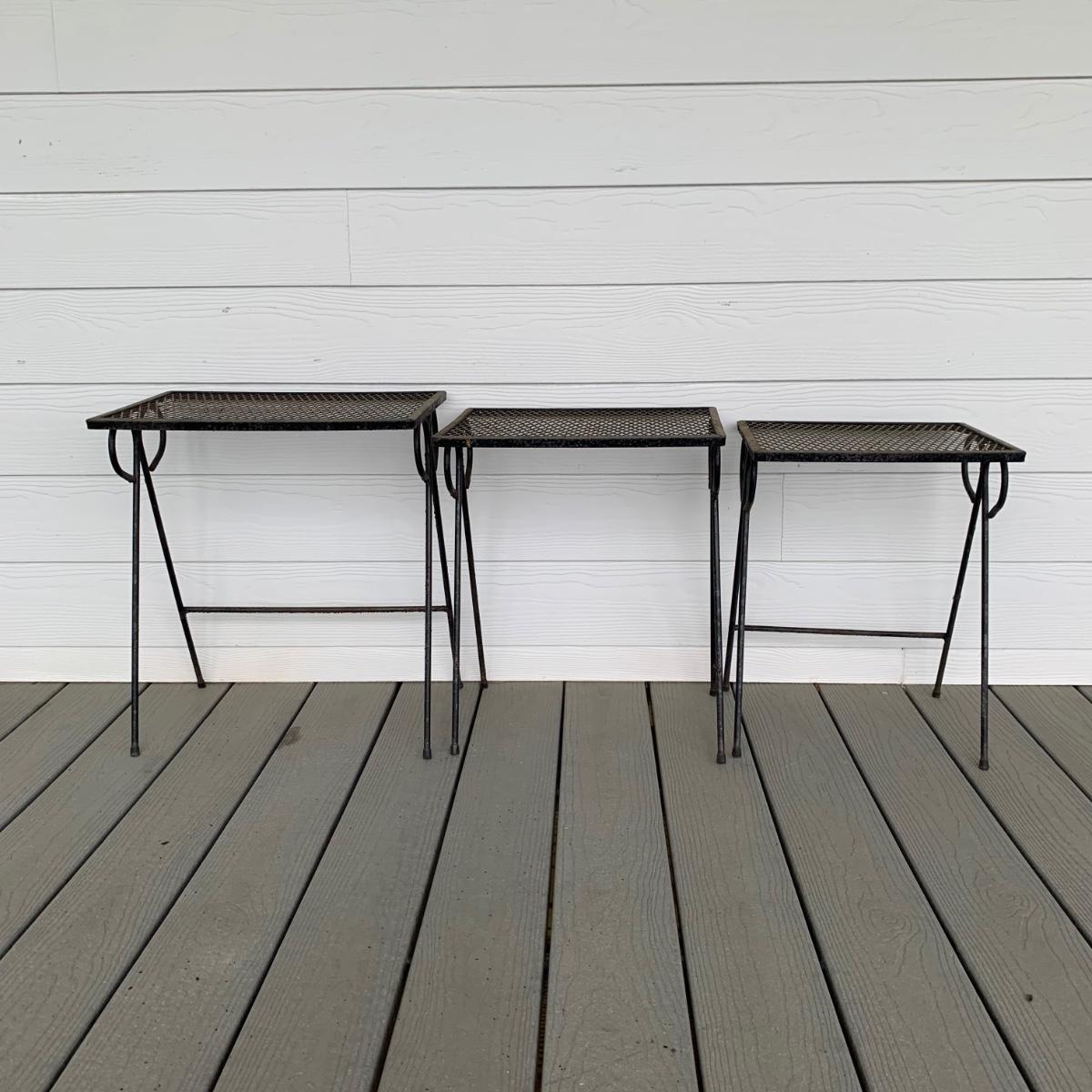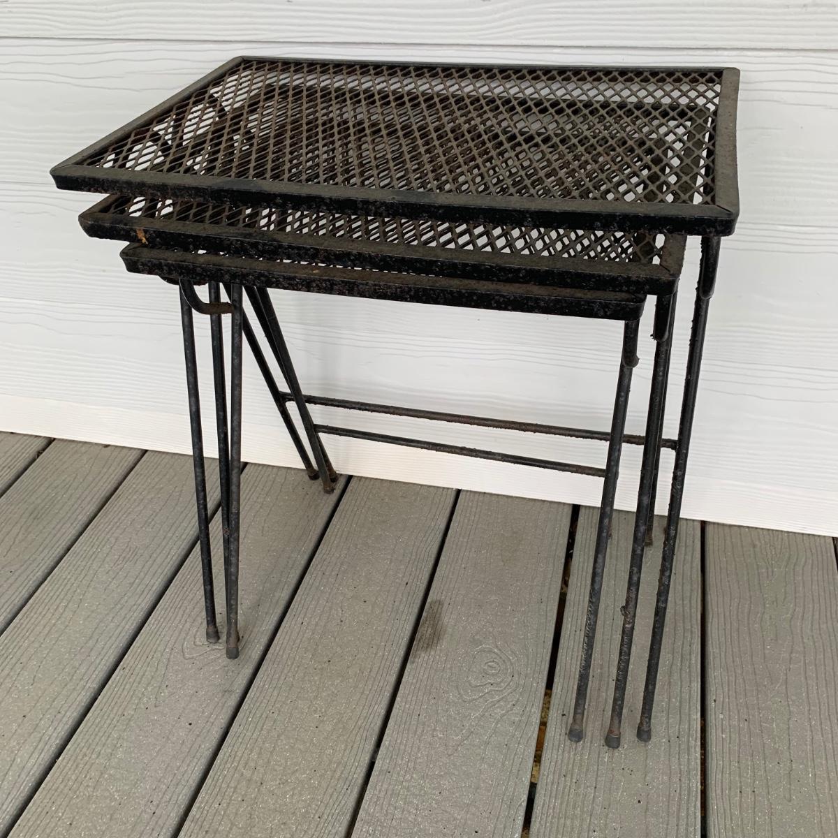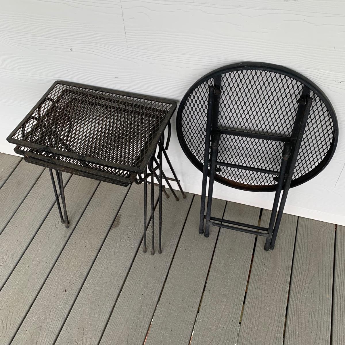 Four small wrought iron patio tables. The three rectangular tables are a nesting set. The round table is collapsible. Tables show some rust and wear from being used outdoors. The round table measures 20”D x 20”H.