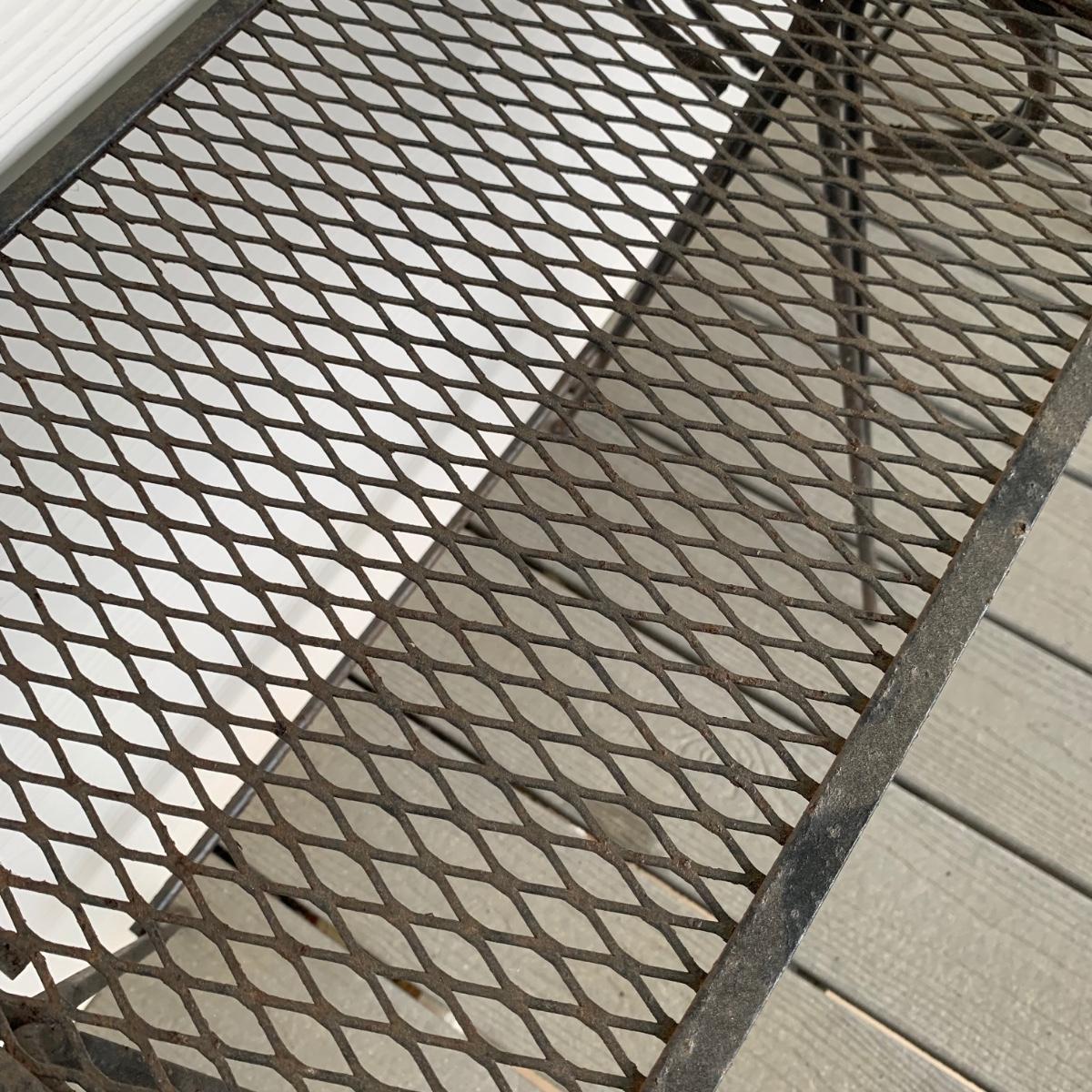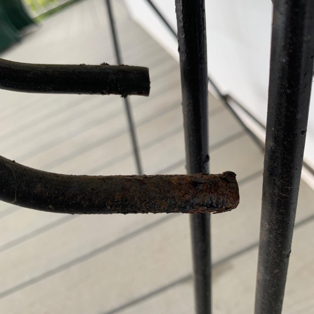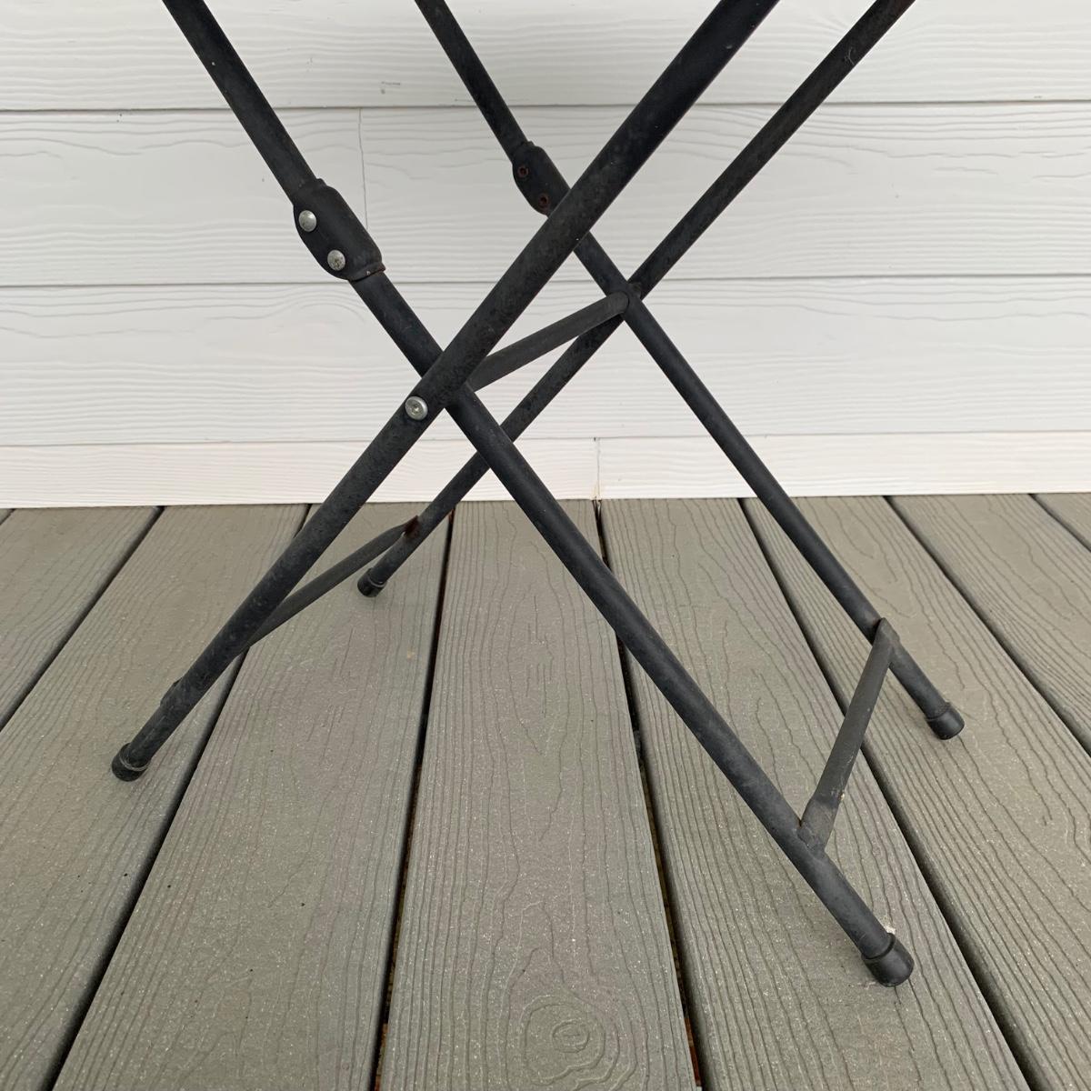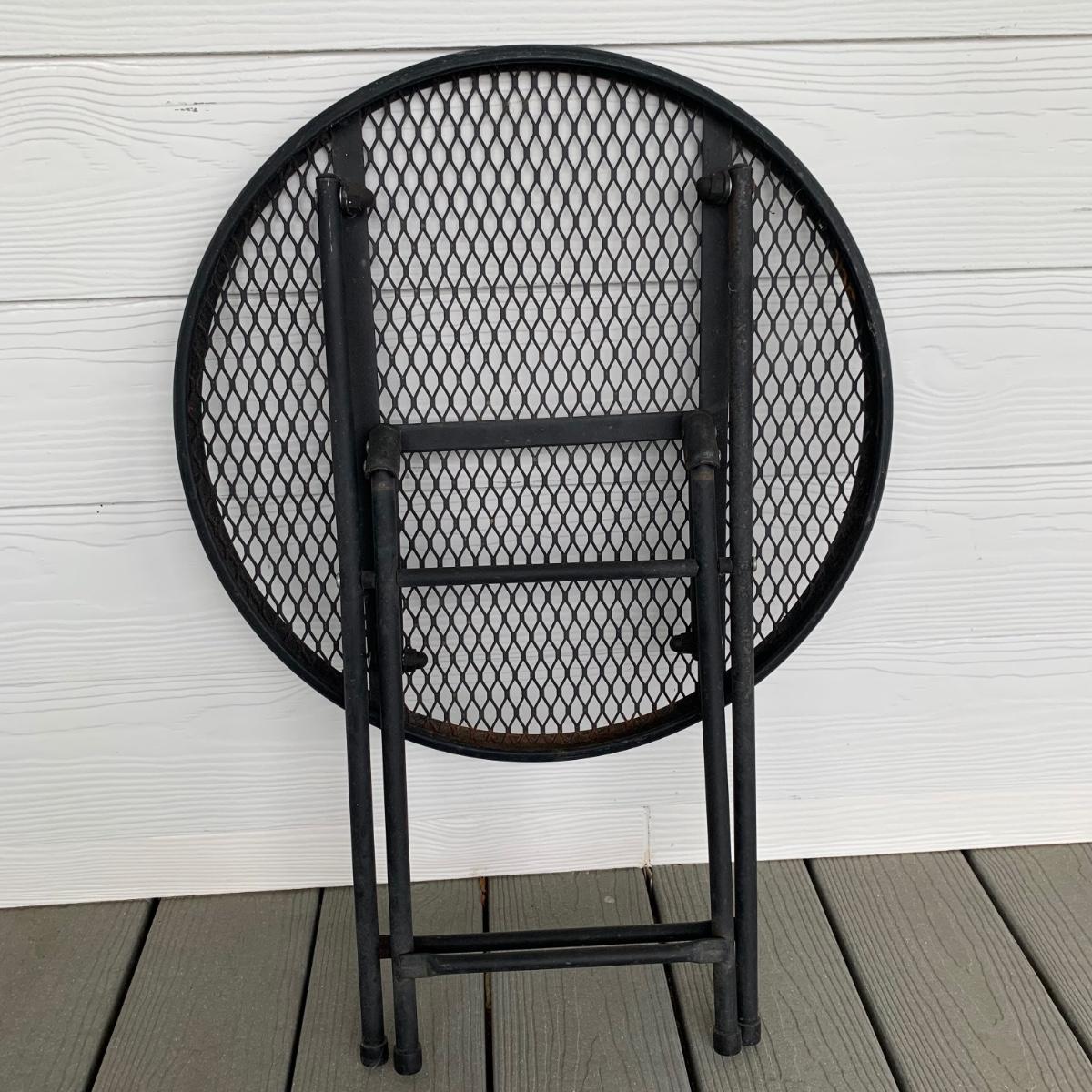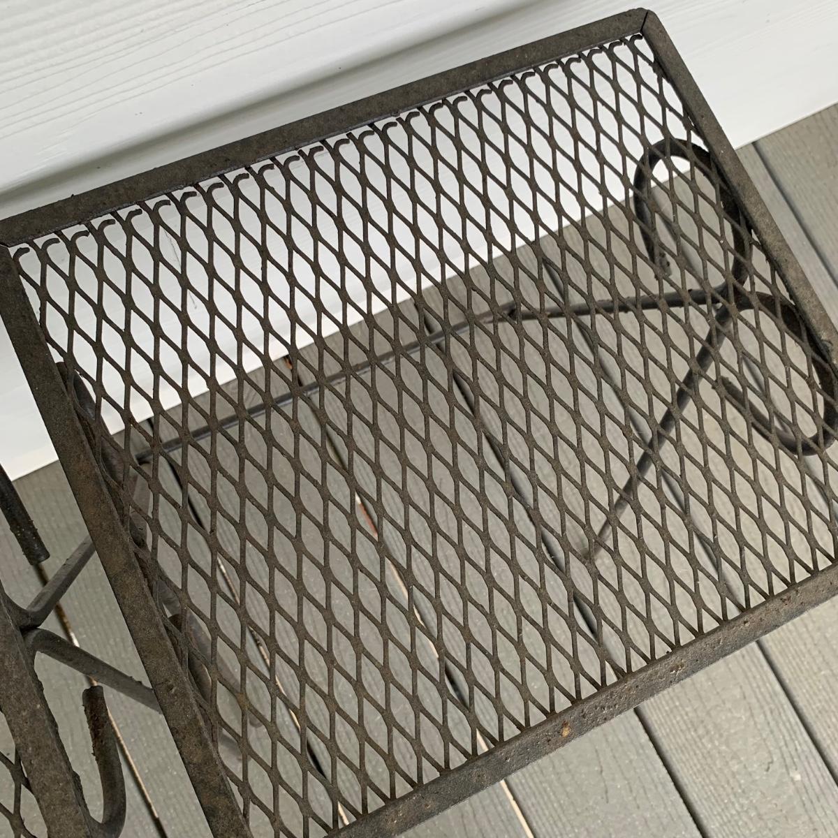 Four small wrought iron patio tables. The three rectangular tables are a nesting set. The round table is collapsible. Tables show some rust and wear from being used outdoors. The round table measures 20”D x 20”H.
