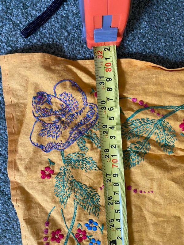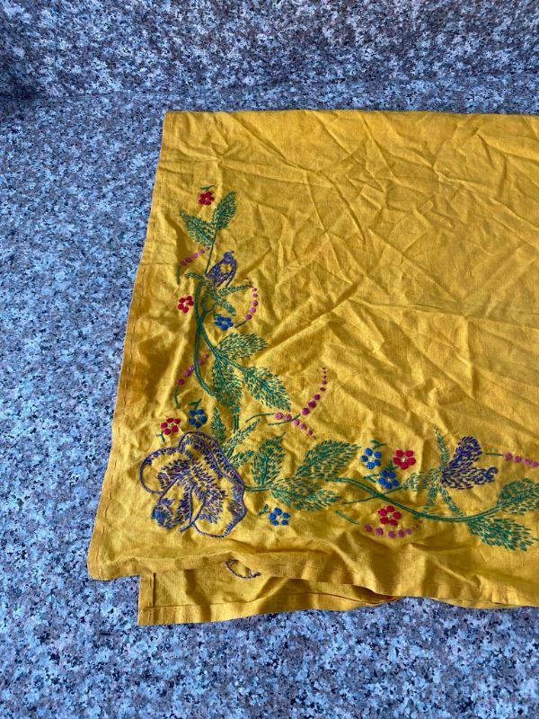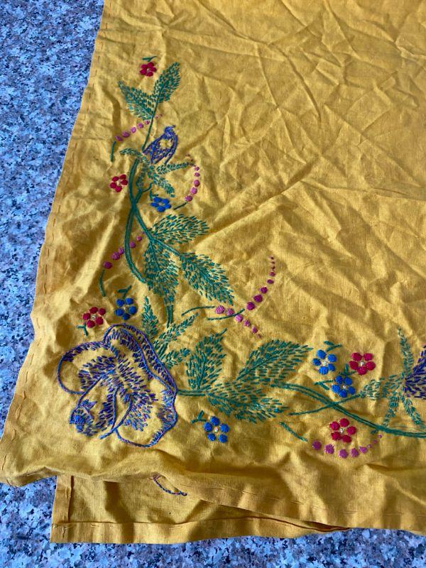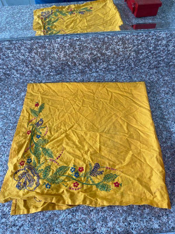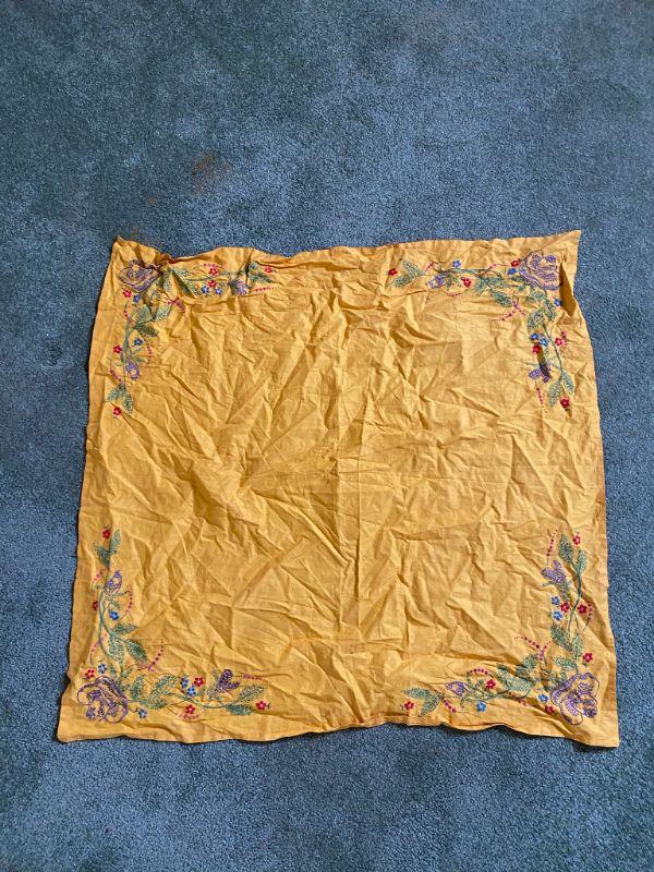 Yellow flower embroidered table cloth. Small square, about 32". Colorful pattern at the corners, Other then the wrinkles looked to be in good condition