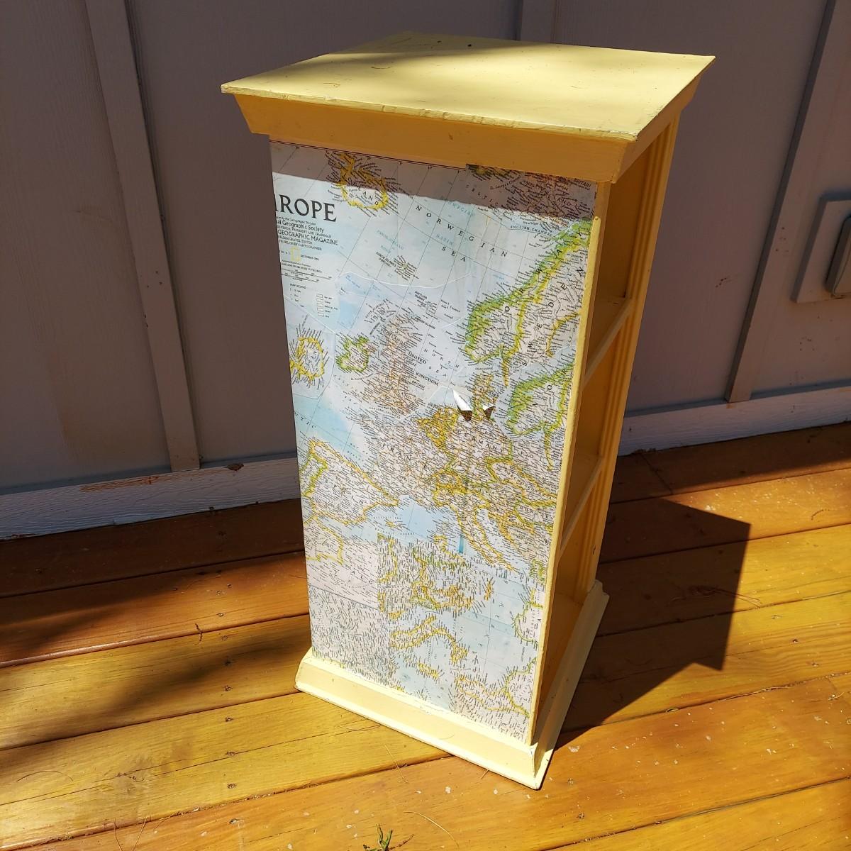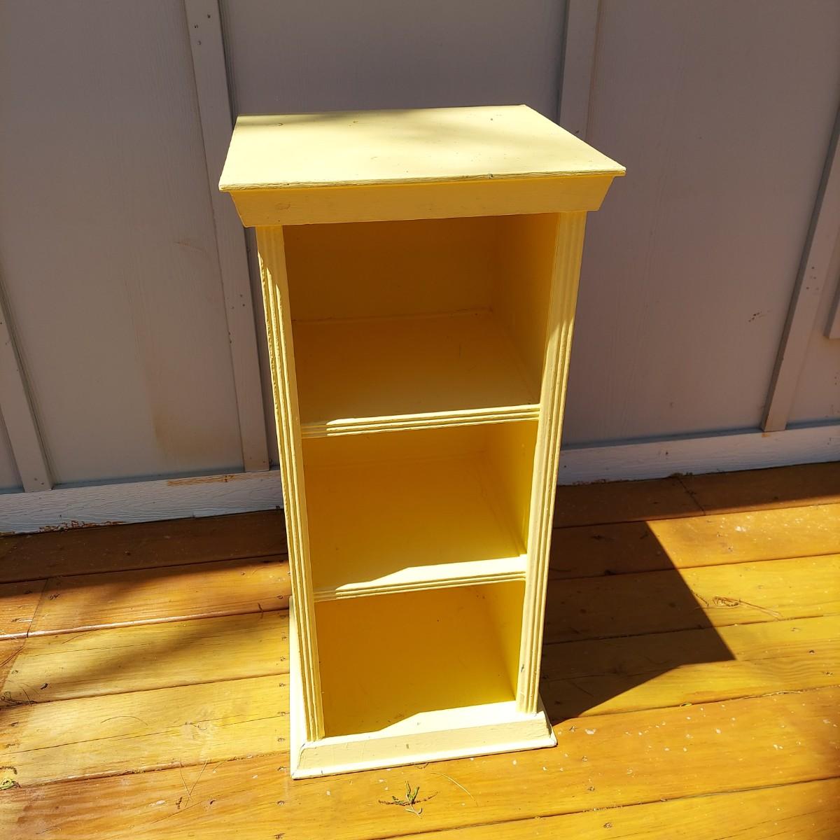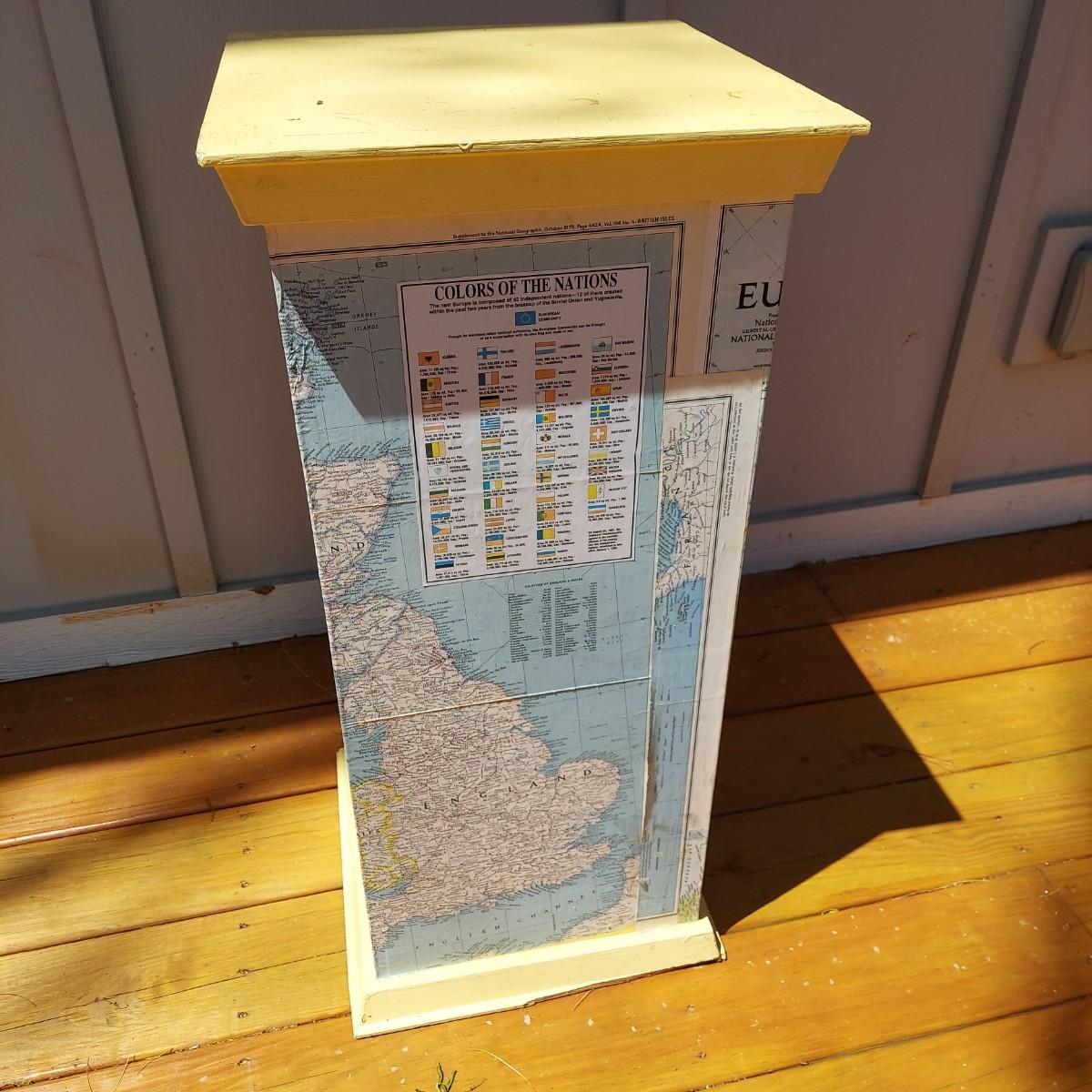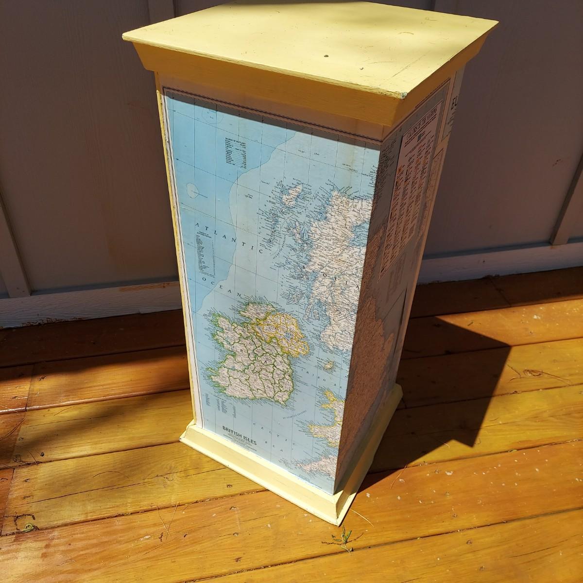 Small wood shelf. Painted yellow with Map of British Isles wrapped around the back. Measures approximately 14 x 14 x 30"H. Local Pickup Only.