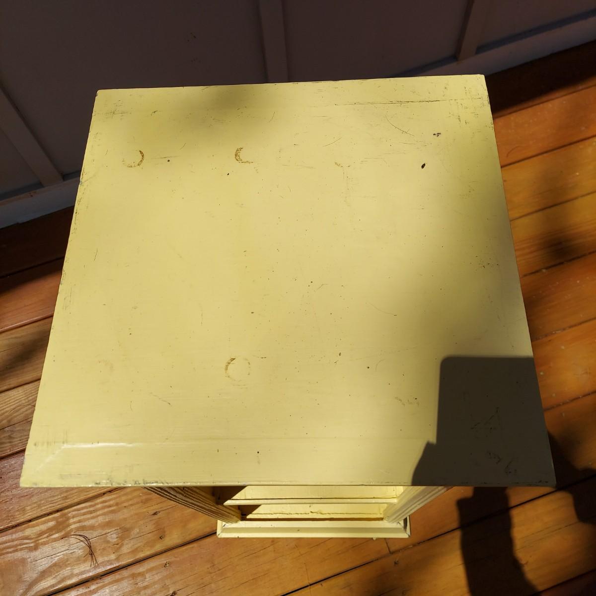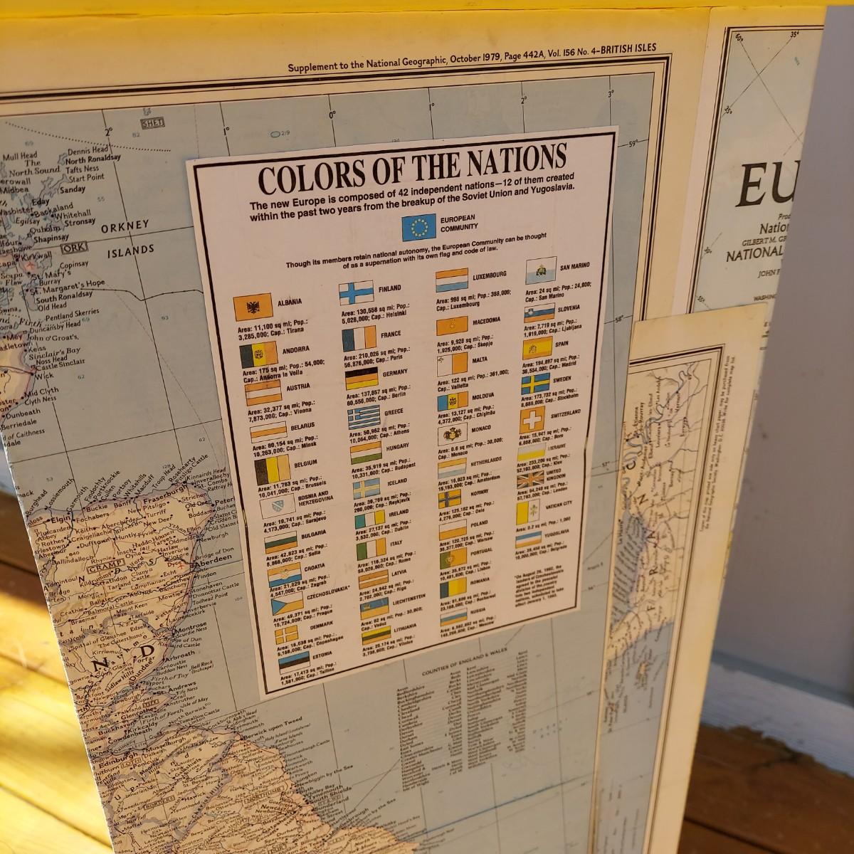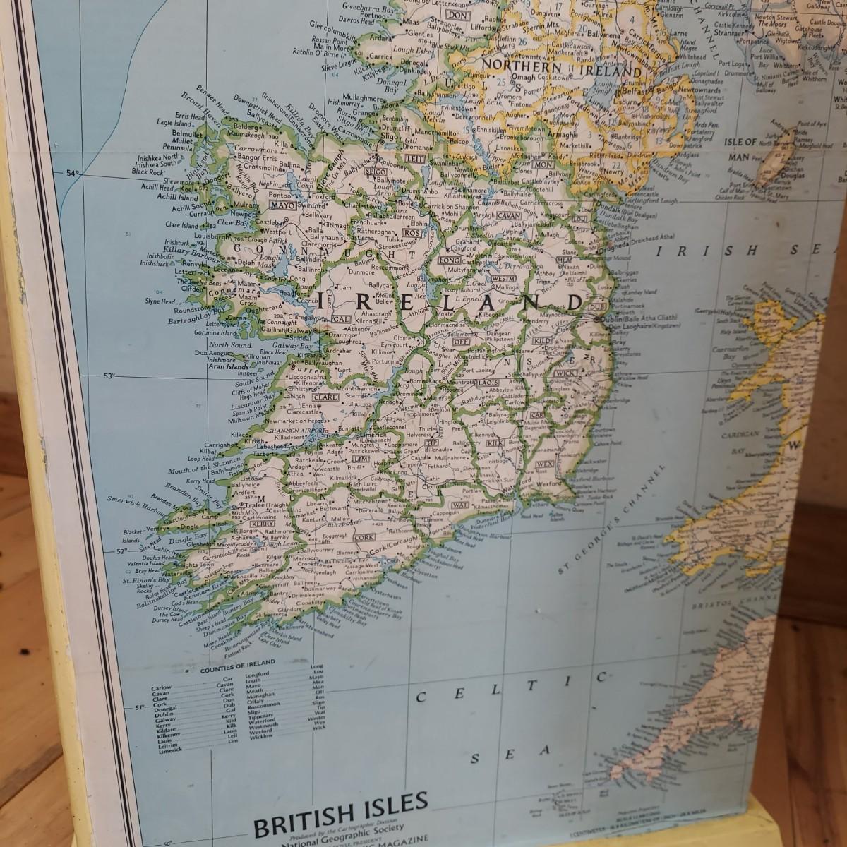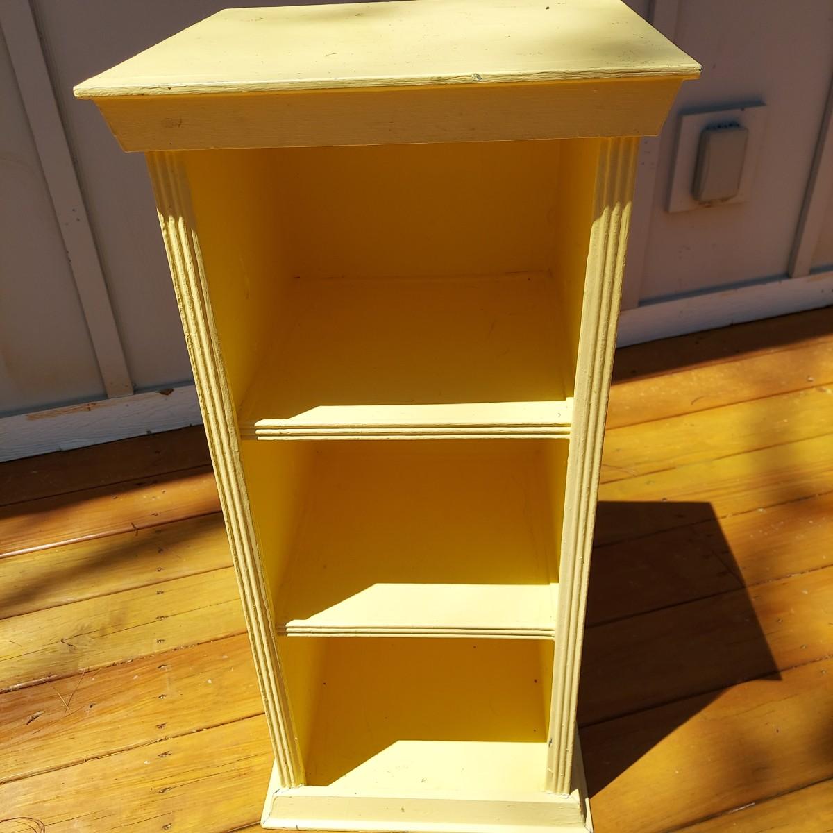 Small wood shelf. Painted yellow with Map of British Isles wrapped around the back. Measures approximately 14 x 14 x 30"H. Local Pickup Only.
