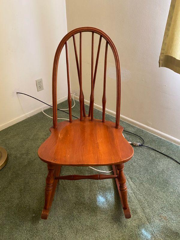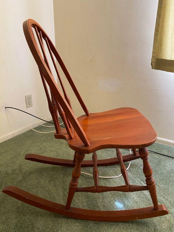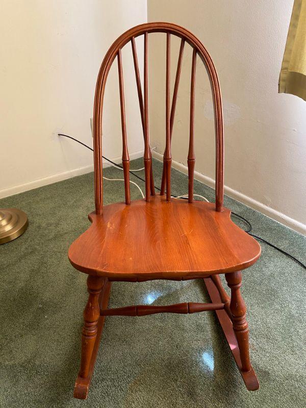 Small youth/child spindle back rocking chair. Good vintage condition. About 32" at top of back. Light signs of age and use.