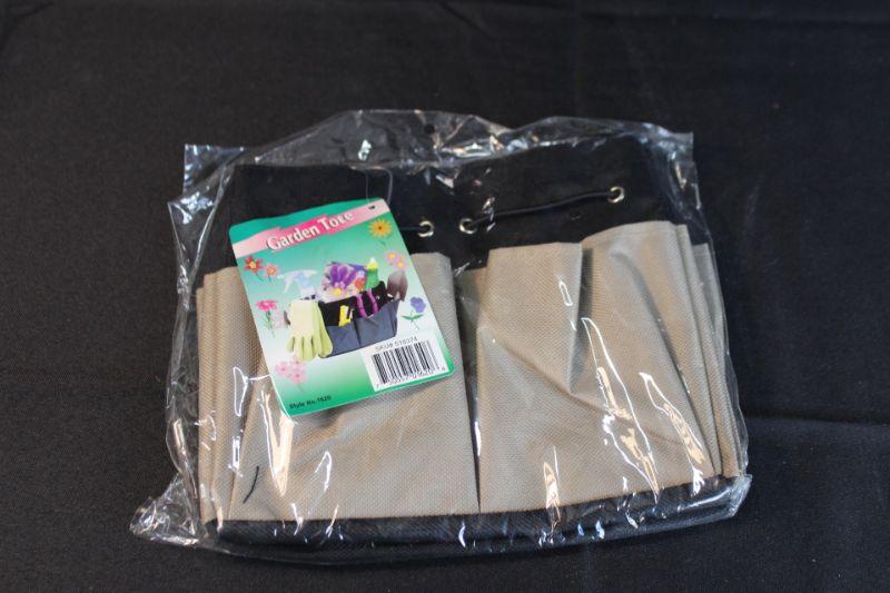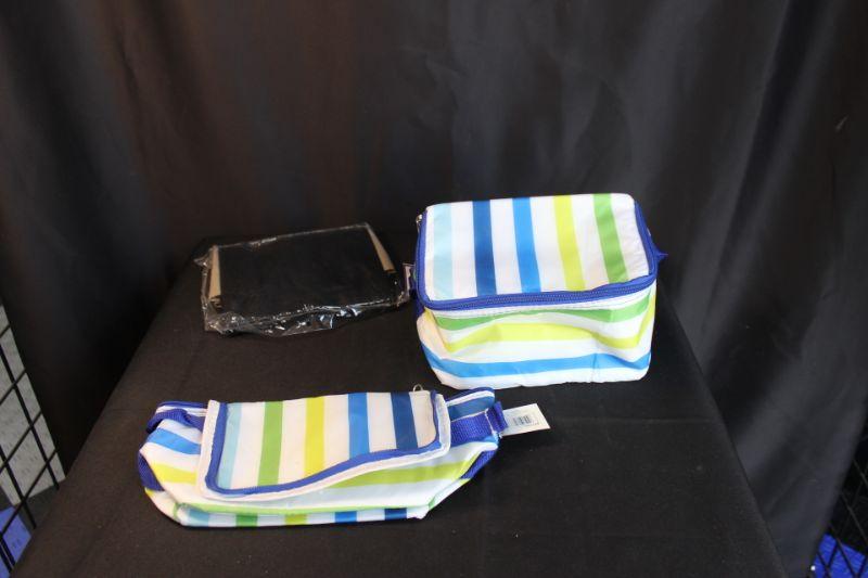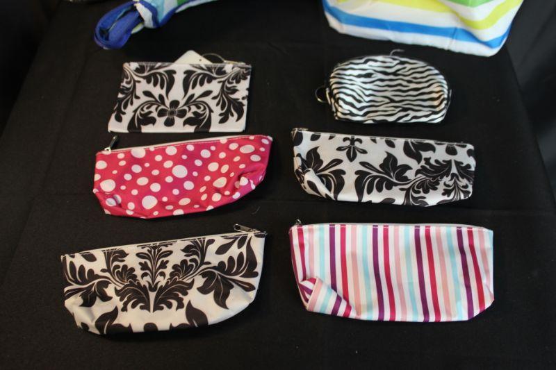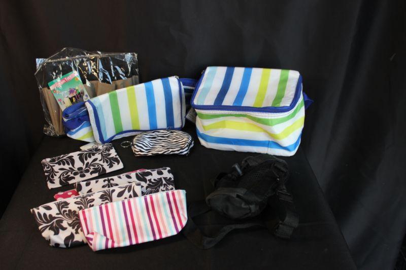 Lot of different zipper totes. The 2 blue striped totes are insulated lunch totes. There is a waterbottle tote with shoulder strap. 6 small zipper bags. One small garden tool bag still in plastic.