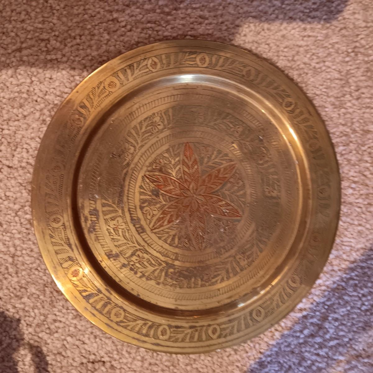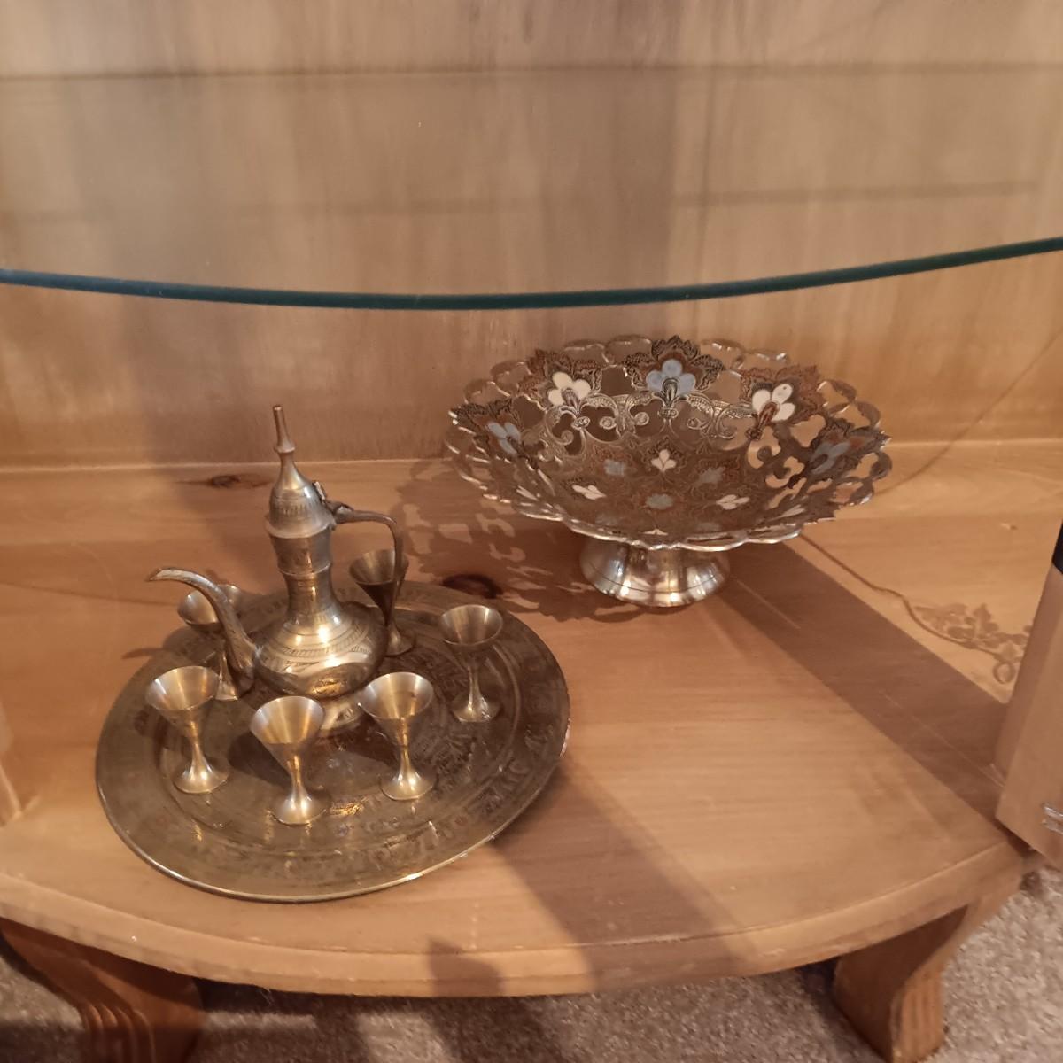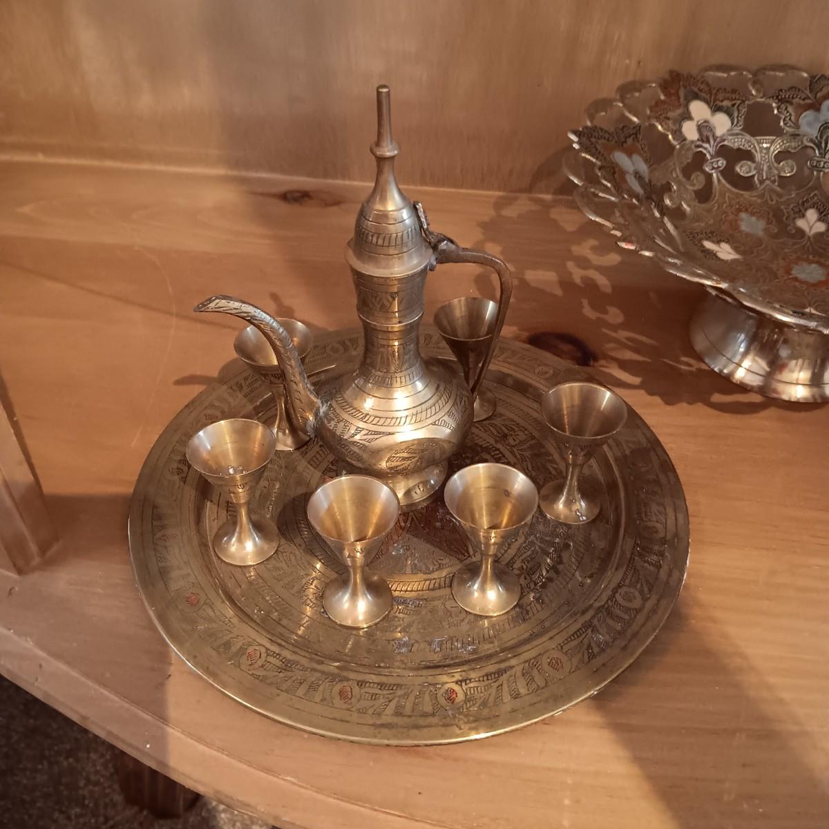 SMALLER BRASS DECANTER AND STEMMED CUPS ON A BRASS TRAY PLUS A COLORIZED BRASS BOWL